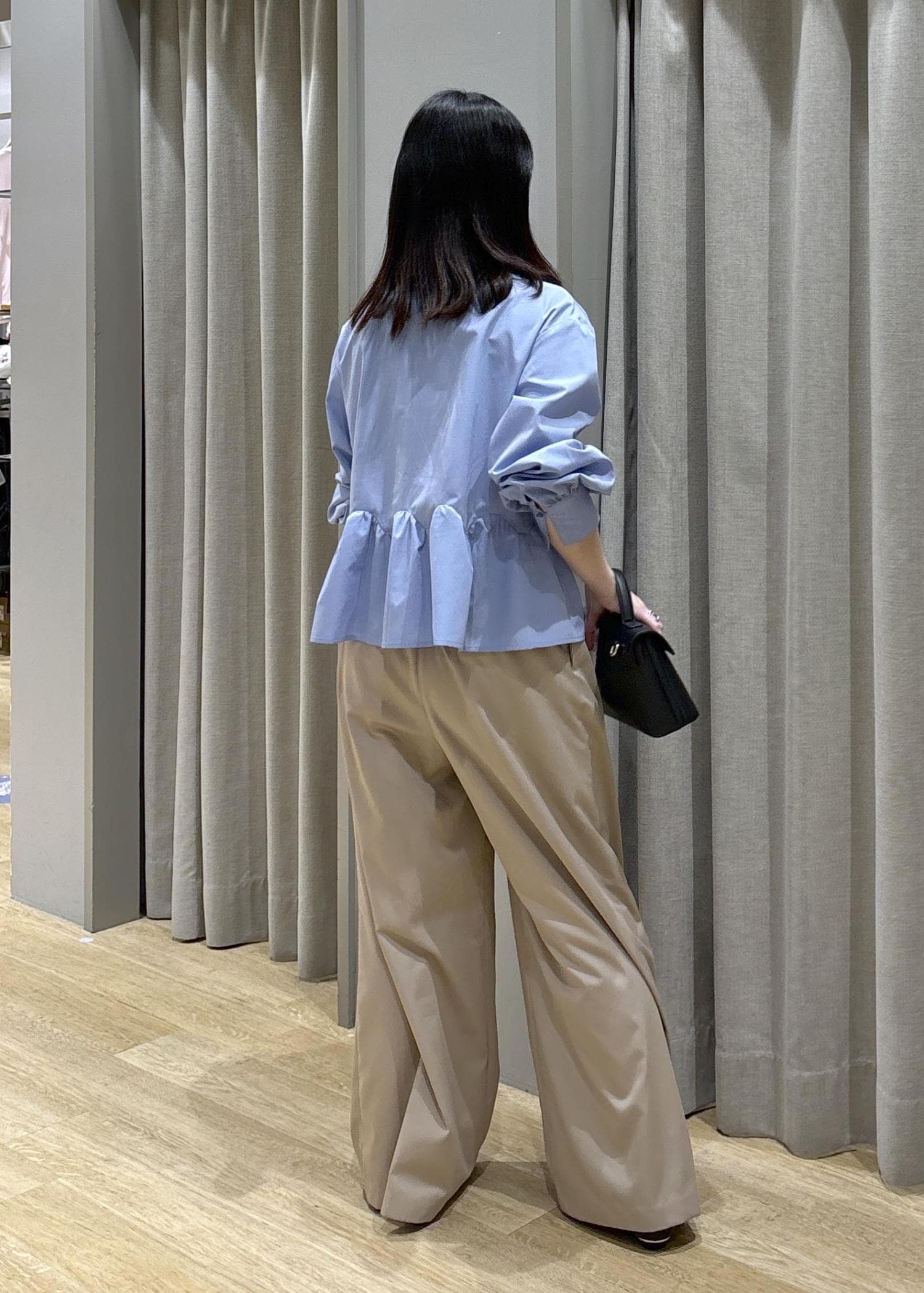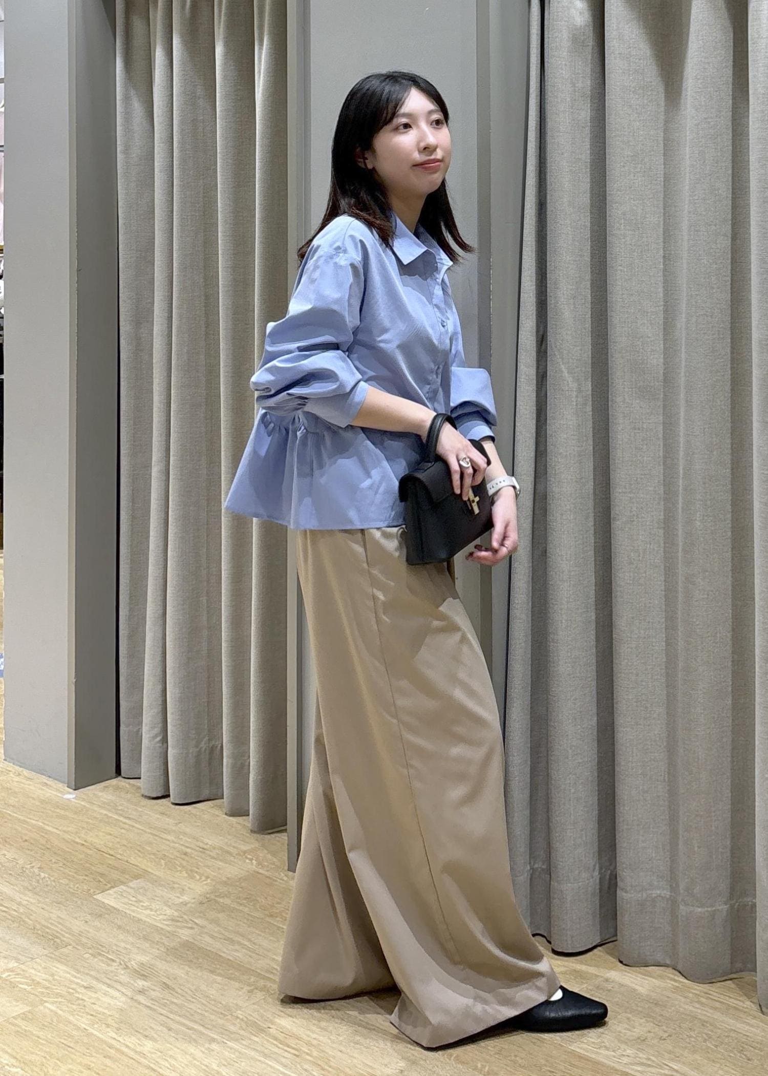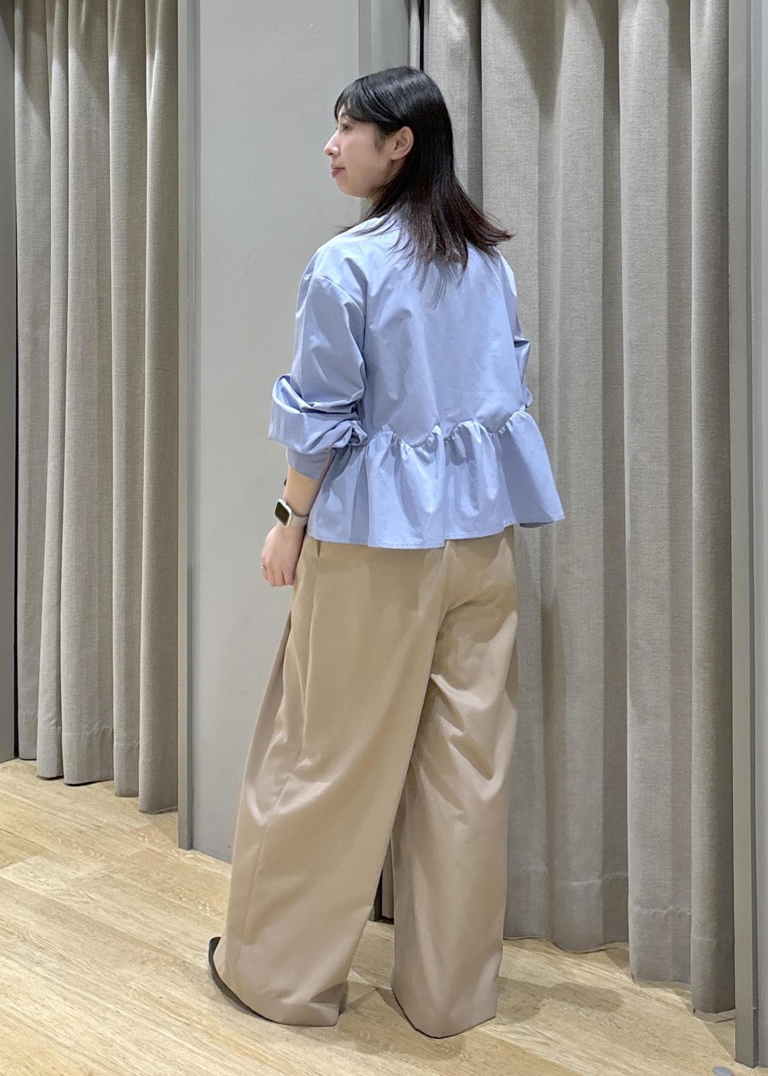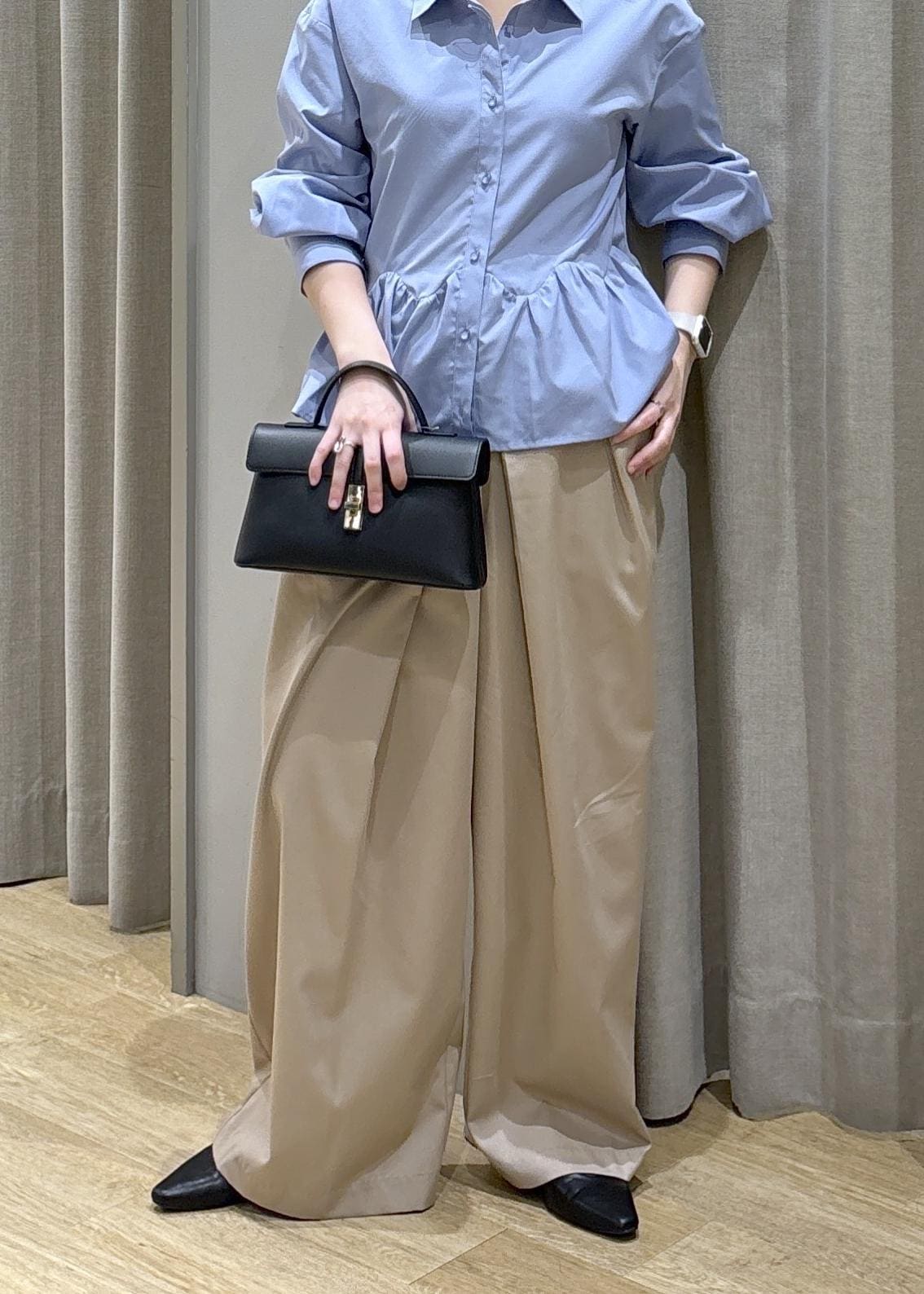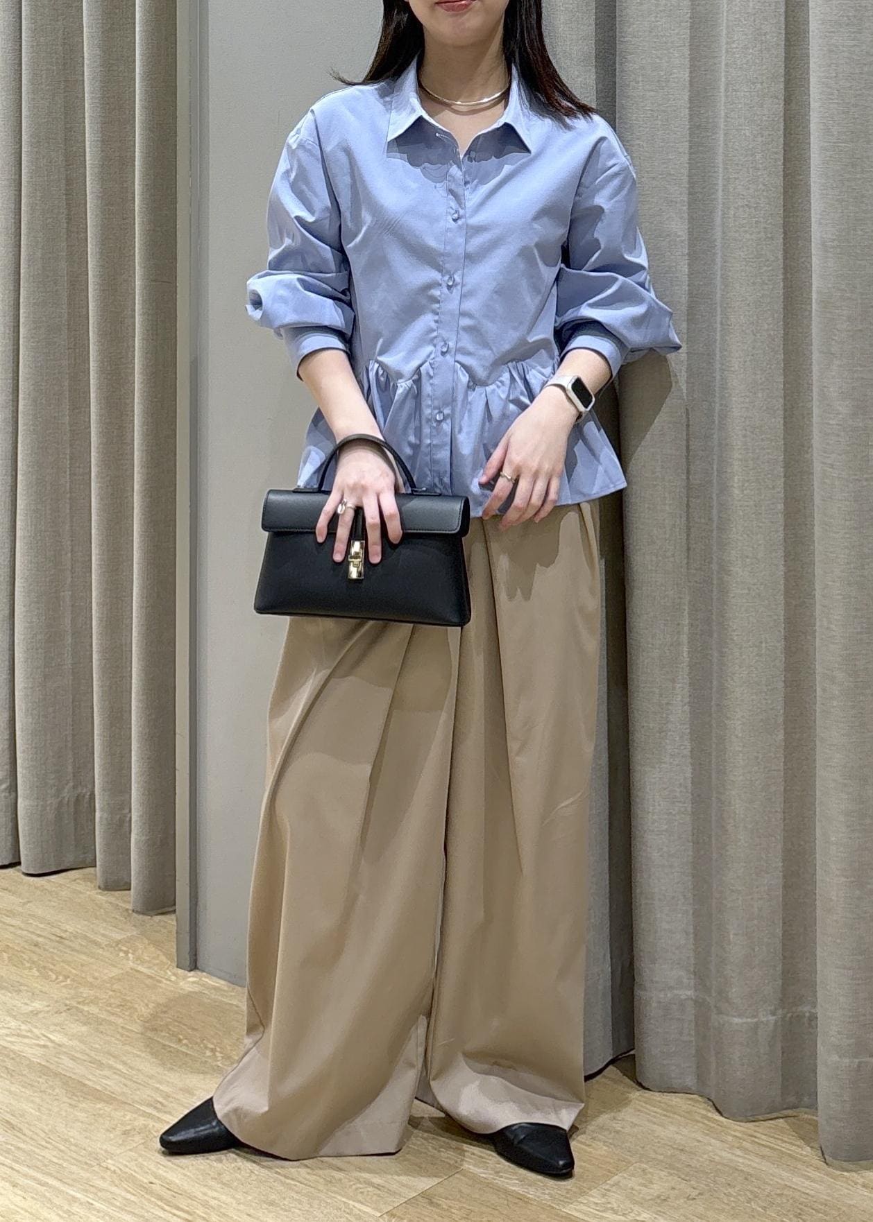 腰周りがふんわりするペプラムシャツなので体型カバーできます!