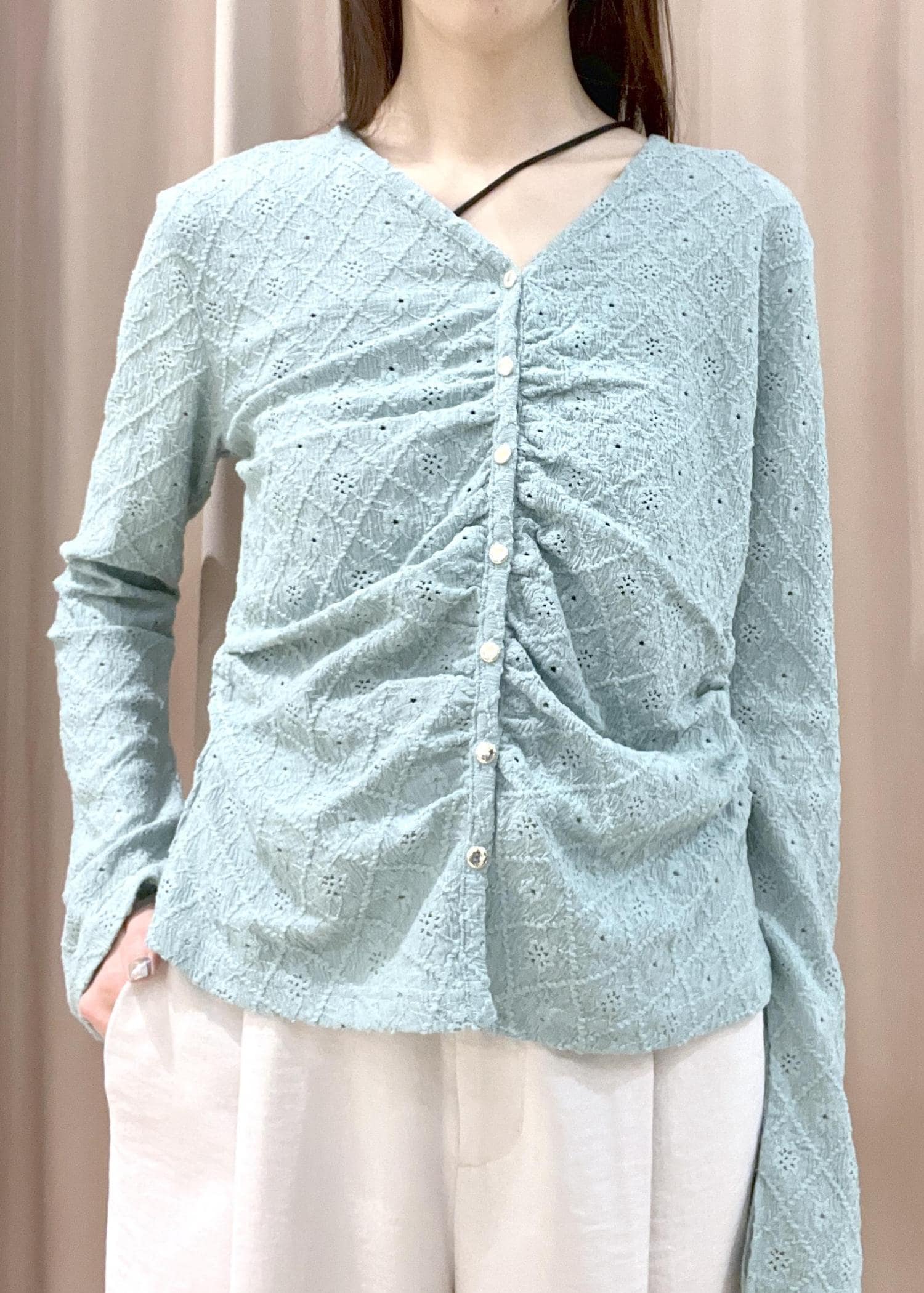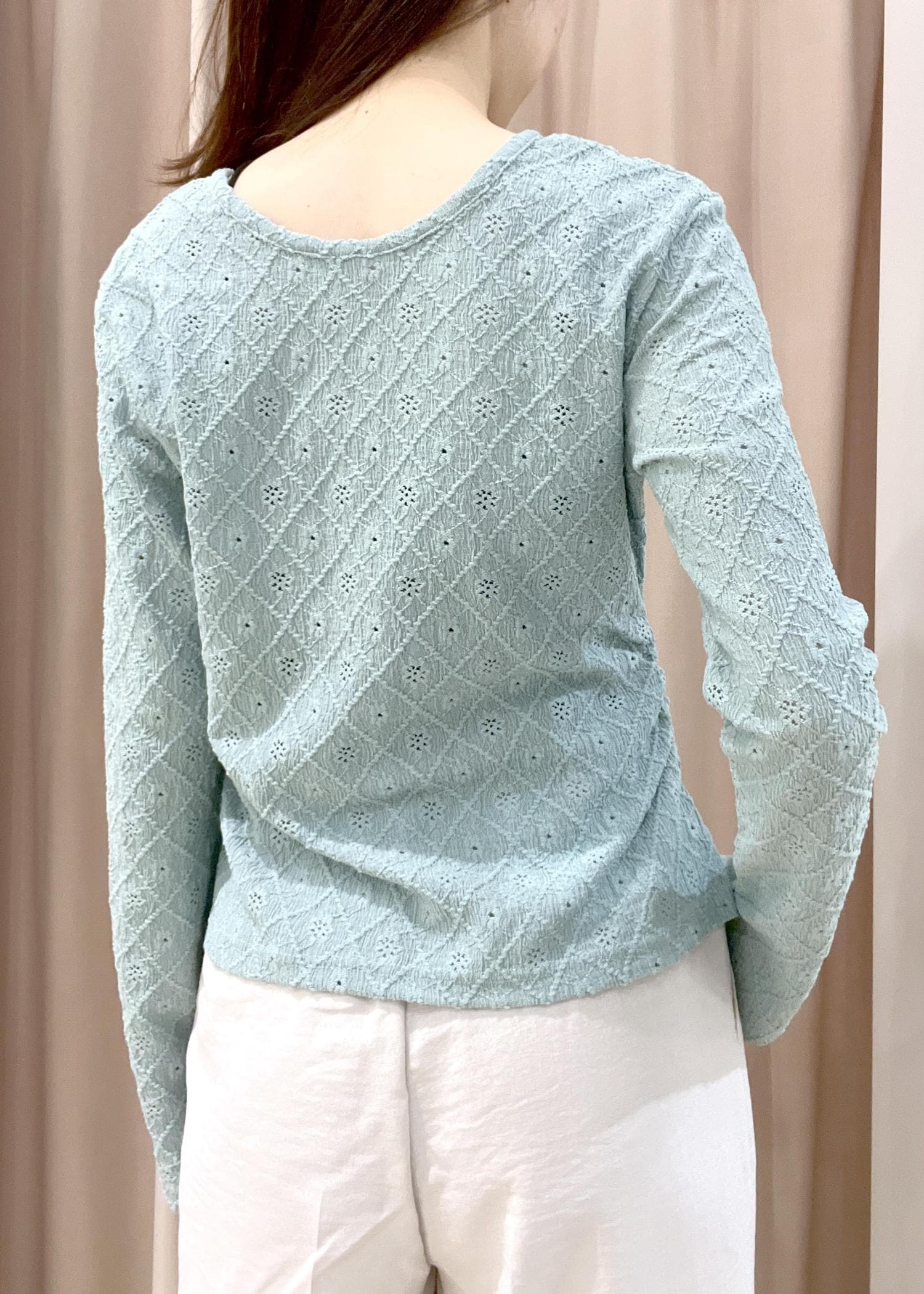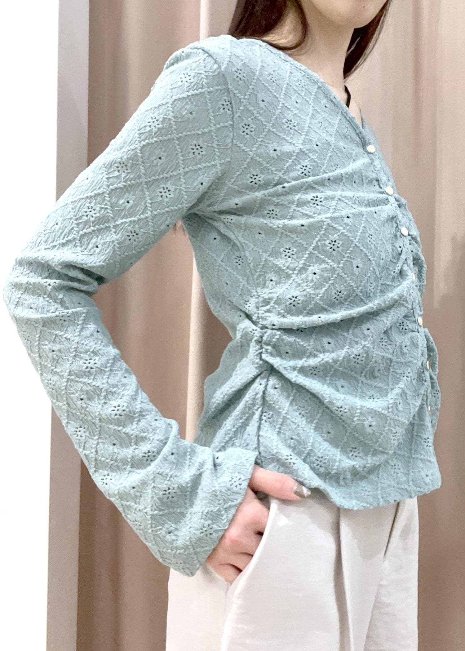 袖は少し長めで、ギャザーデザインで体にフィットする着心地です。 -