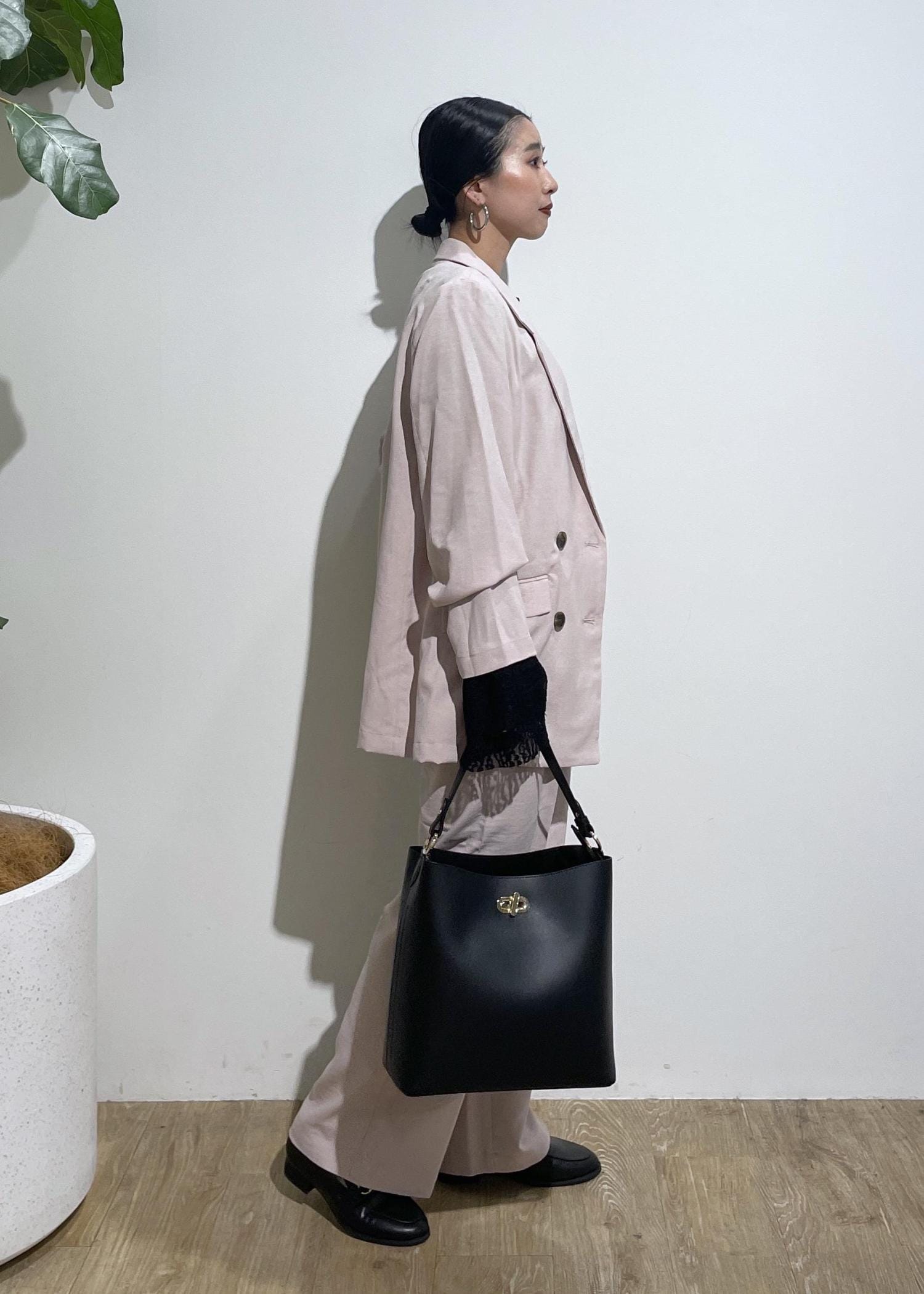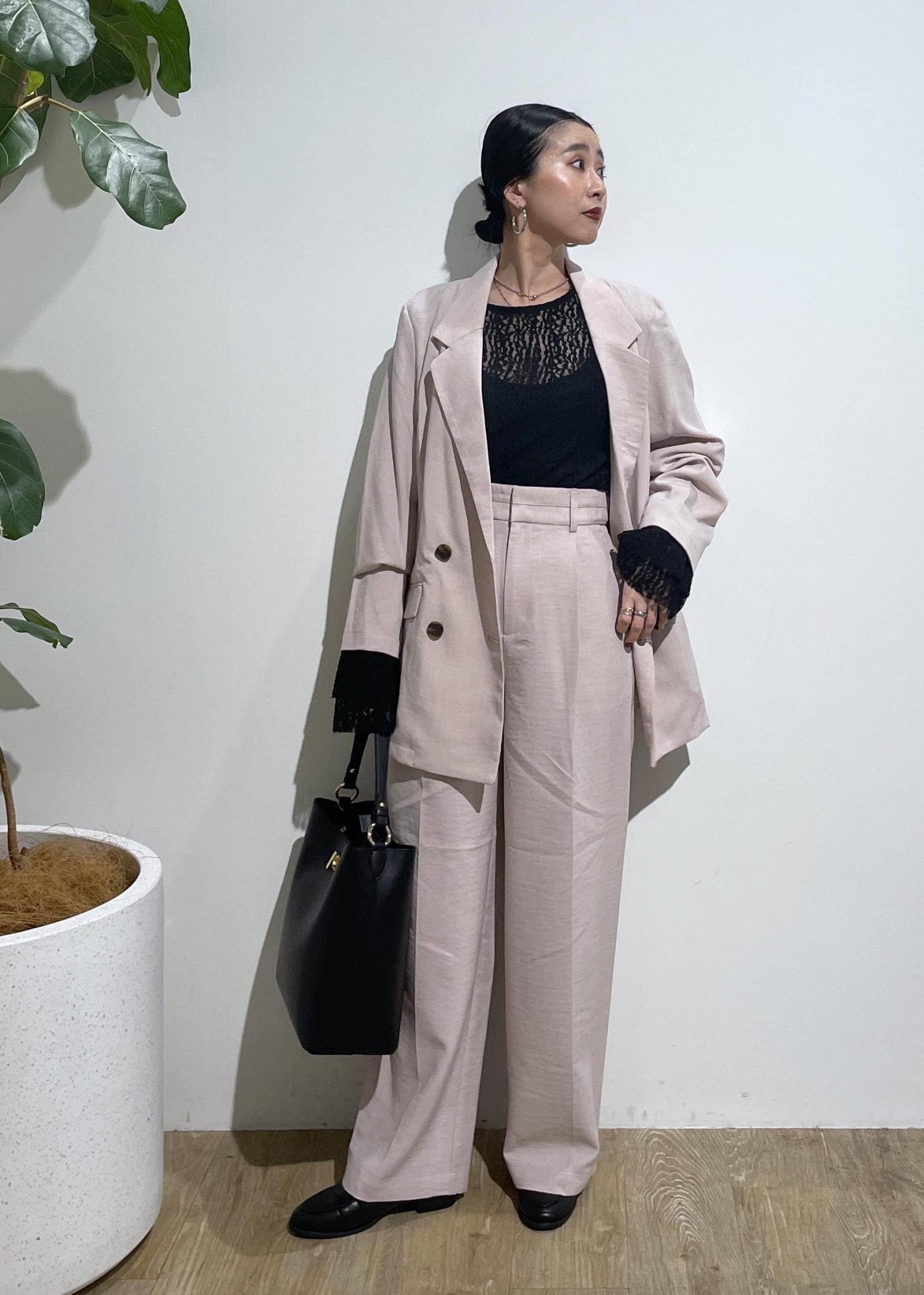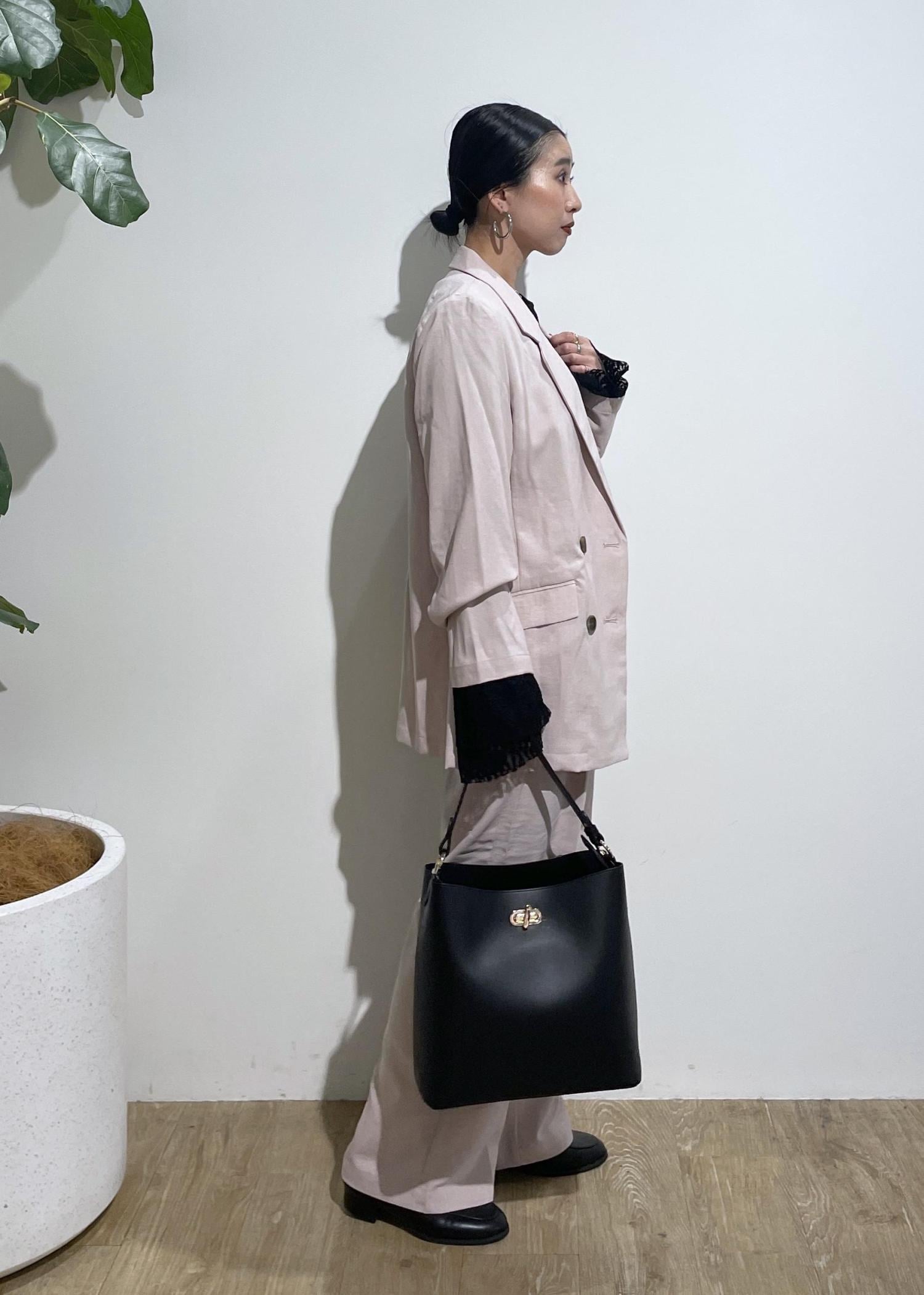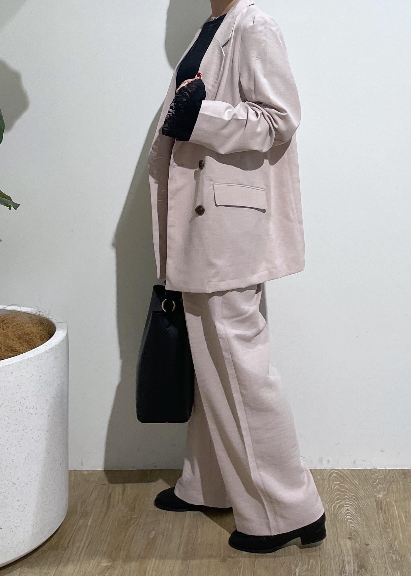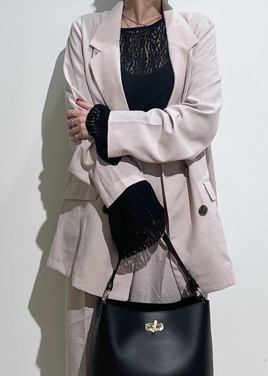セットアップは、1セットもっているとコーデの幅が広がり便利です。今回は、ピンクのセットアップ着用しましたが使いやすいピンクで挑戦してみたい方にもおすすめ。