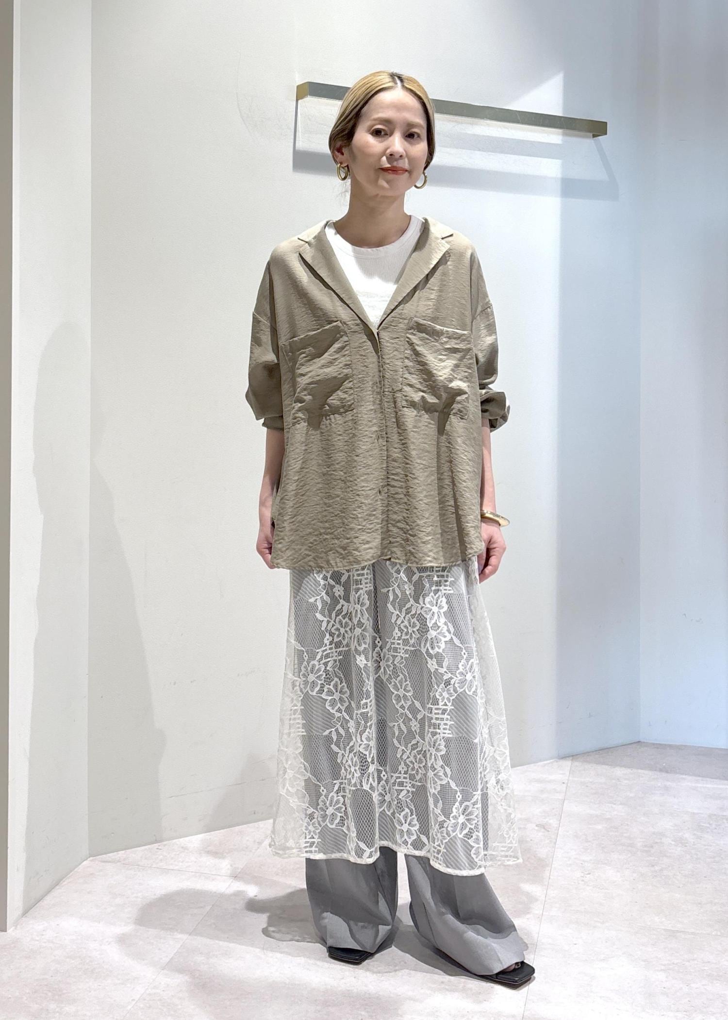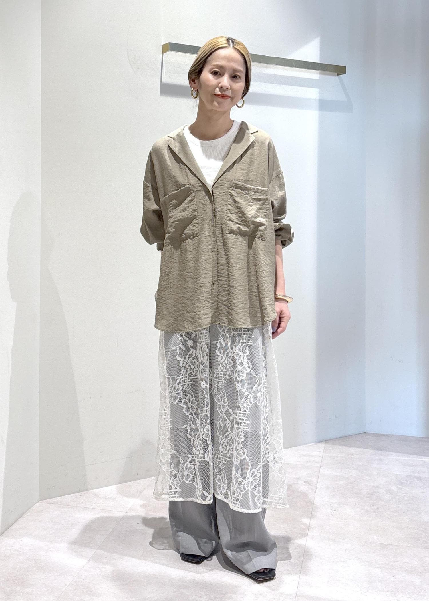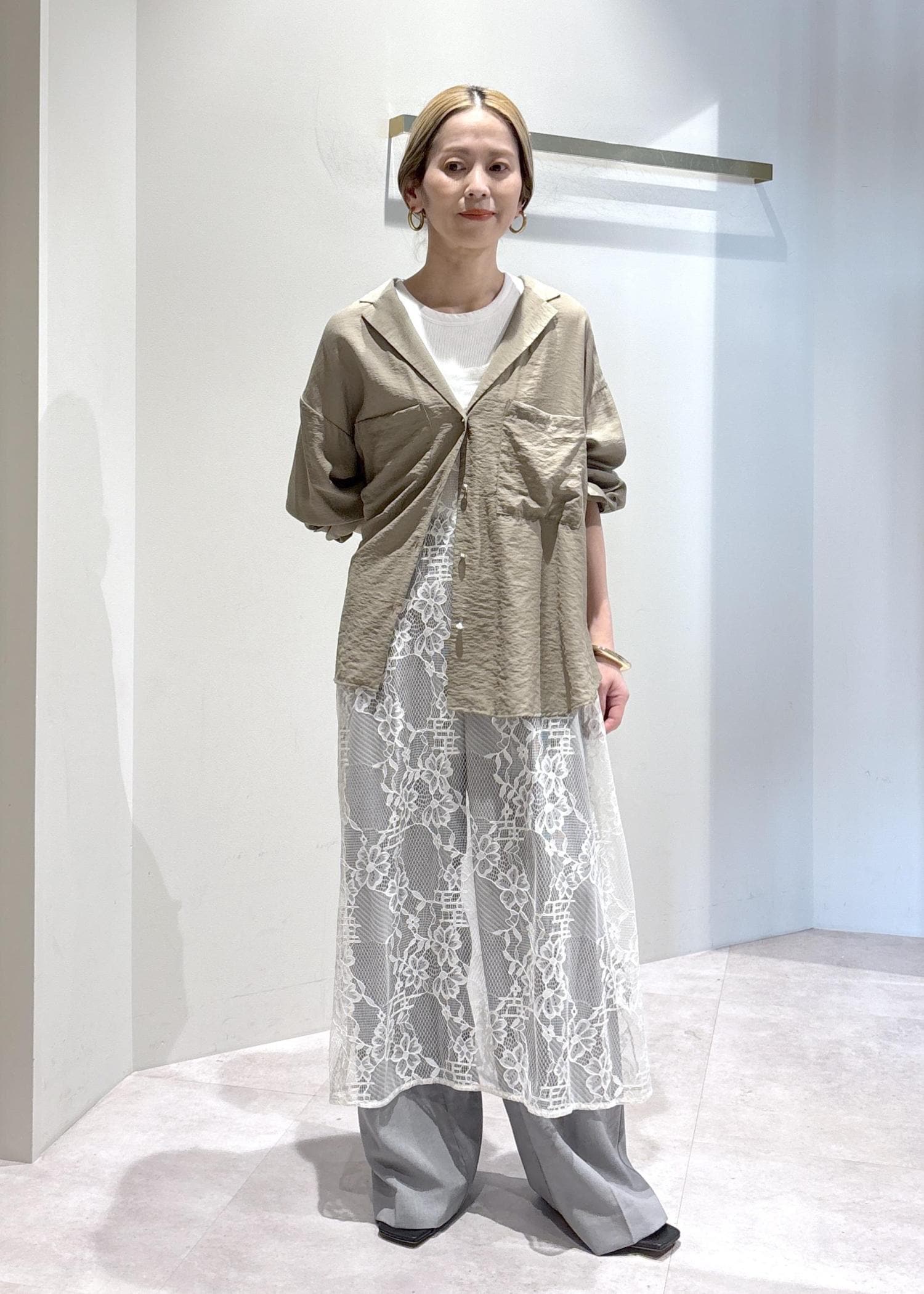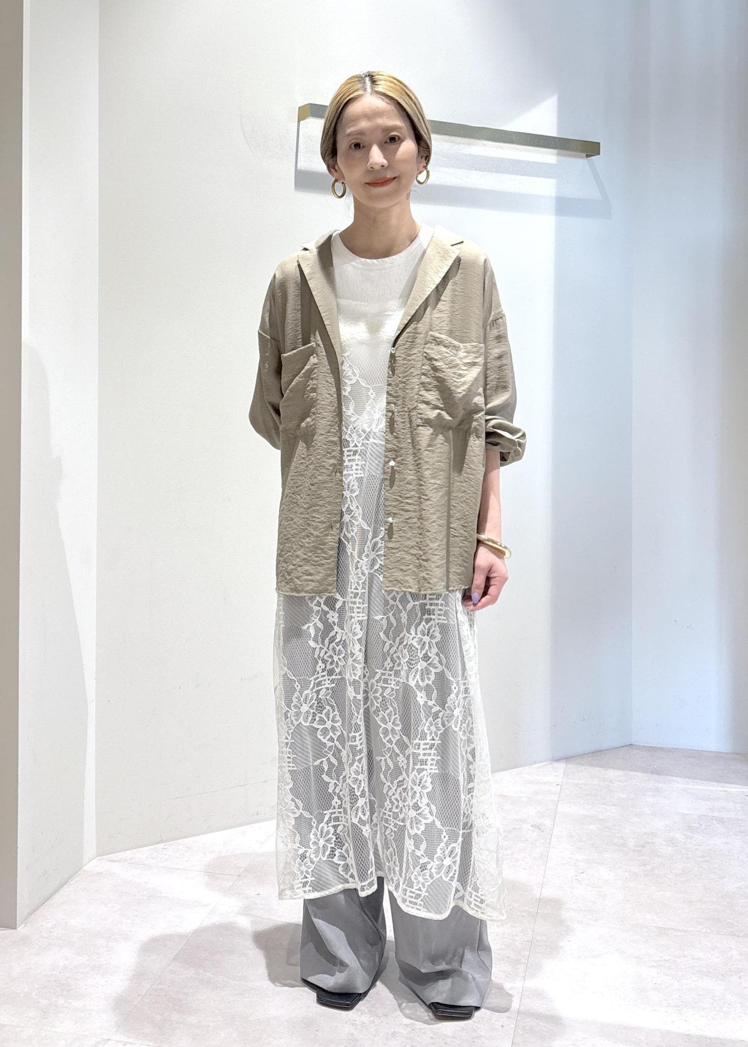 シャツジャケットに、レースワンピースを合わせたレイヤードスタイルです。