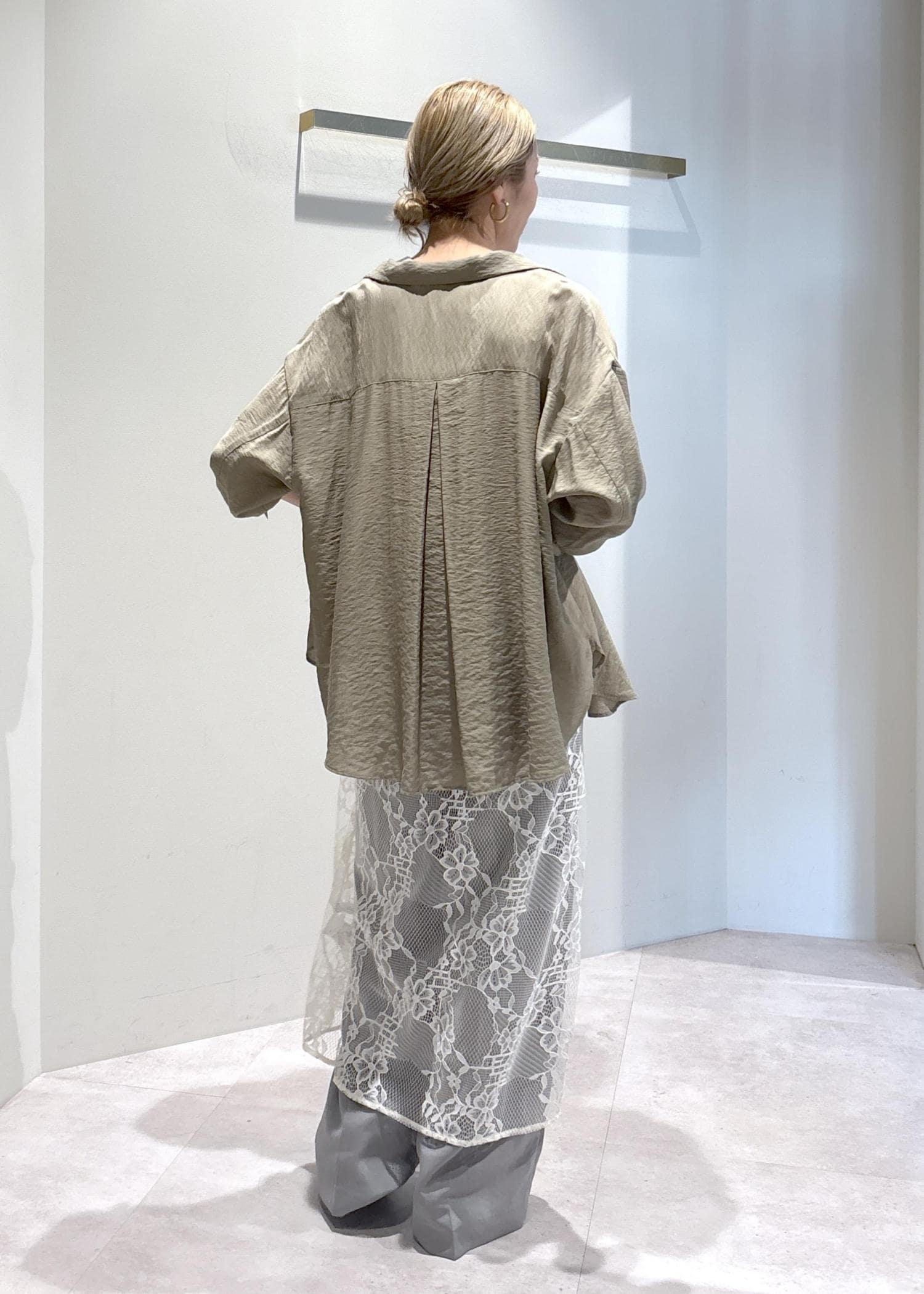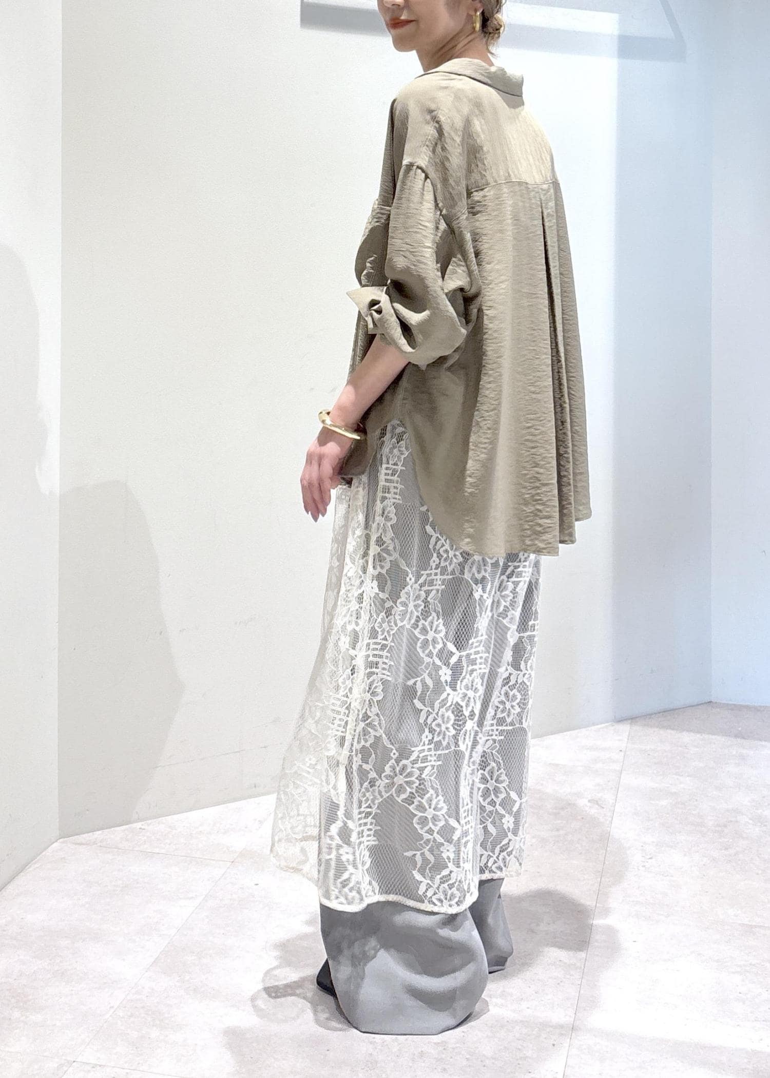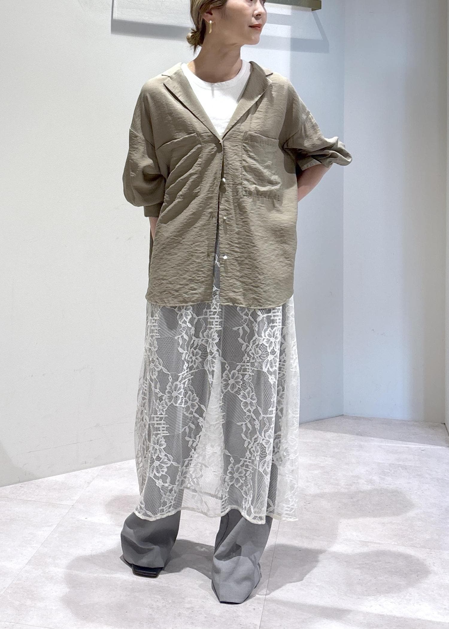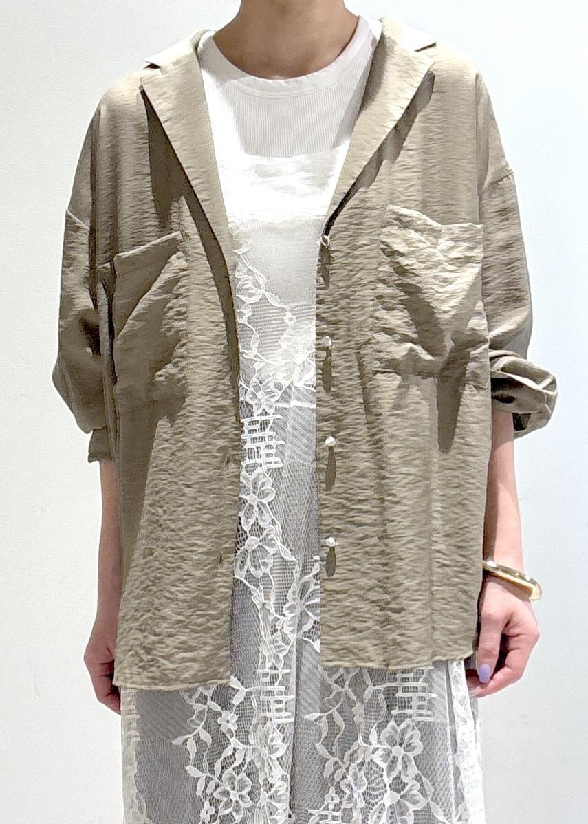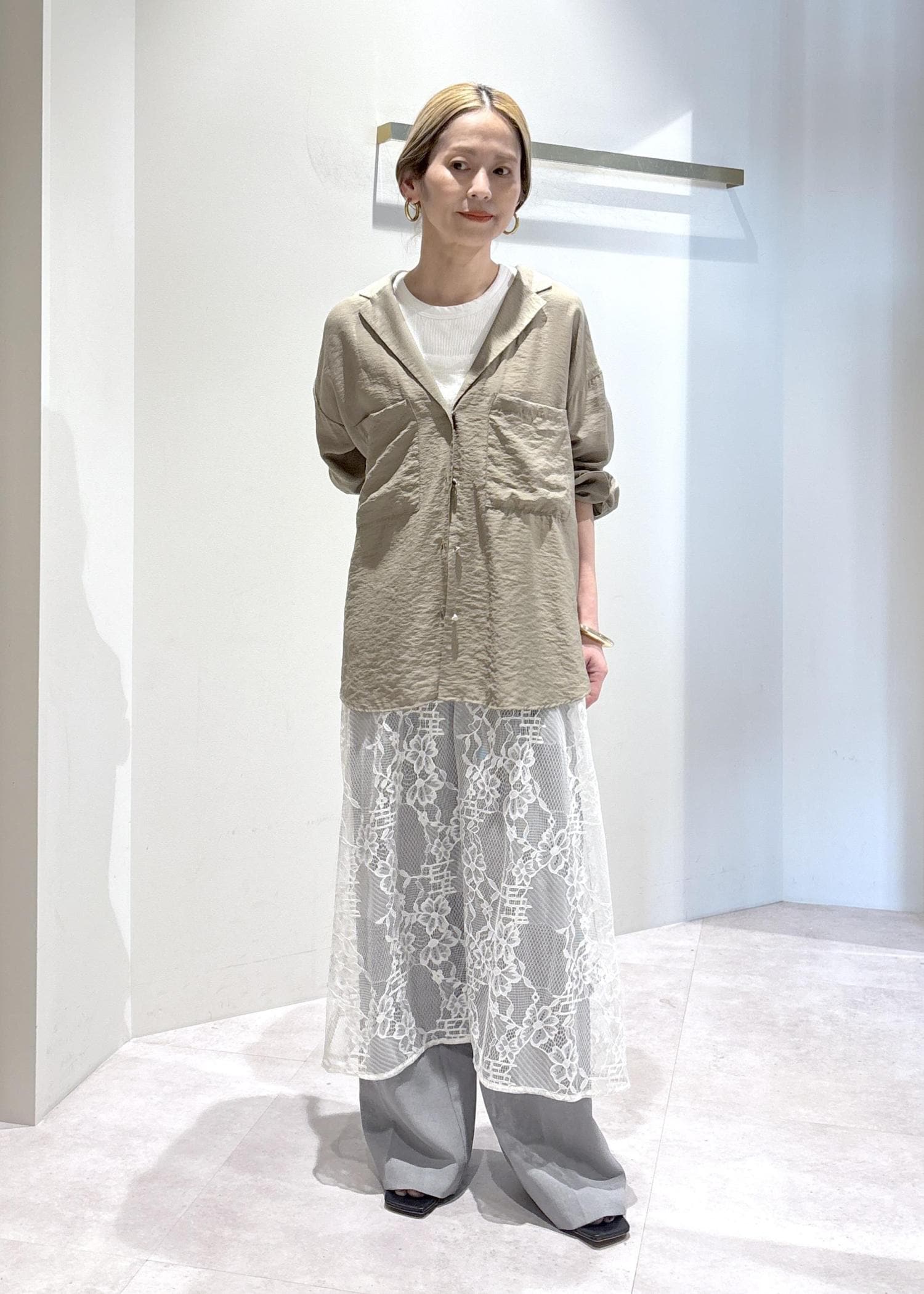 シャツジャケットに、レースワンピースを合わせたレイヤードスタイルです。