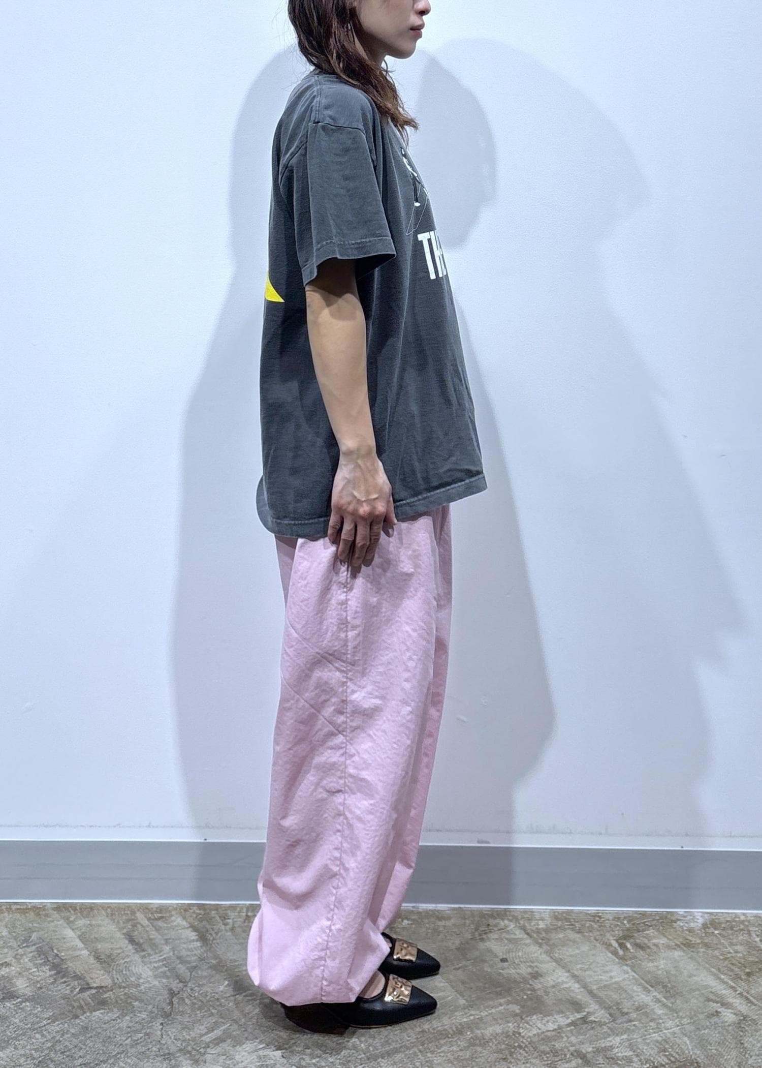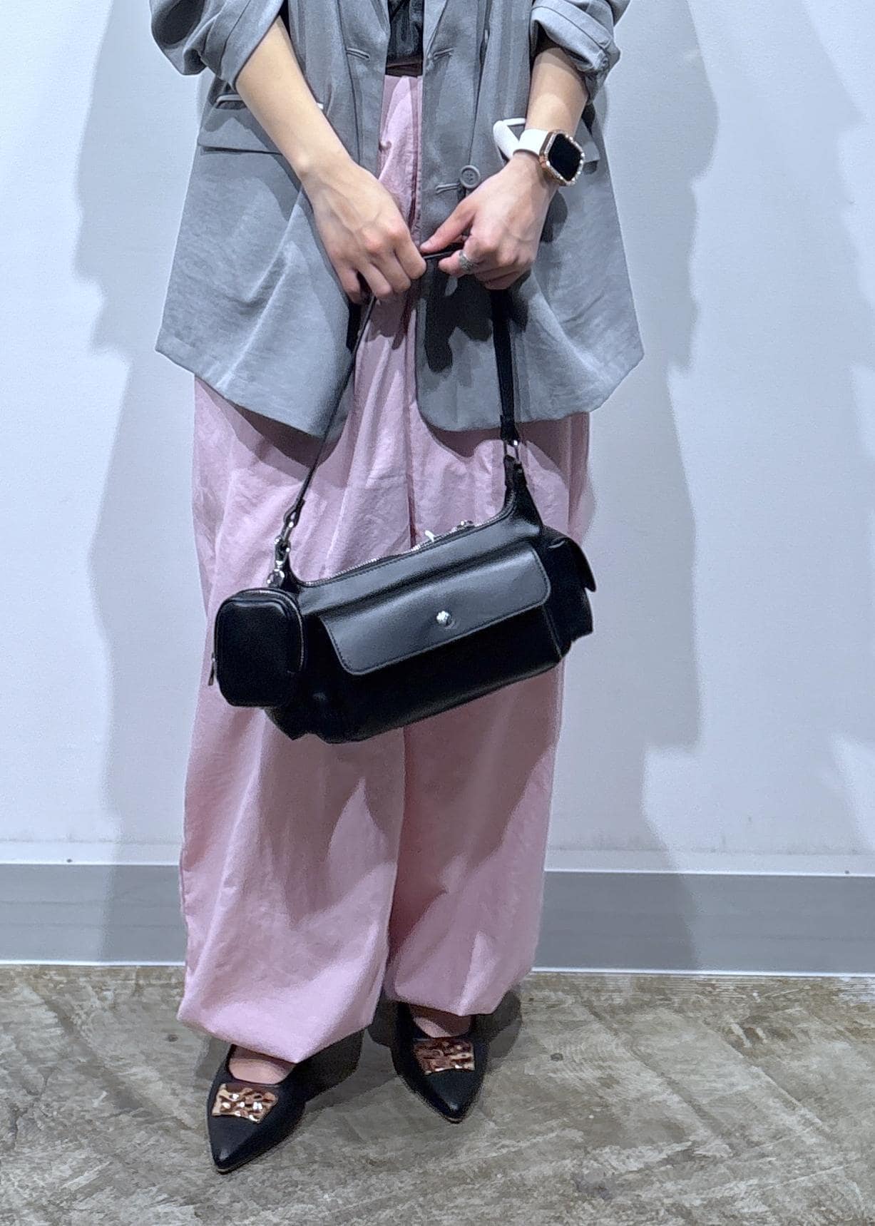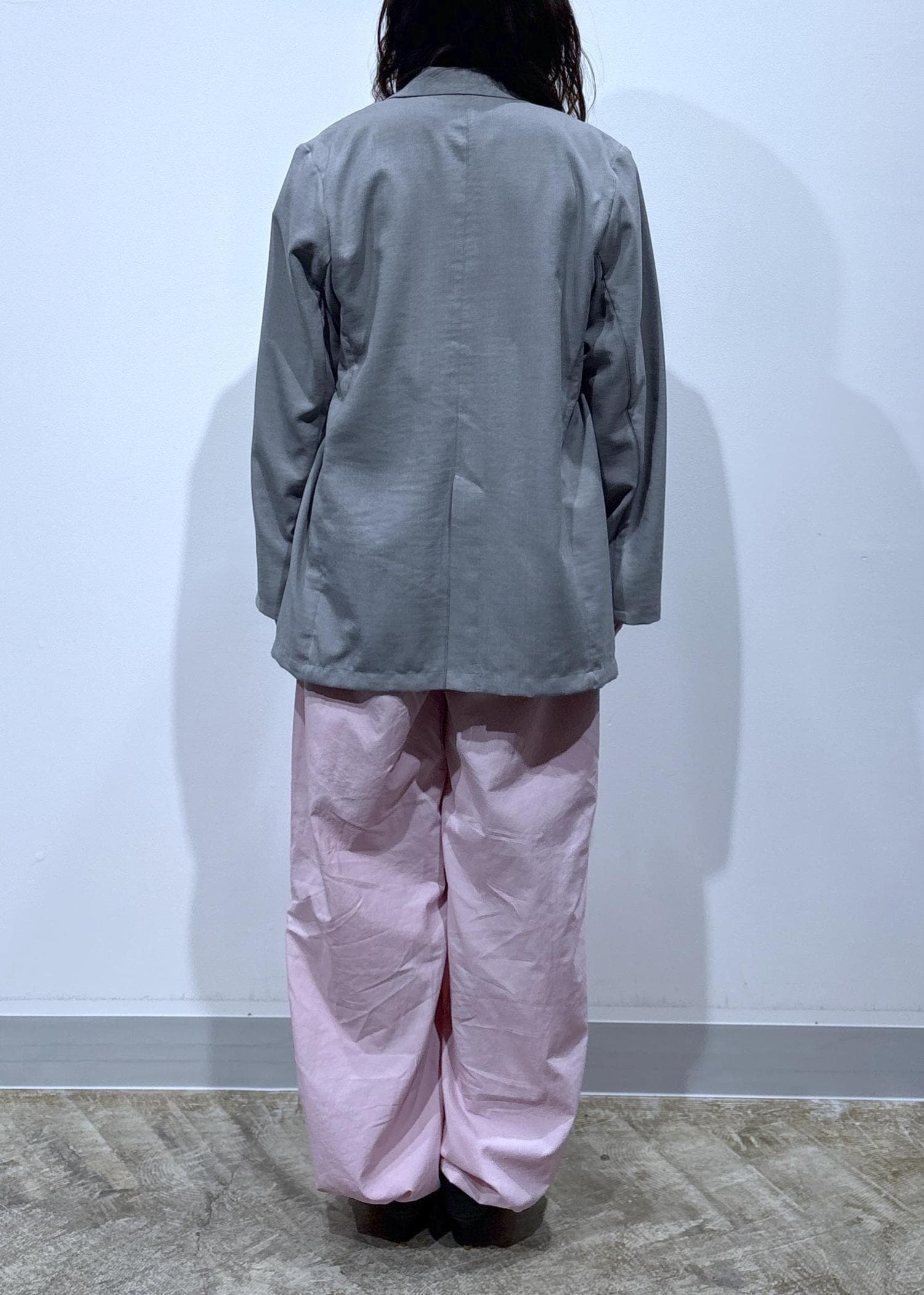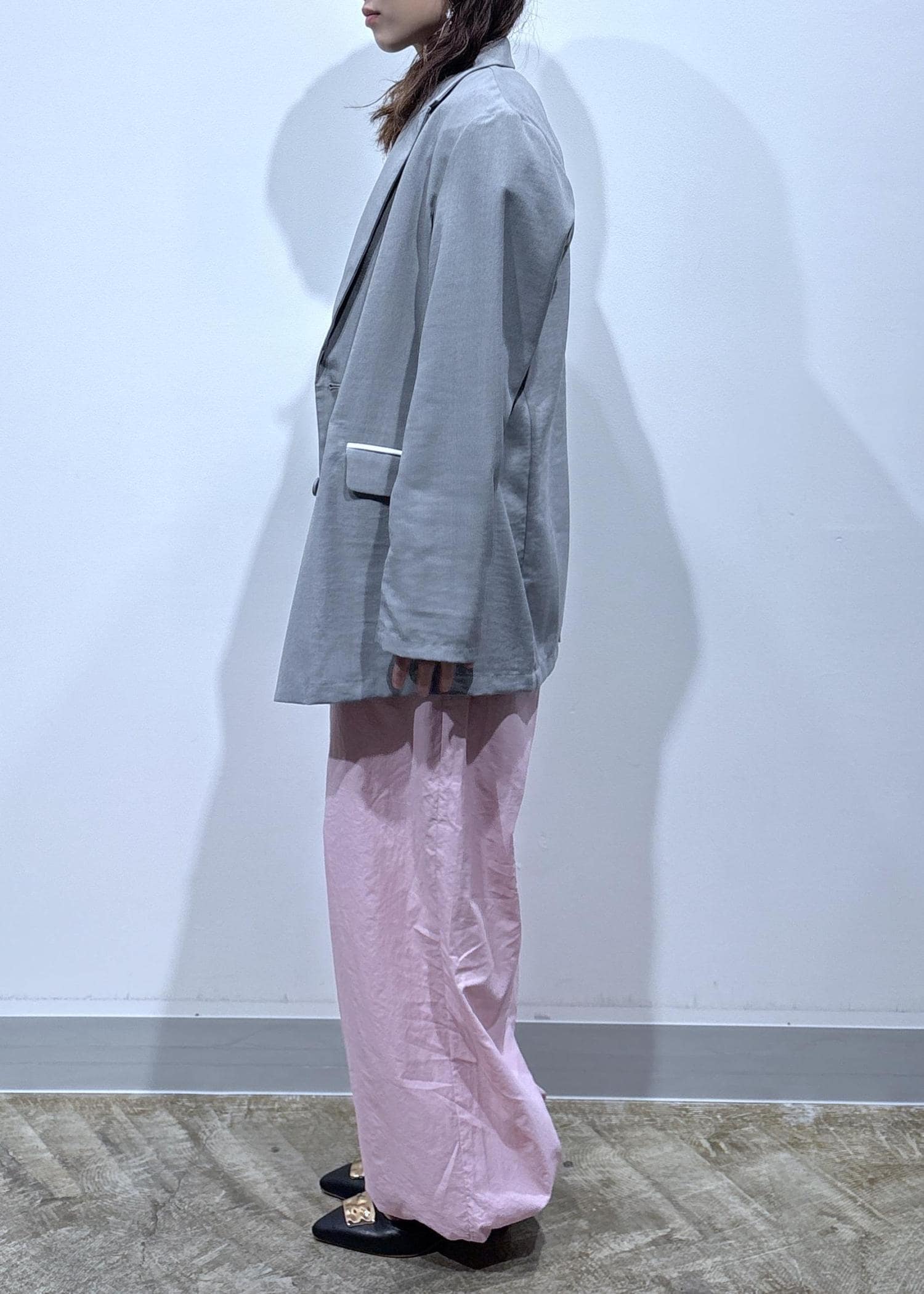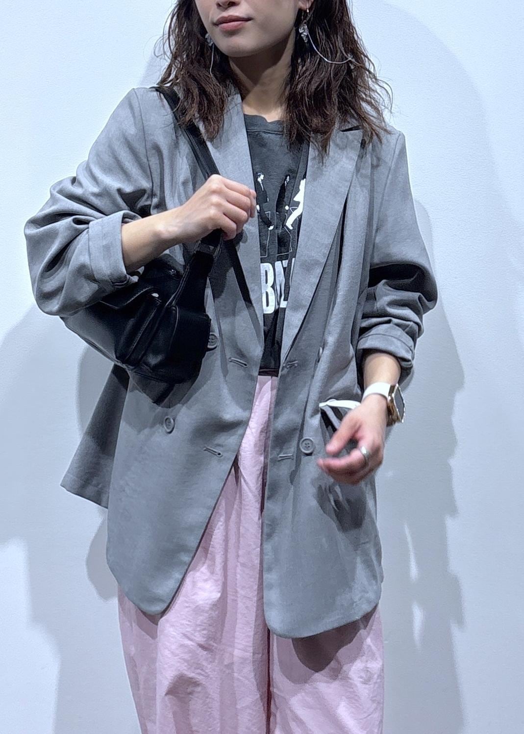 ピンクのボトムにグレーを合わせて甘さを抑え、