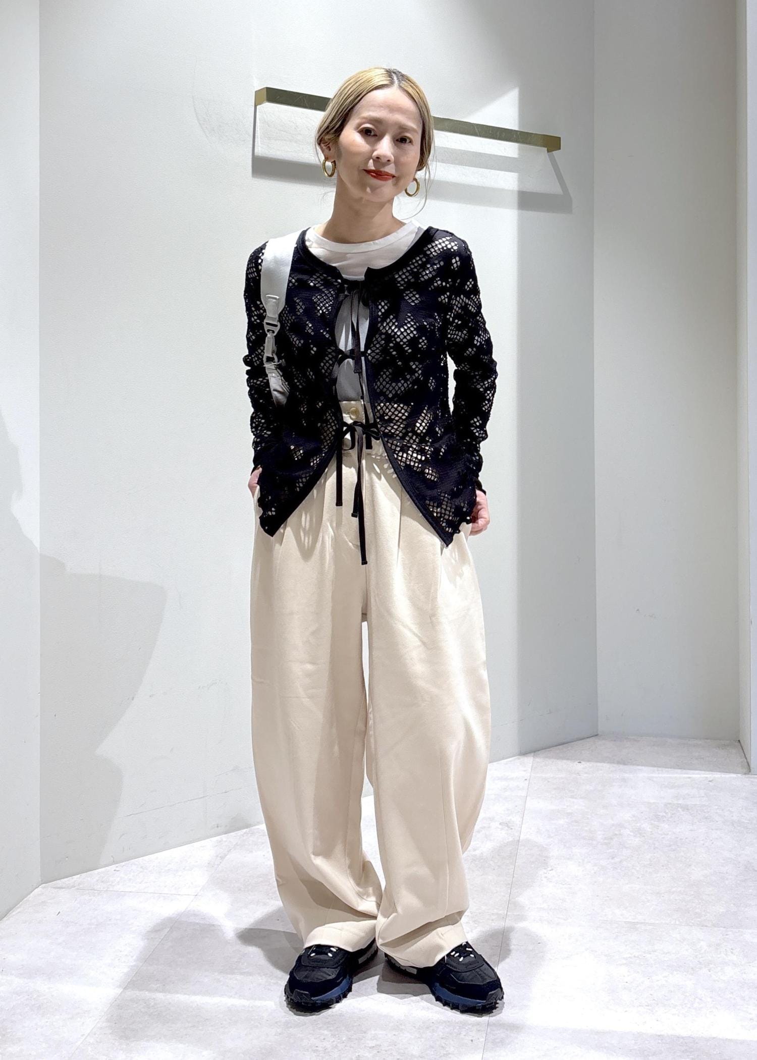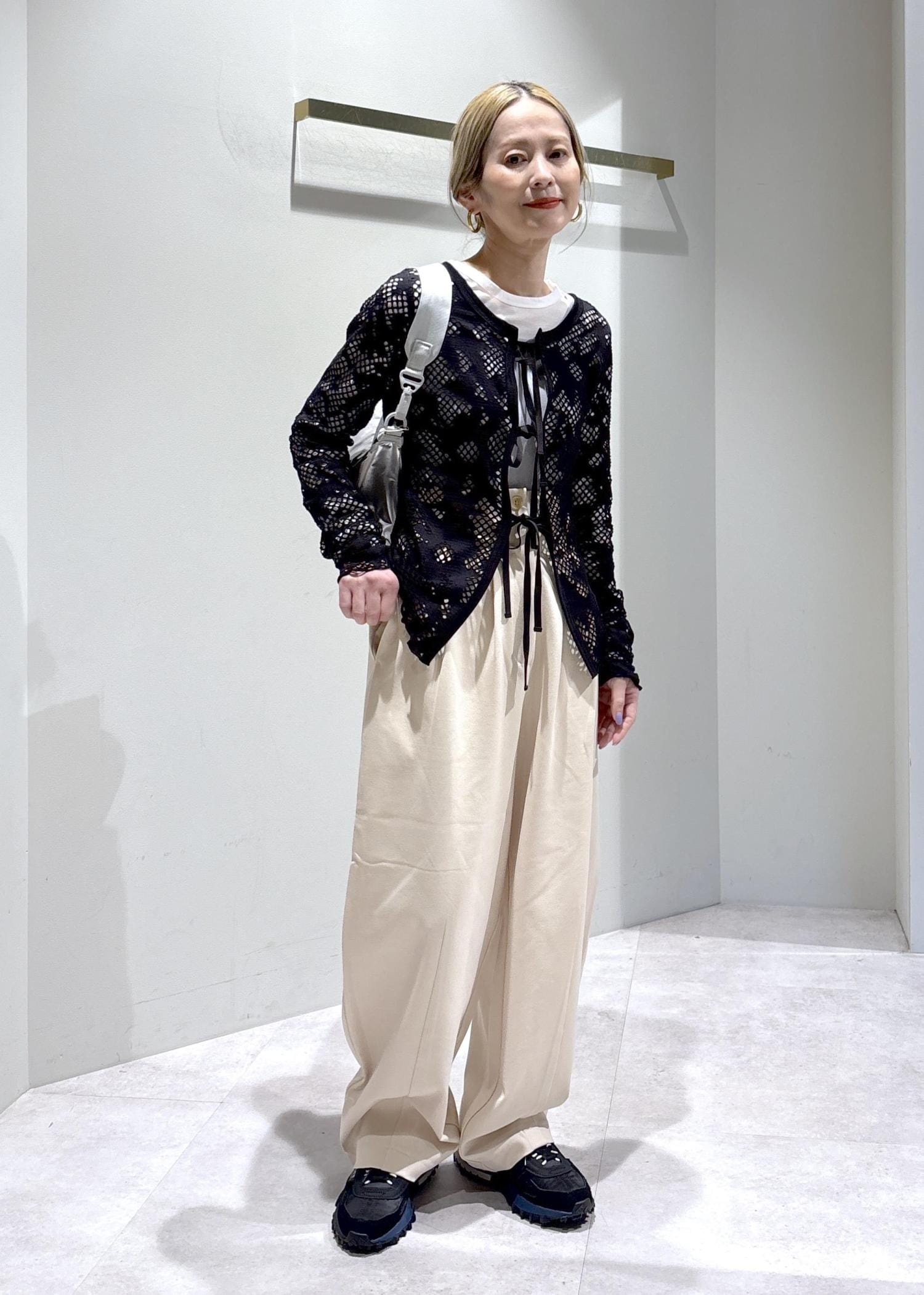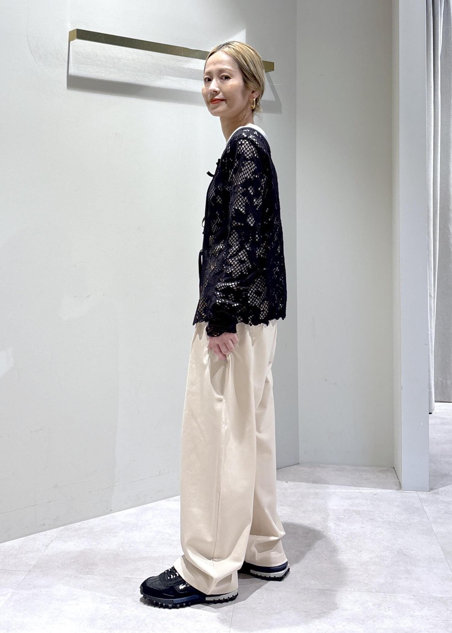 レースが女性らしさを引き立てつつ、インナーやスニーカーで程よくカジュアルダウンすることで、甘くなりすぎないバランスに仕上げました。
