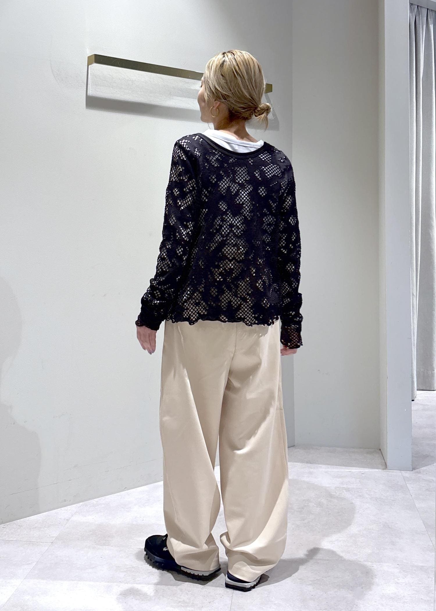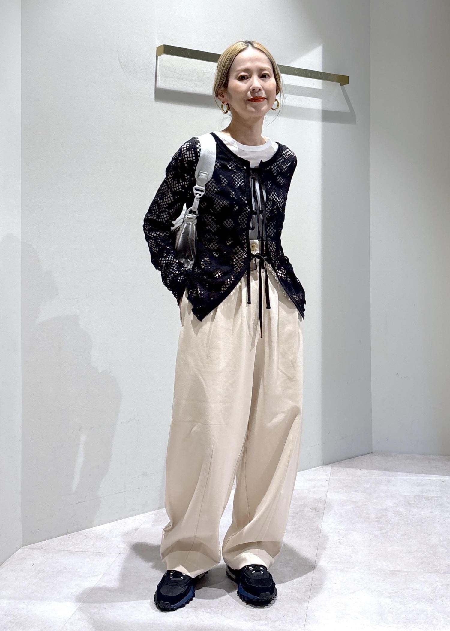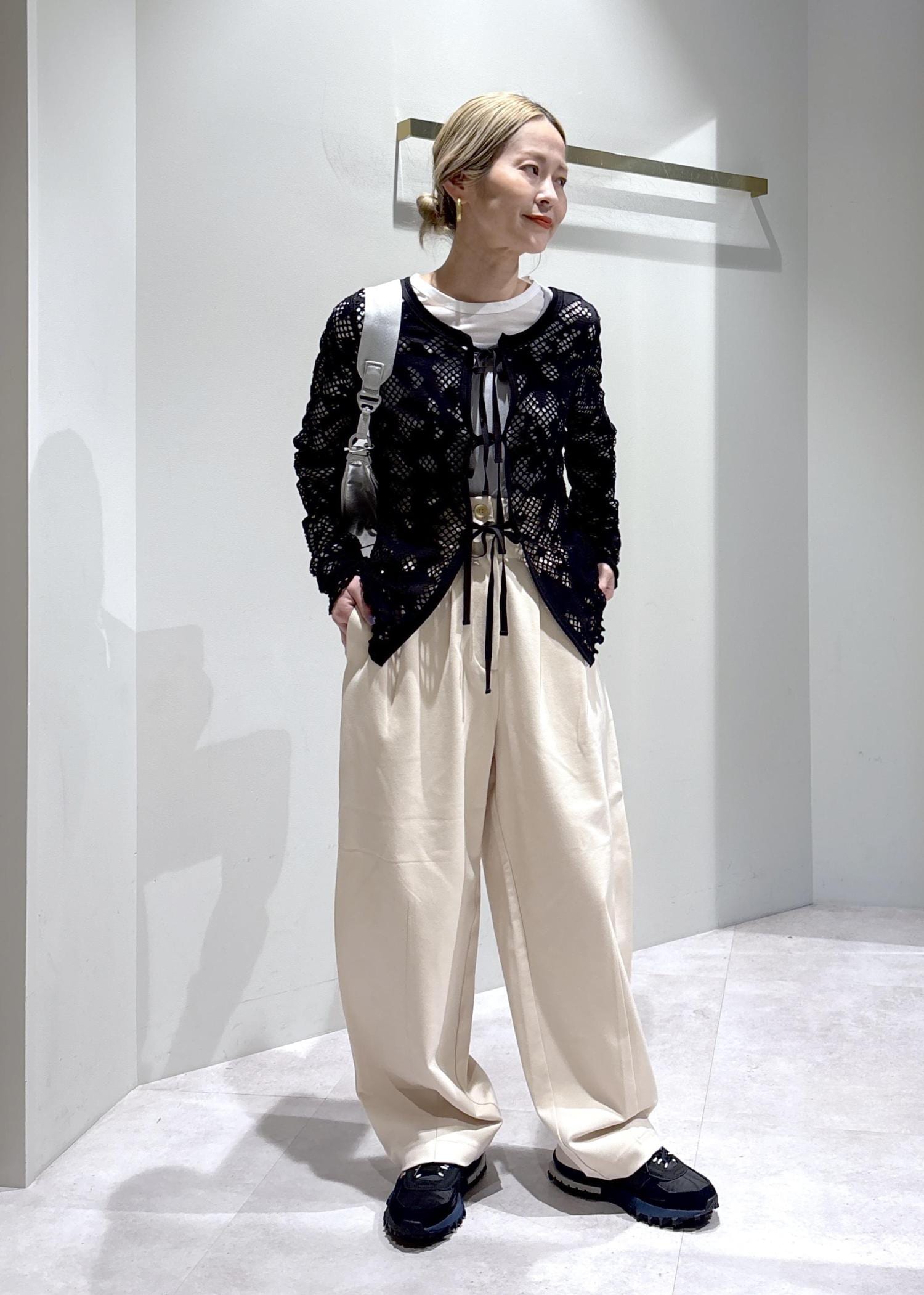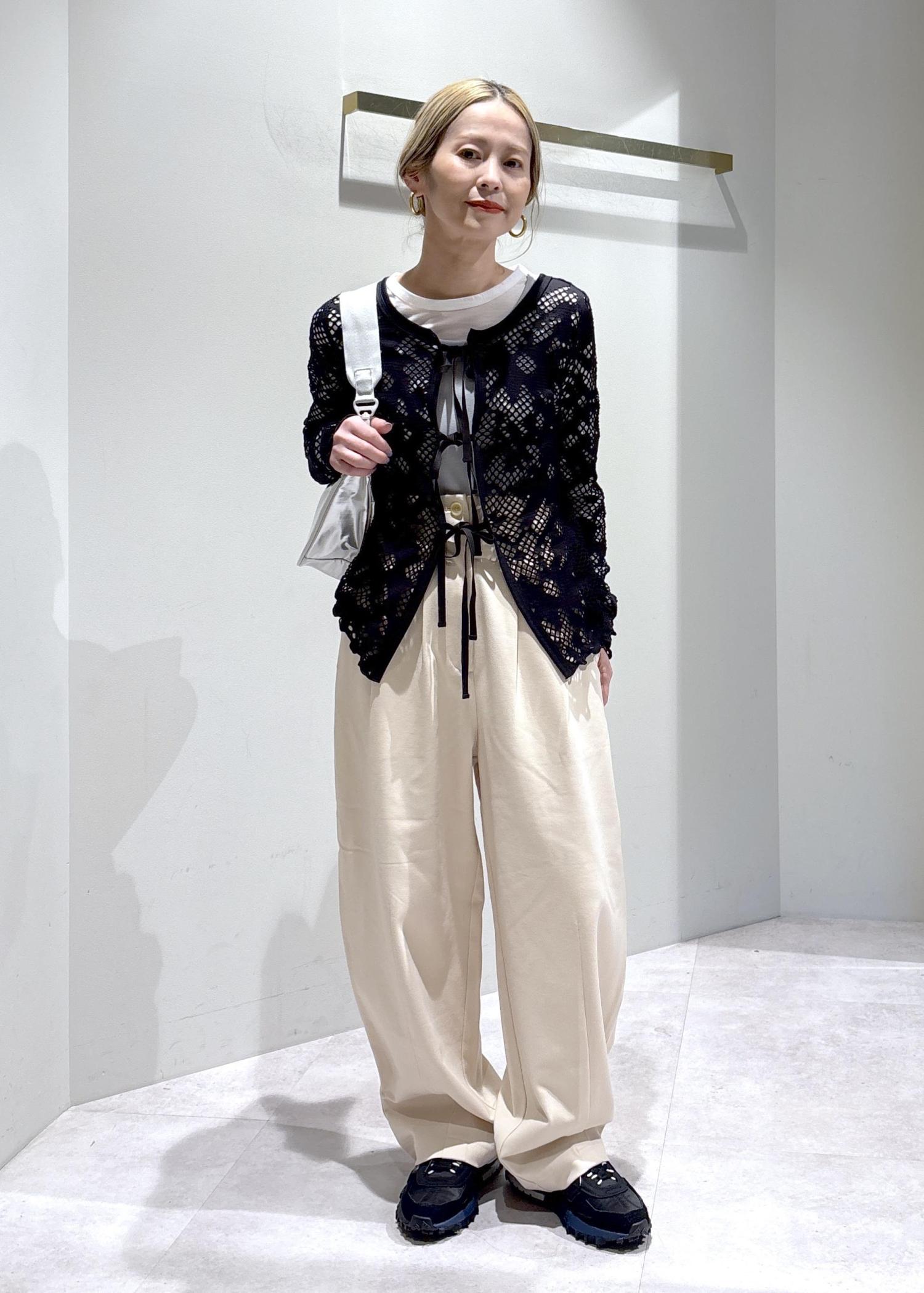 レースが女性らしさを引き立てつつ、インナーやスニーカーで程よくカジュアルダウンすることで、甘くなりすぎないバランスに仕上げました。