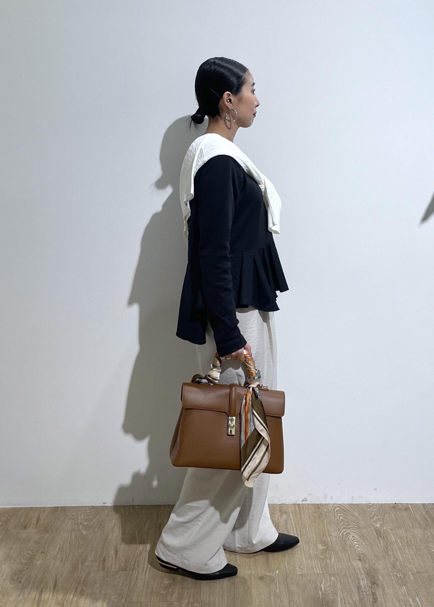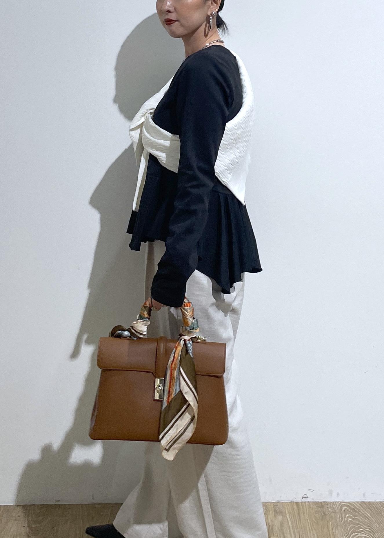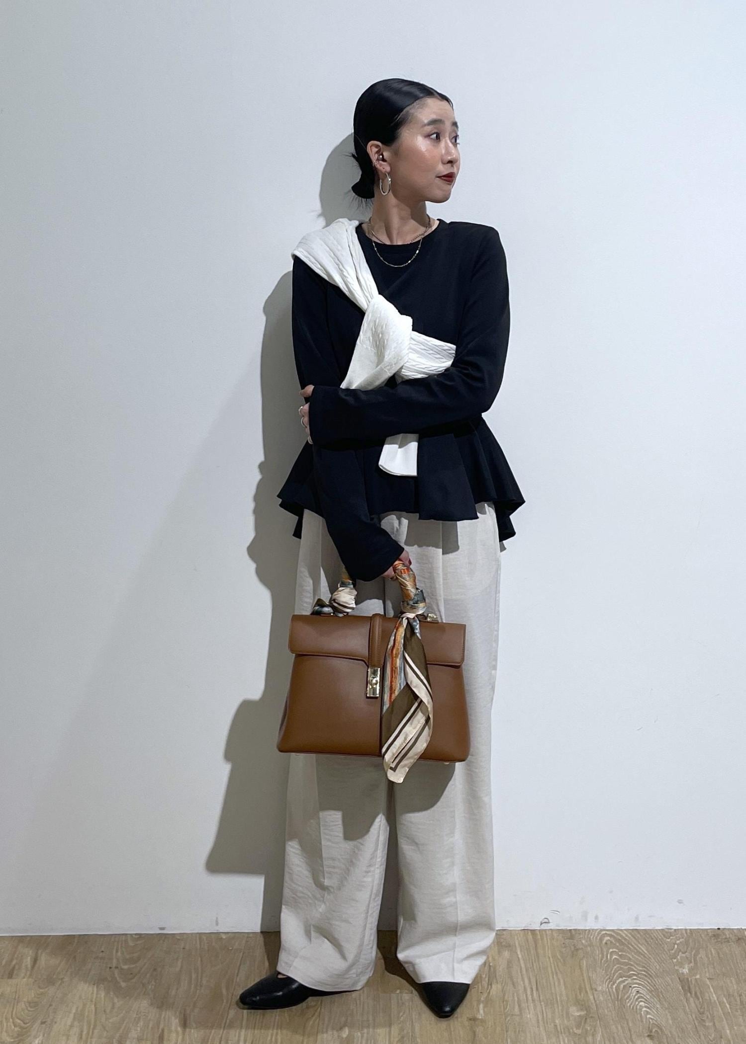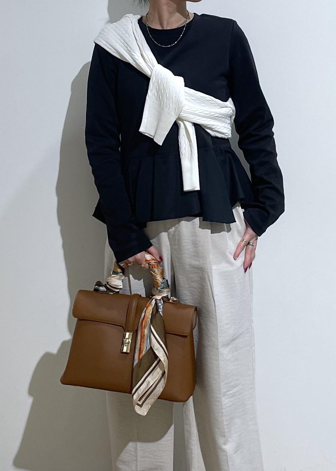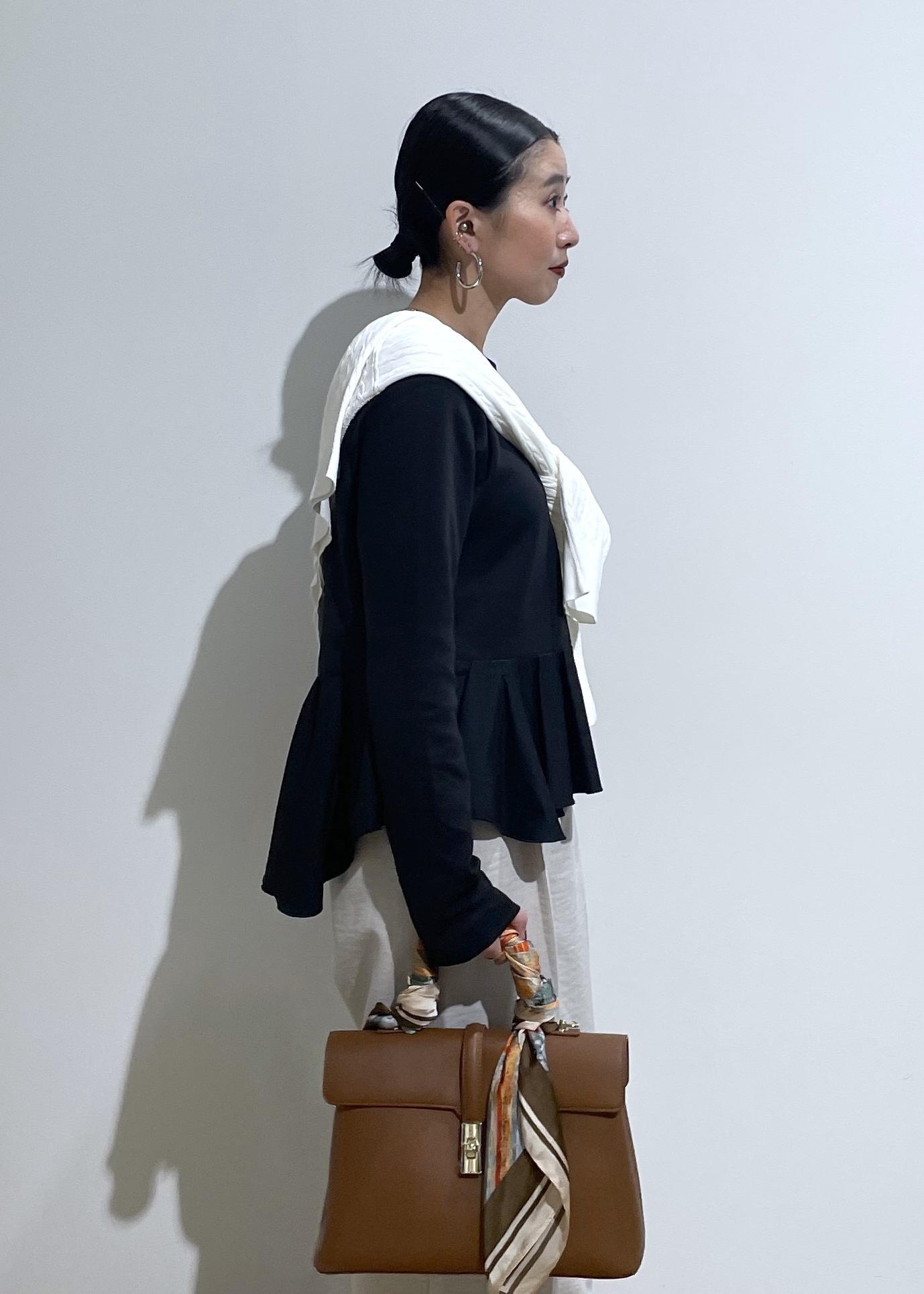 バッグのスカーフで華やかさもプラスして大人カジュアルコーデ。
