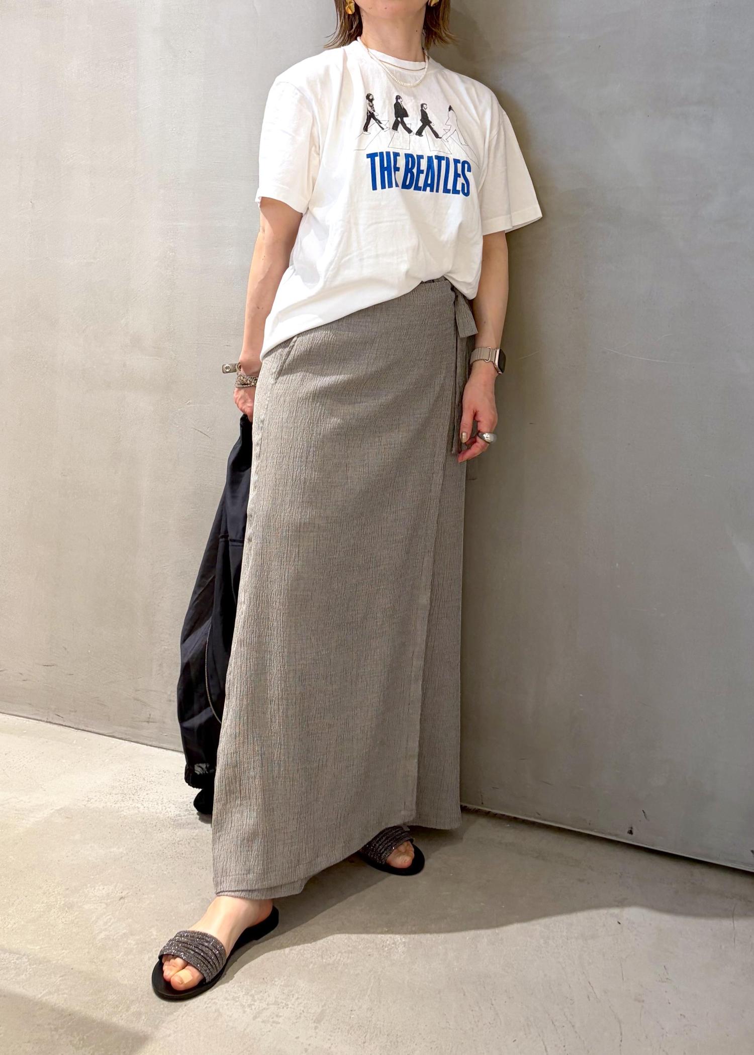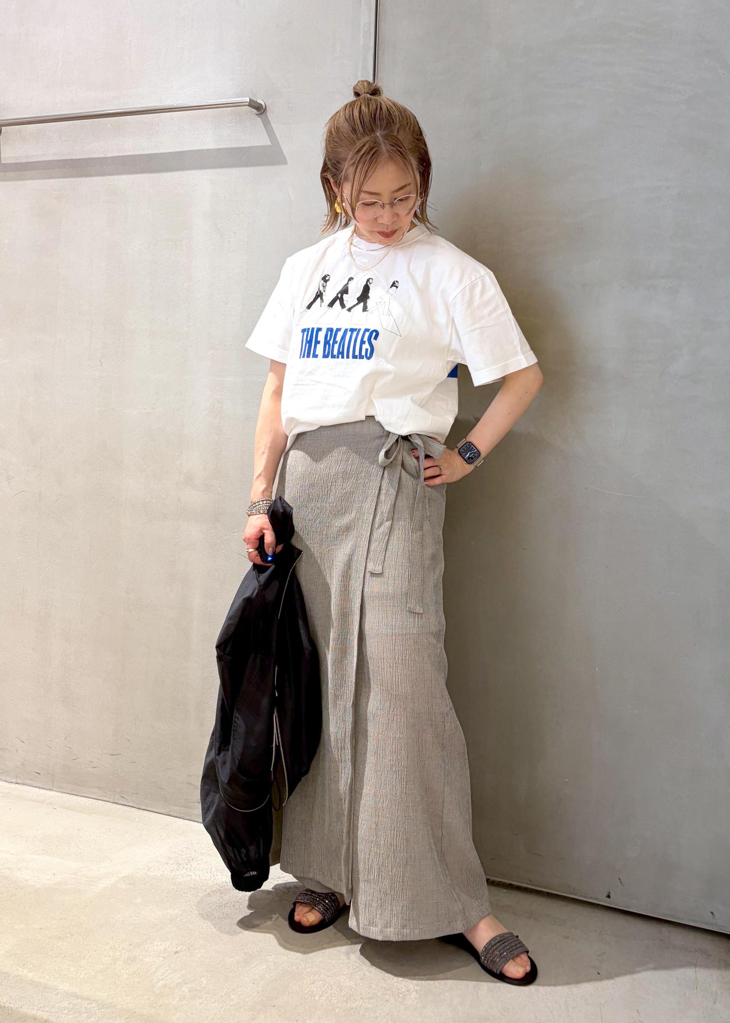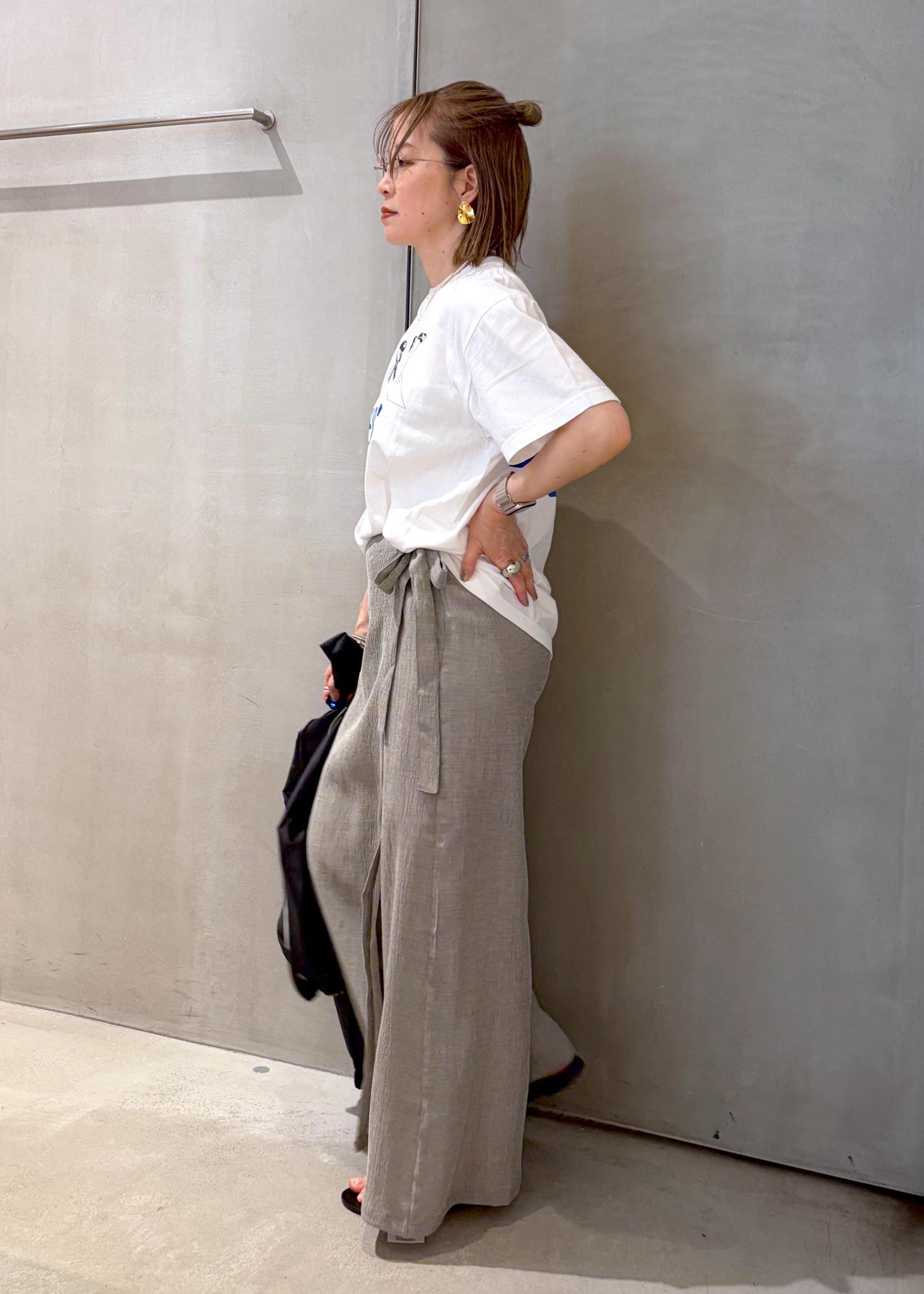 スカートとパンツのいい所取りをしたようなボトムをTシャツに合わせて、大人カジュアルコーデにしました。
