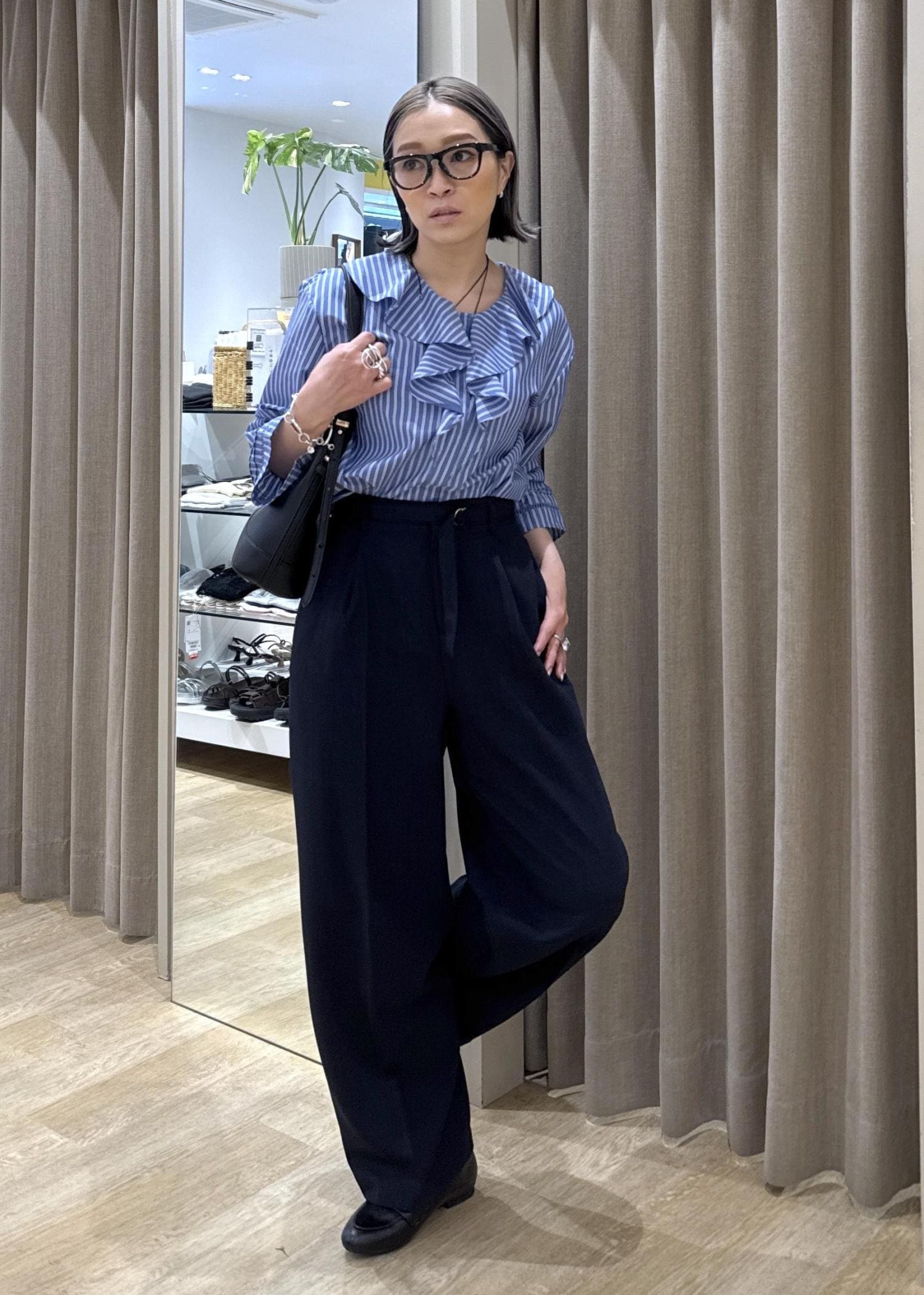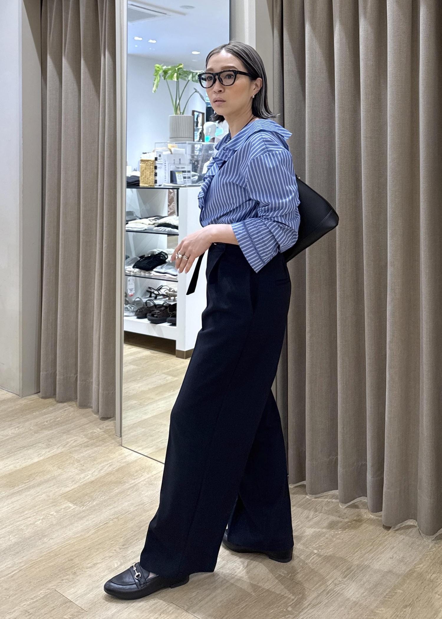 デザイン性の強いブラウスとスラックスを