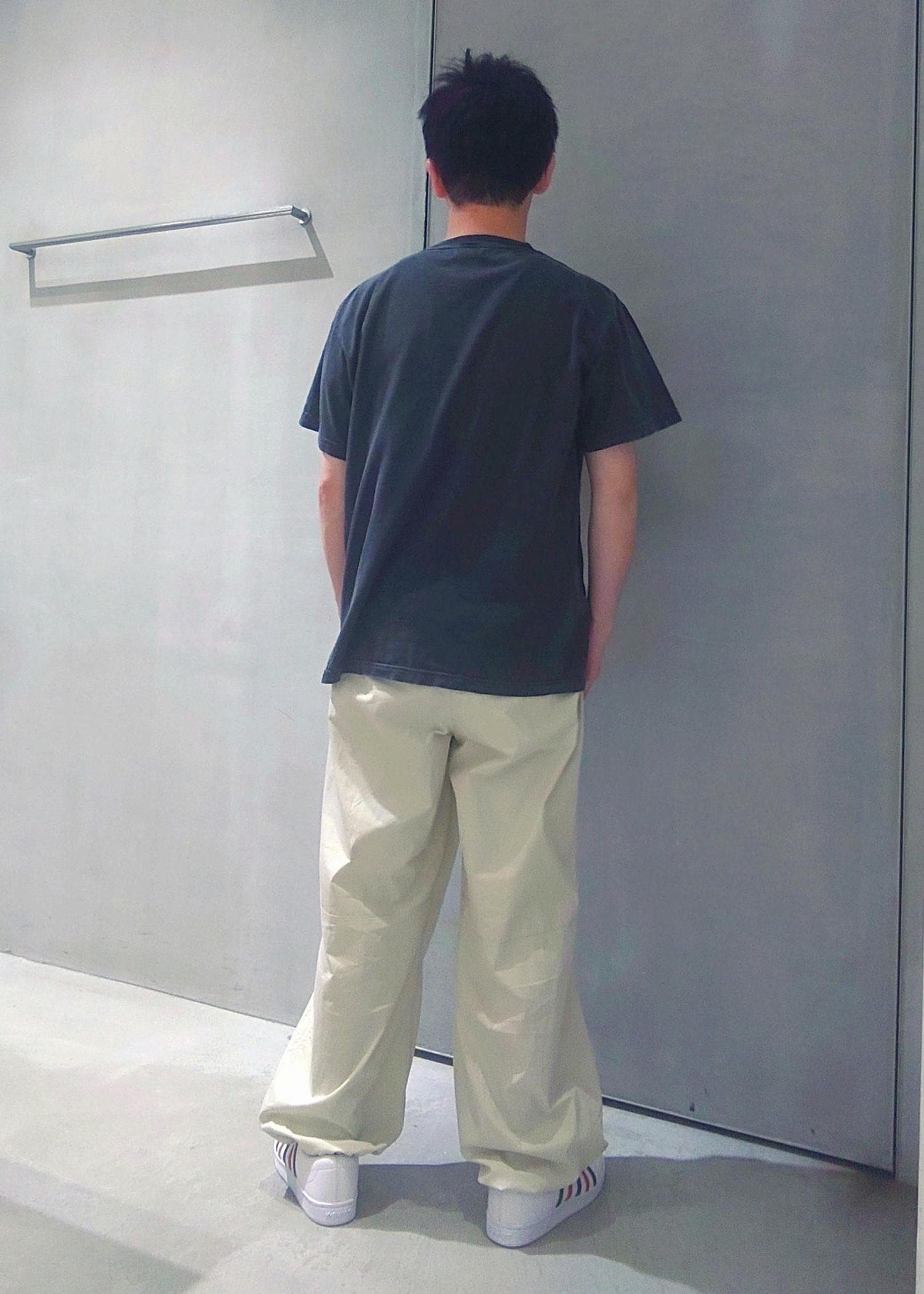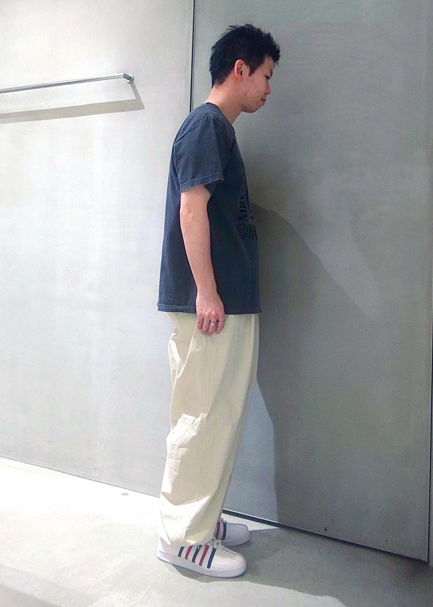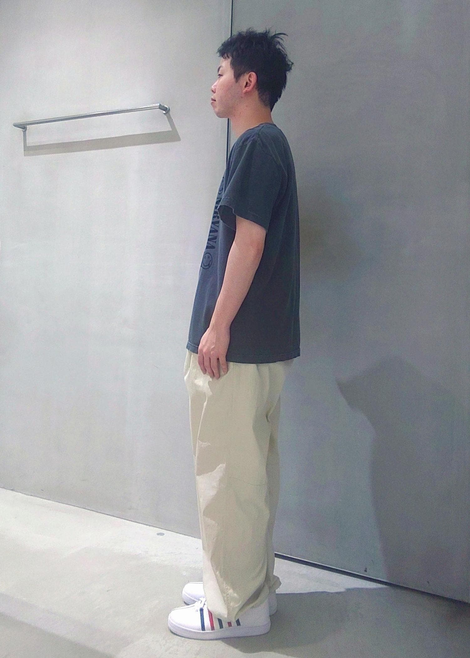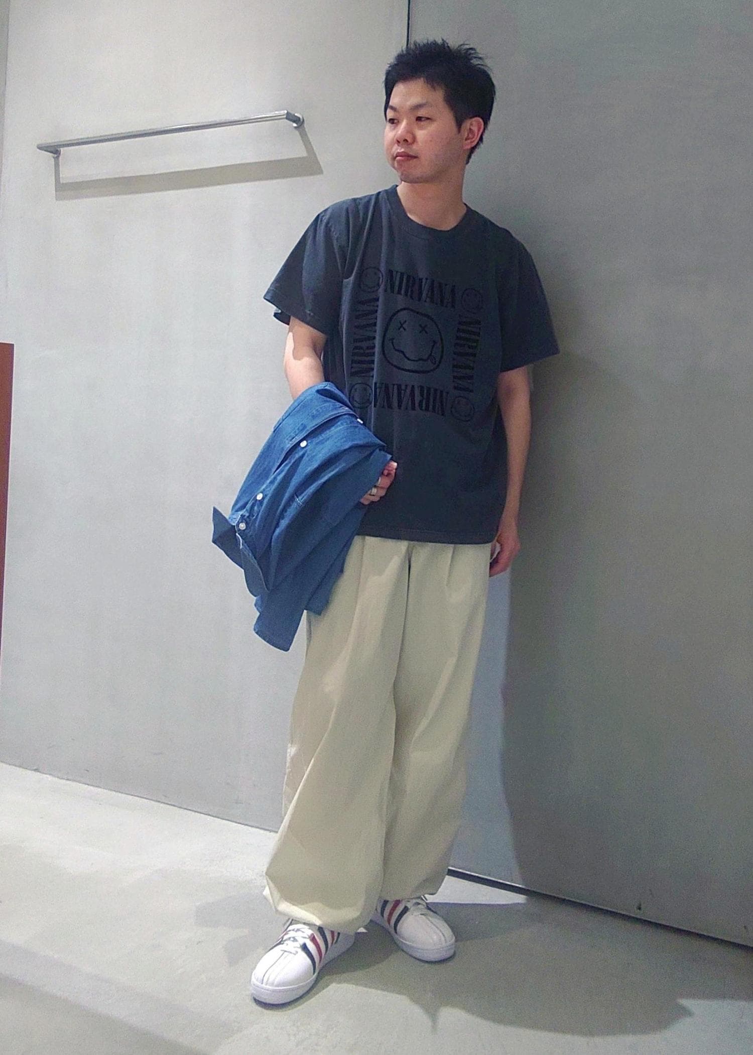 ニルヴァーナの代表的なアートをプリントで表現したTシャツにストレスフリーのパンツを合わせてこの夏快適なコーデを組みました。