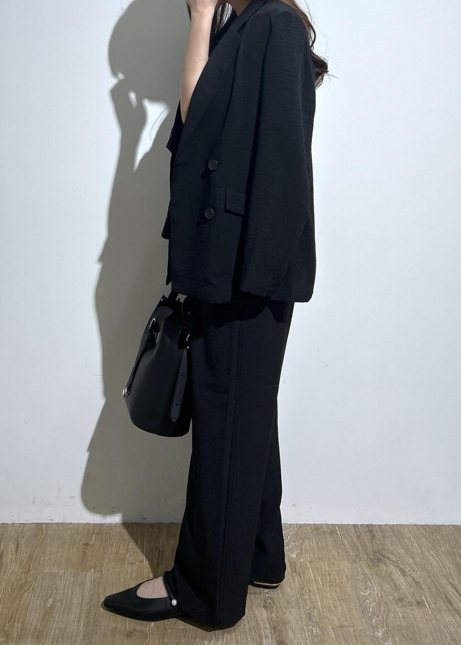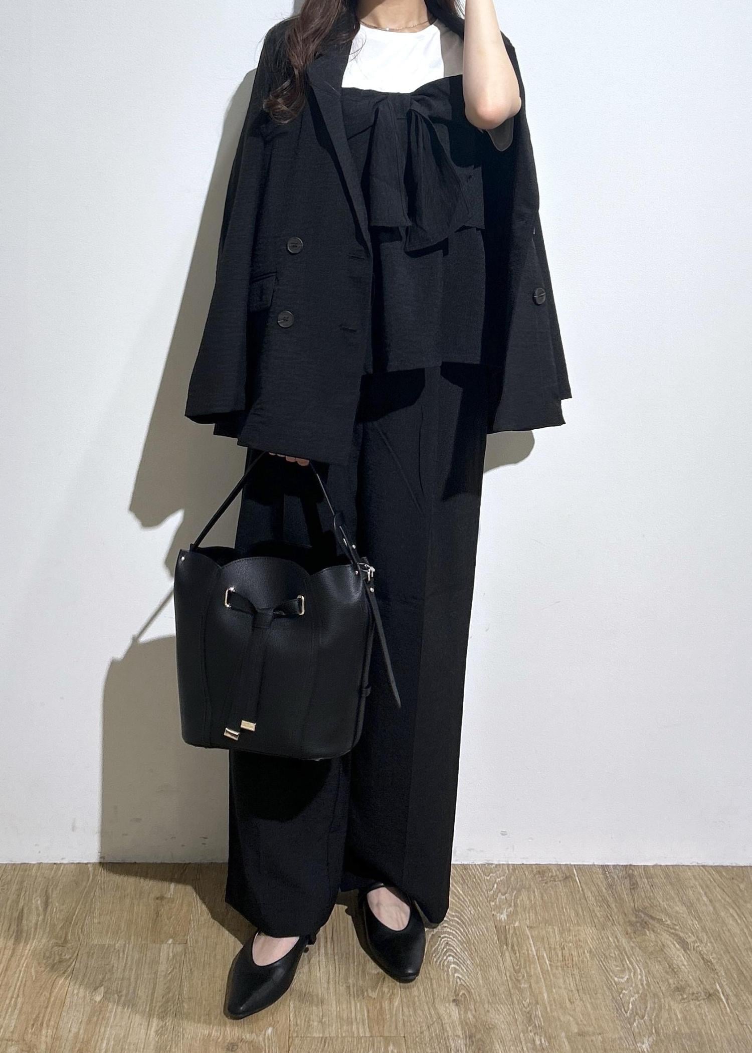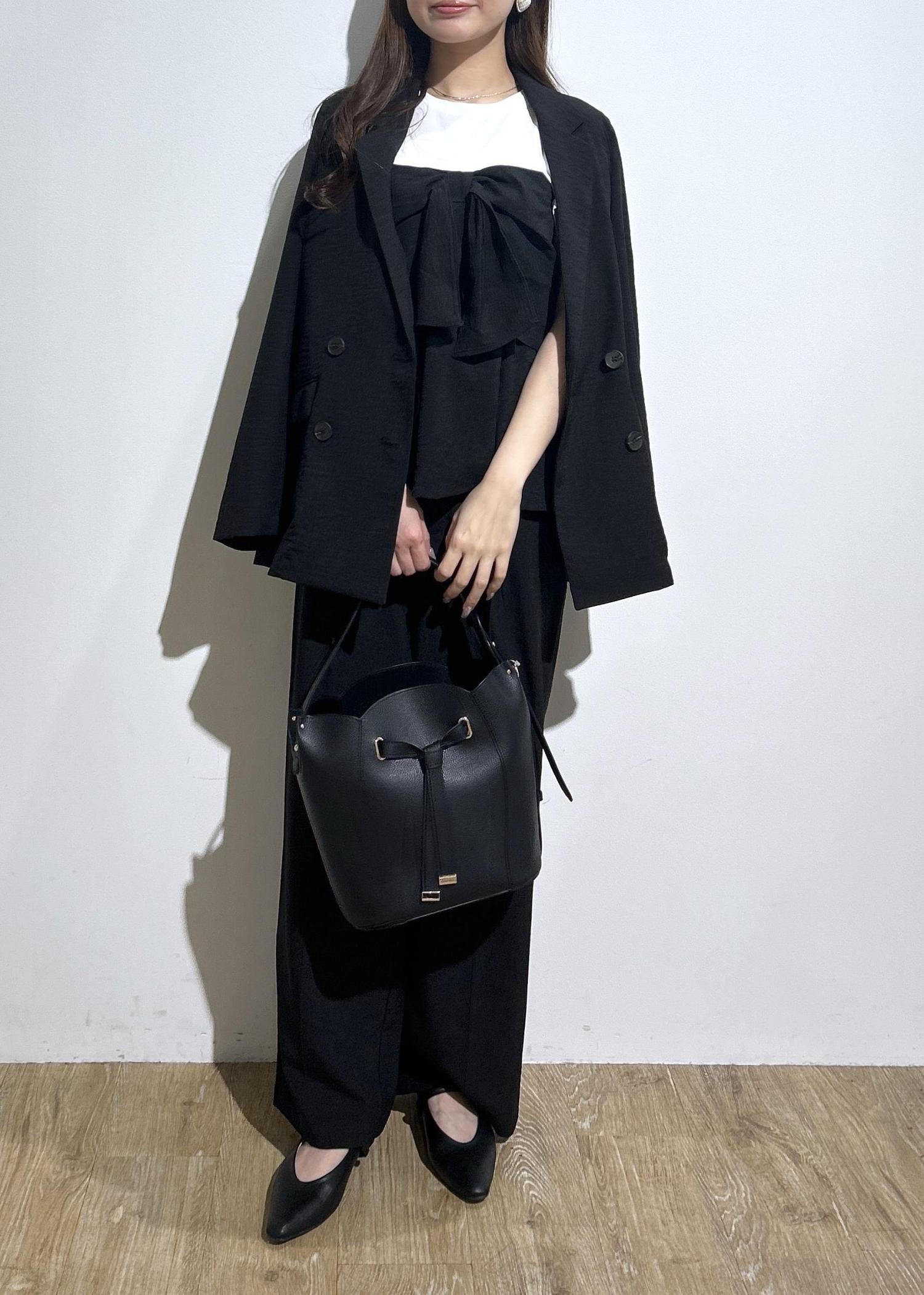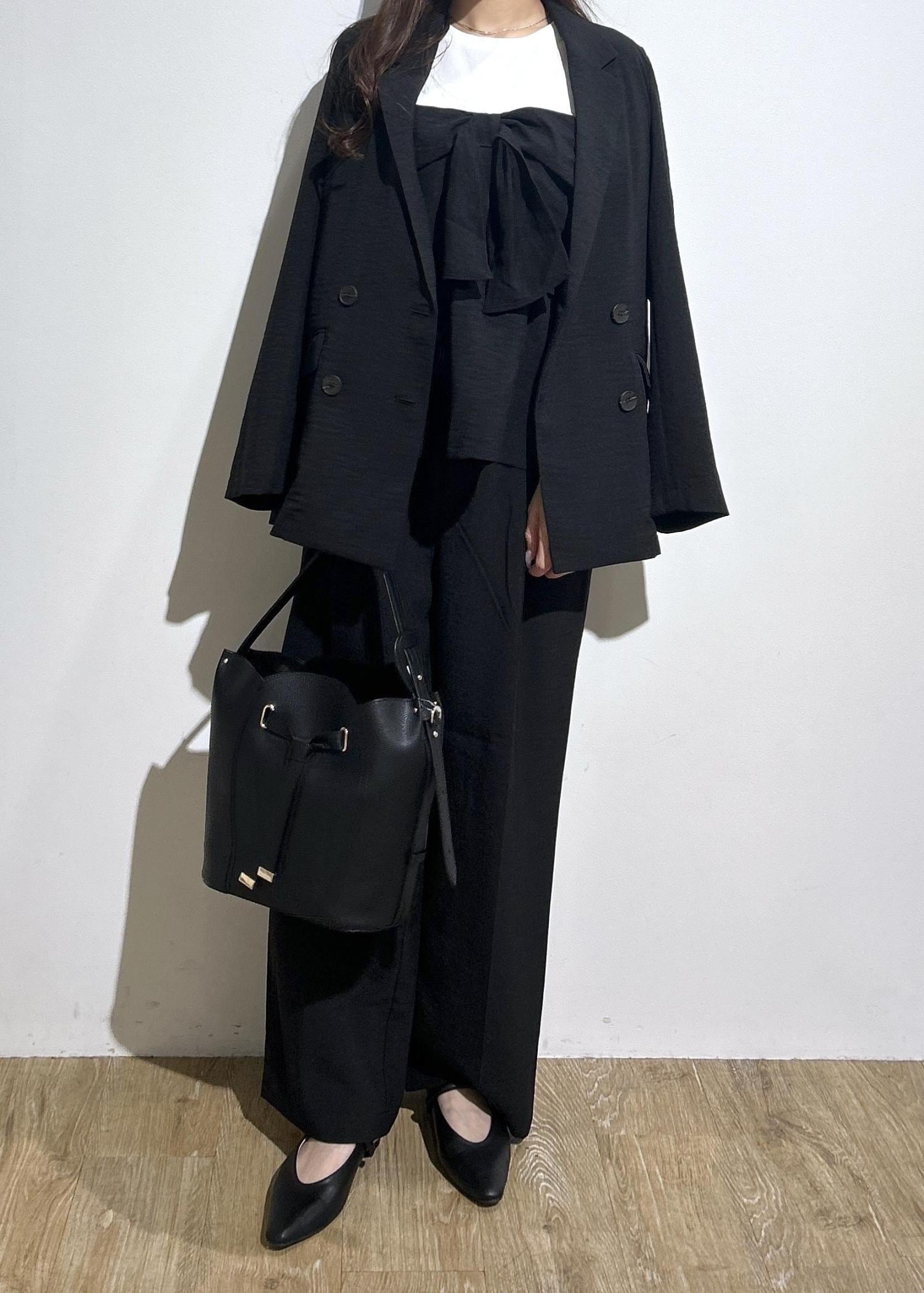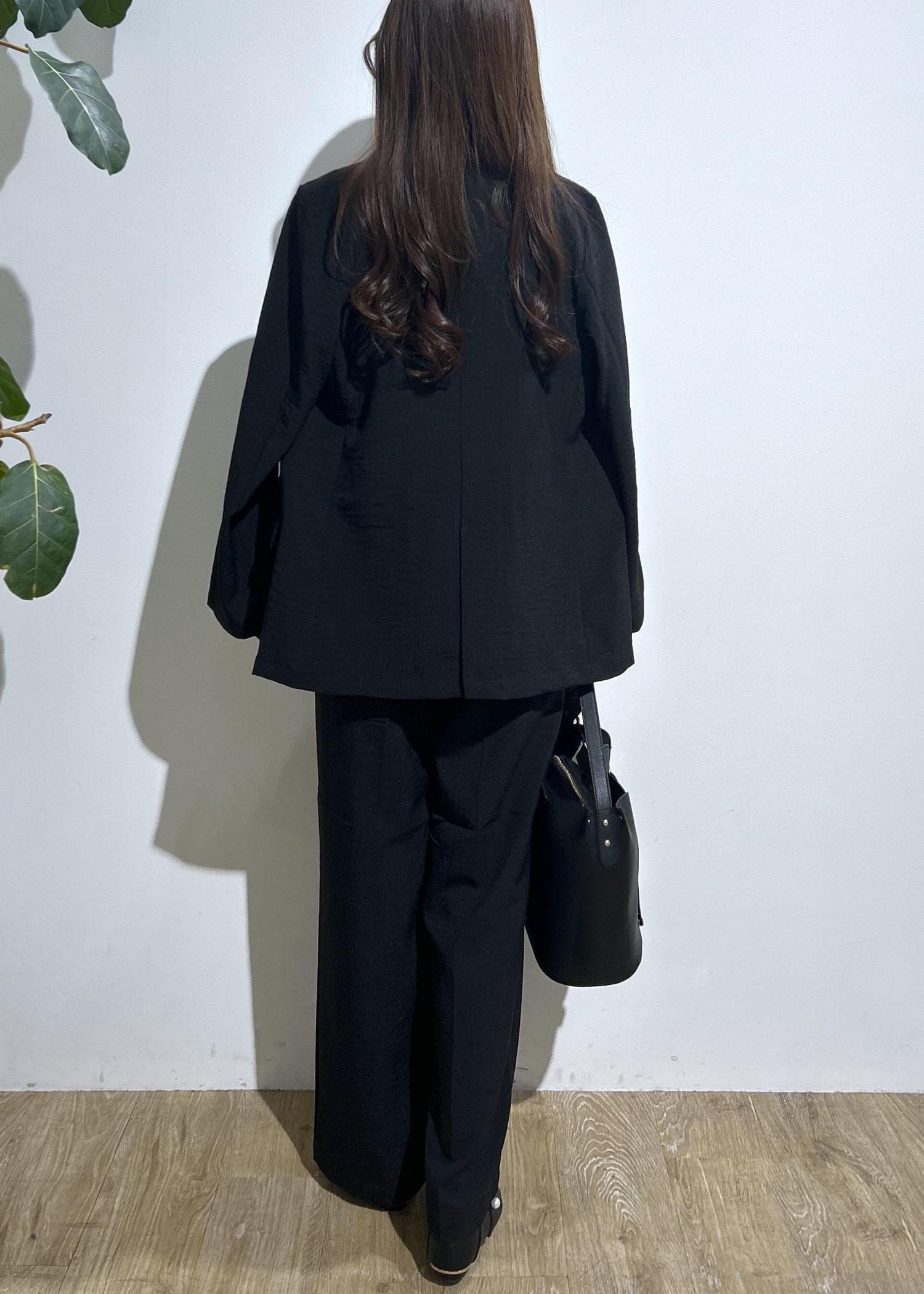 すべてブラック一色で揃えたモノトーンセットアップコーデです。オフィスシーンにはもちろん、単品だと普段使いにも最適なアイテムばかりです◎