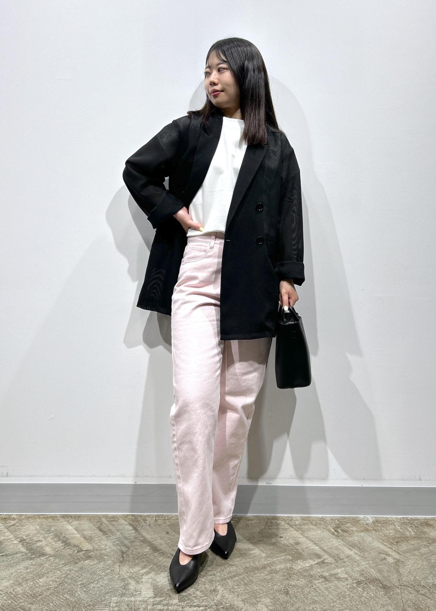 女性らしいピンクのストレートパンツを合わせた