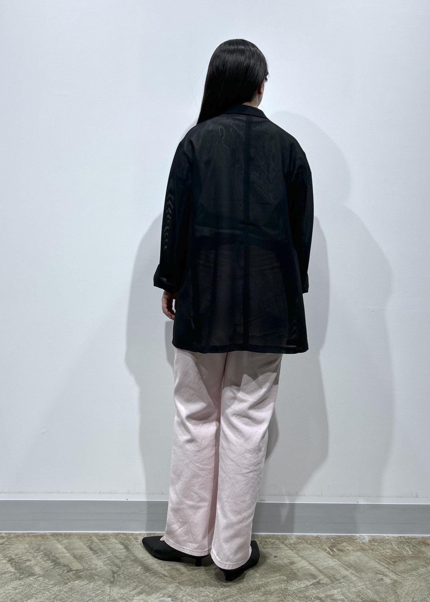 メッシュ生地ですが、着てみると透けすぎずヘルシーなシアー感でカジュアルに合わせやすいです◎
