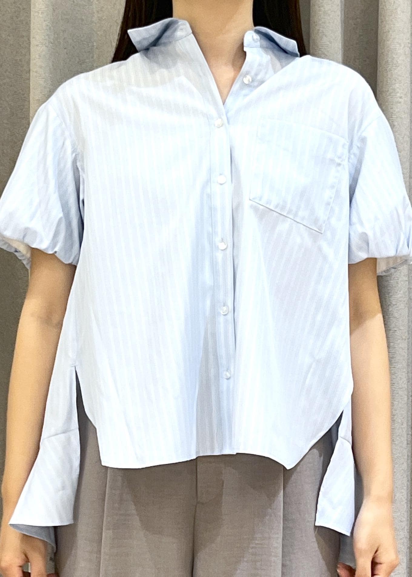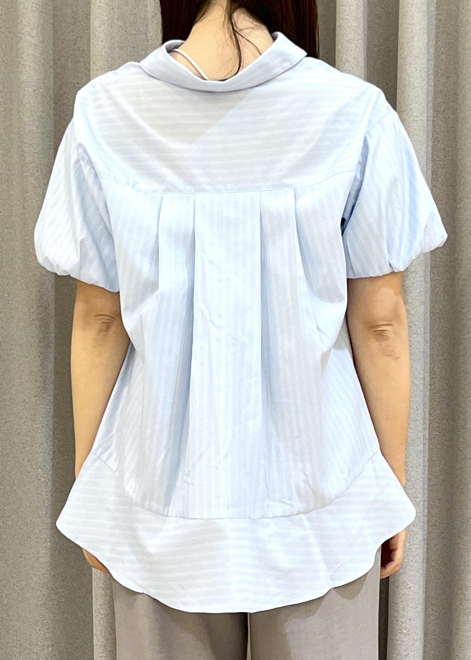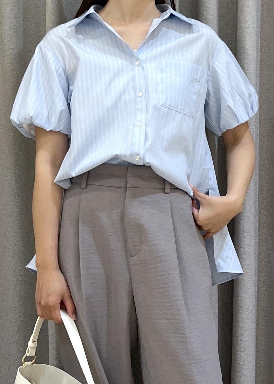 VIS後ろタックフレアシャツサックス / F¥5,489レビュー程よいハリ感のある素材できちんと見えしつつ、軽やかな着心地。ふんわりとした袖のボリュームデザインが女性らしさをプラスし、シンプルながらも一枚で着映えする一着です。