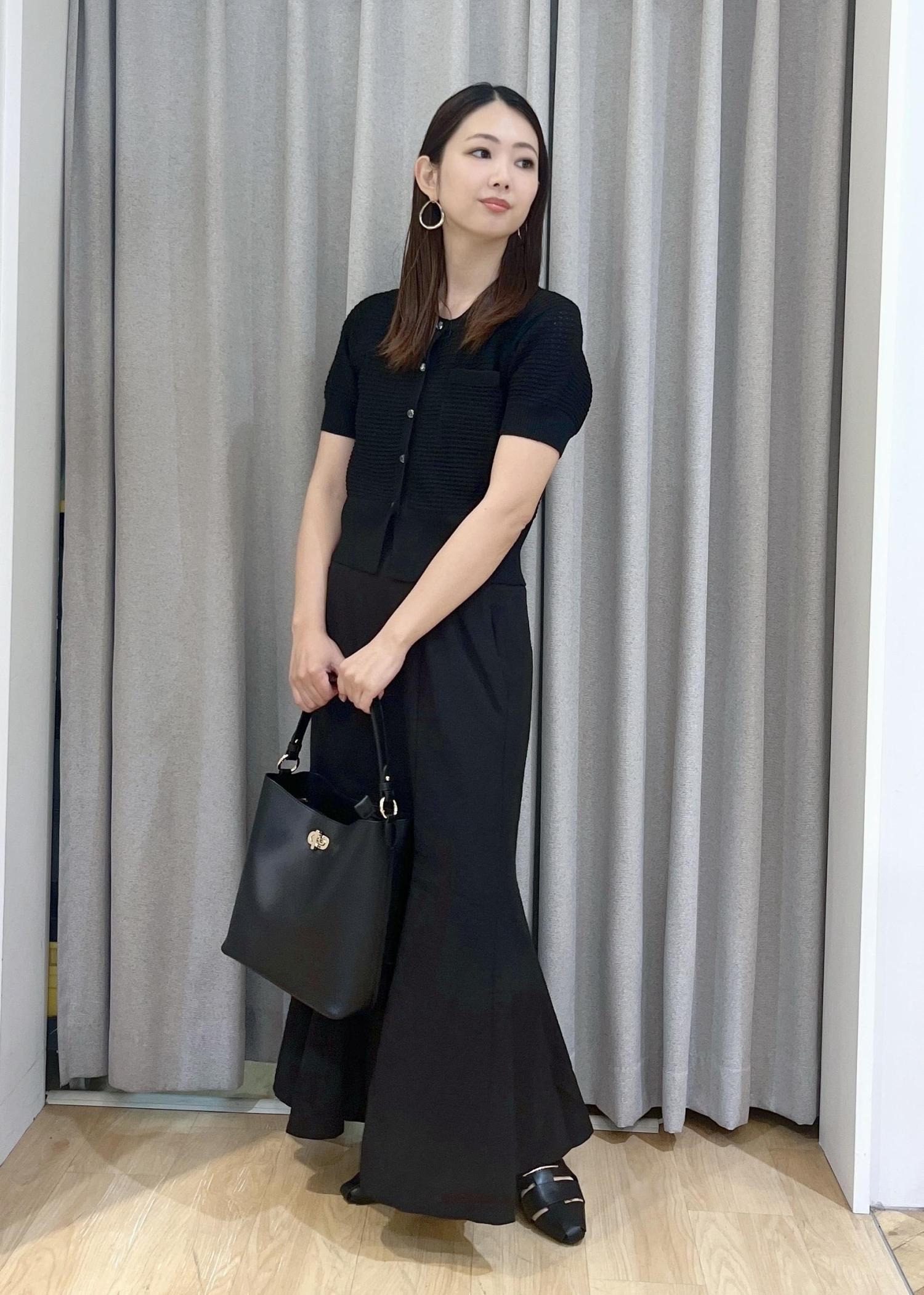 コンパクトなニットとマーメイドスカートで、女性らしいシルエットに♪素材感で軽さを出しつつ、フラットシューズで程よい抜け感をプラス。