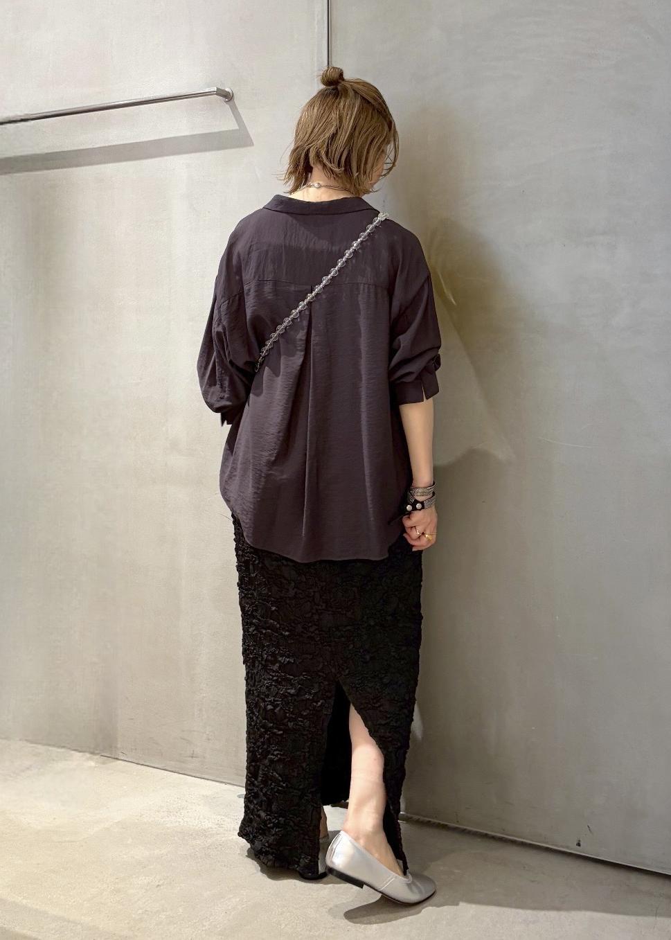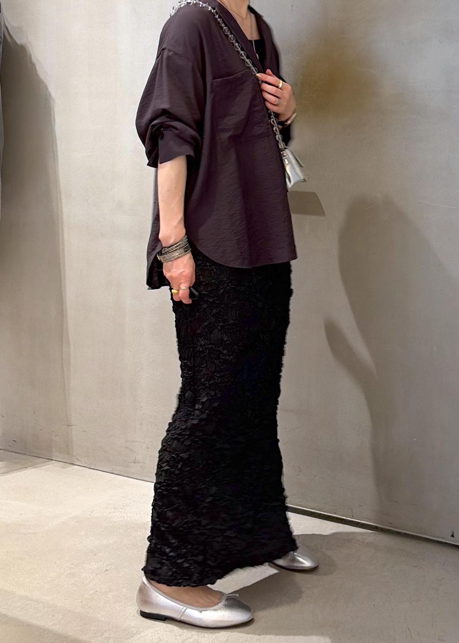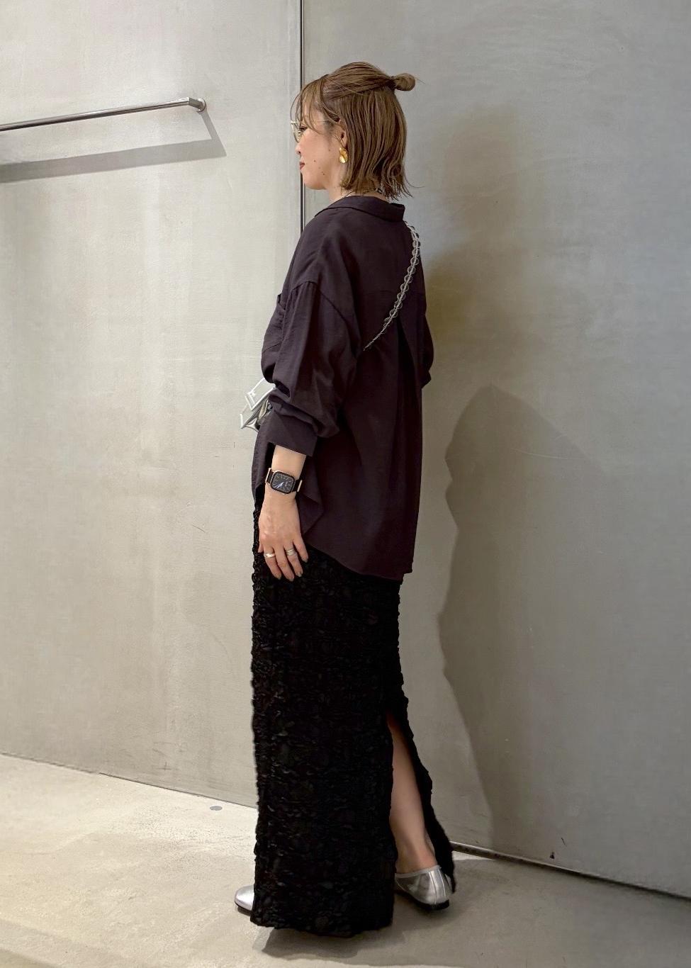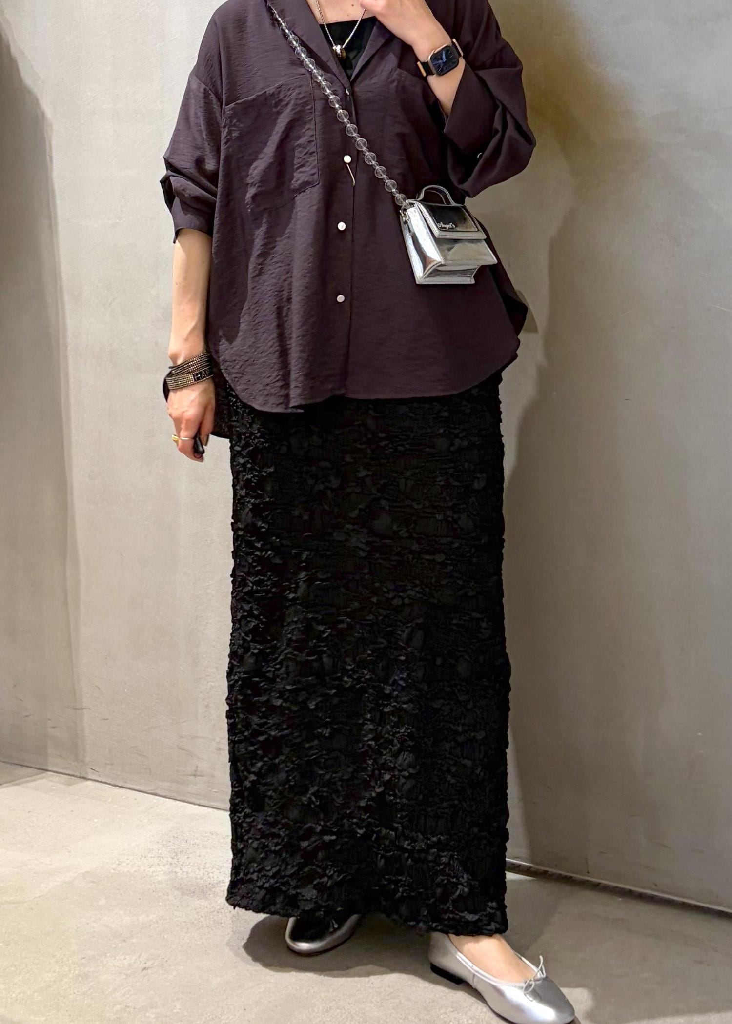 ぽこぽこした素材のスカートを甘くならない様にワントーンでスタイリングしました。
