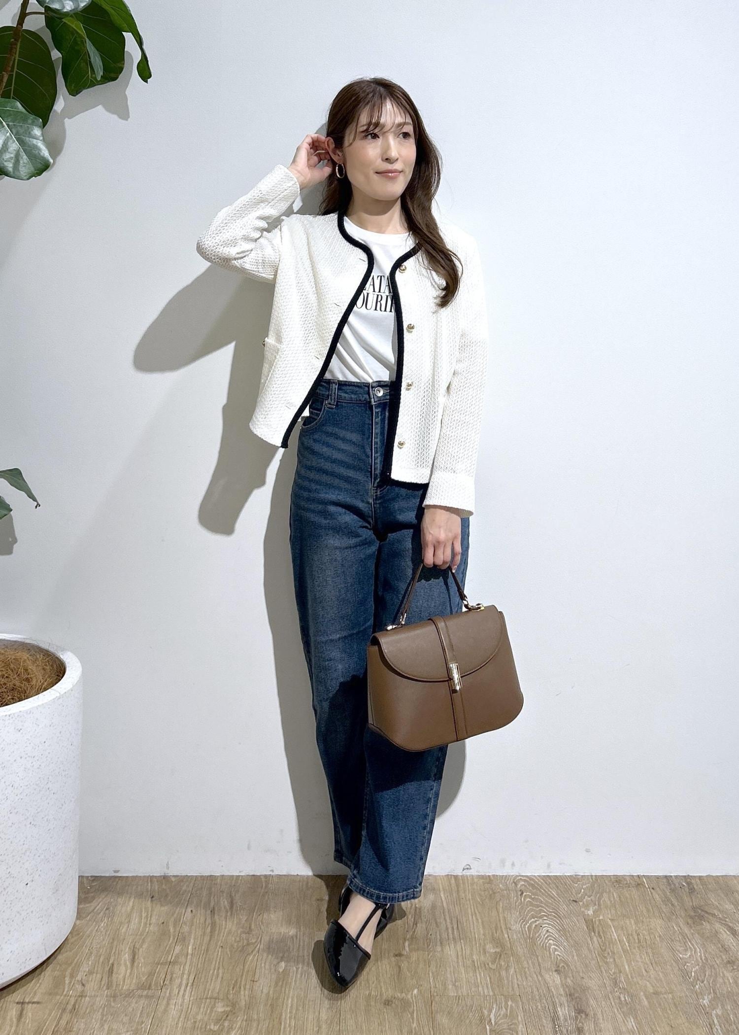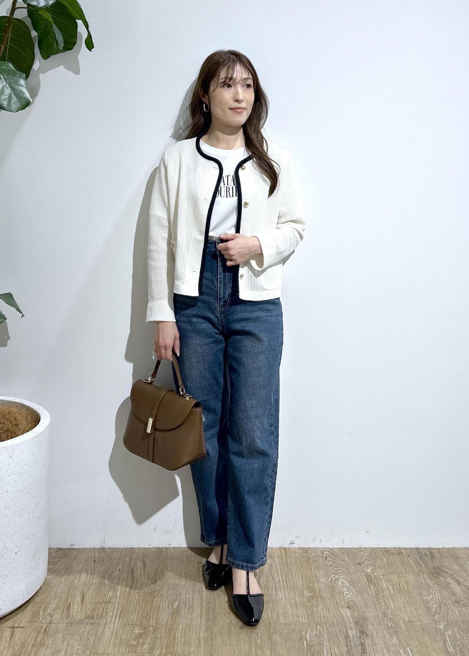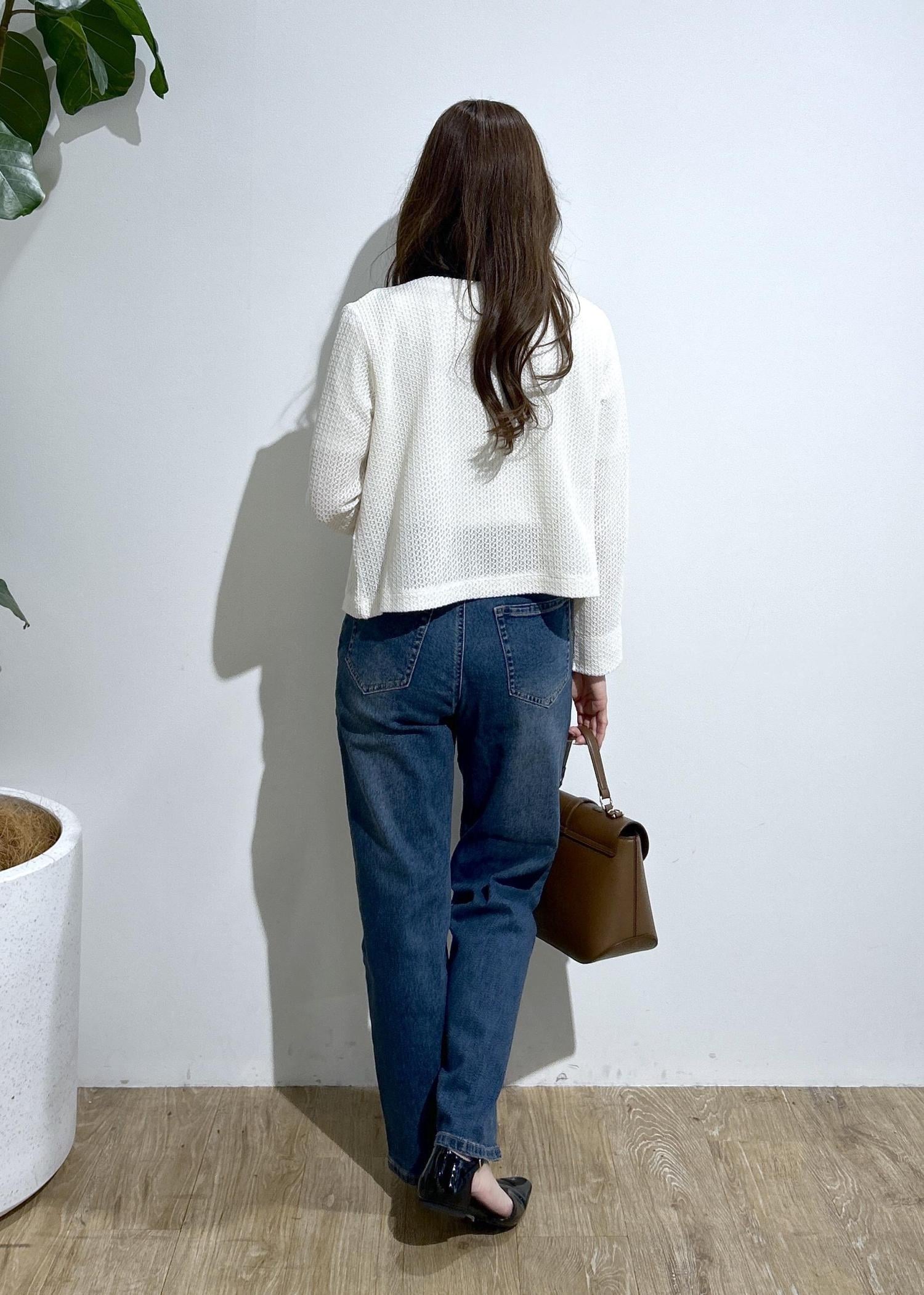 メッシュ編みカーディガンを使ってTシャツとデニムを合わせカジュアルなコーデにしました。