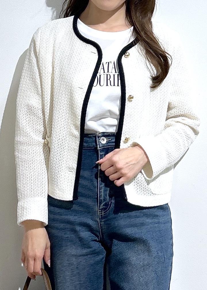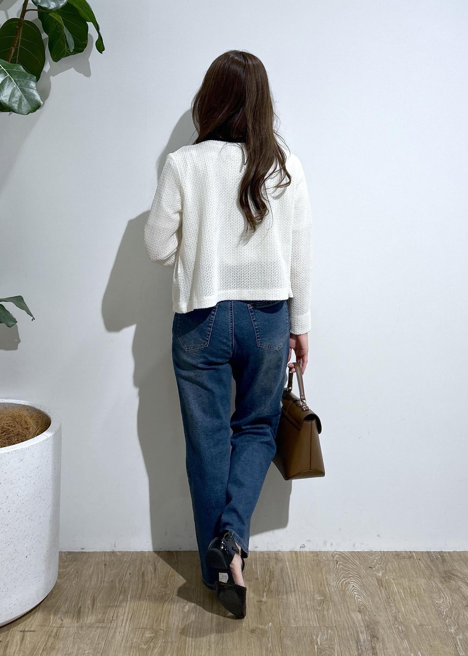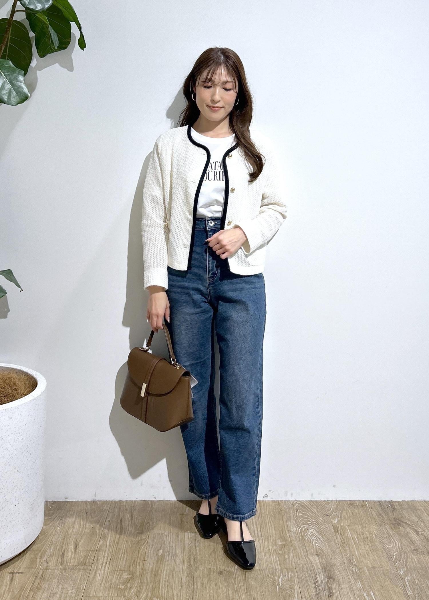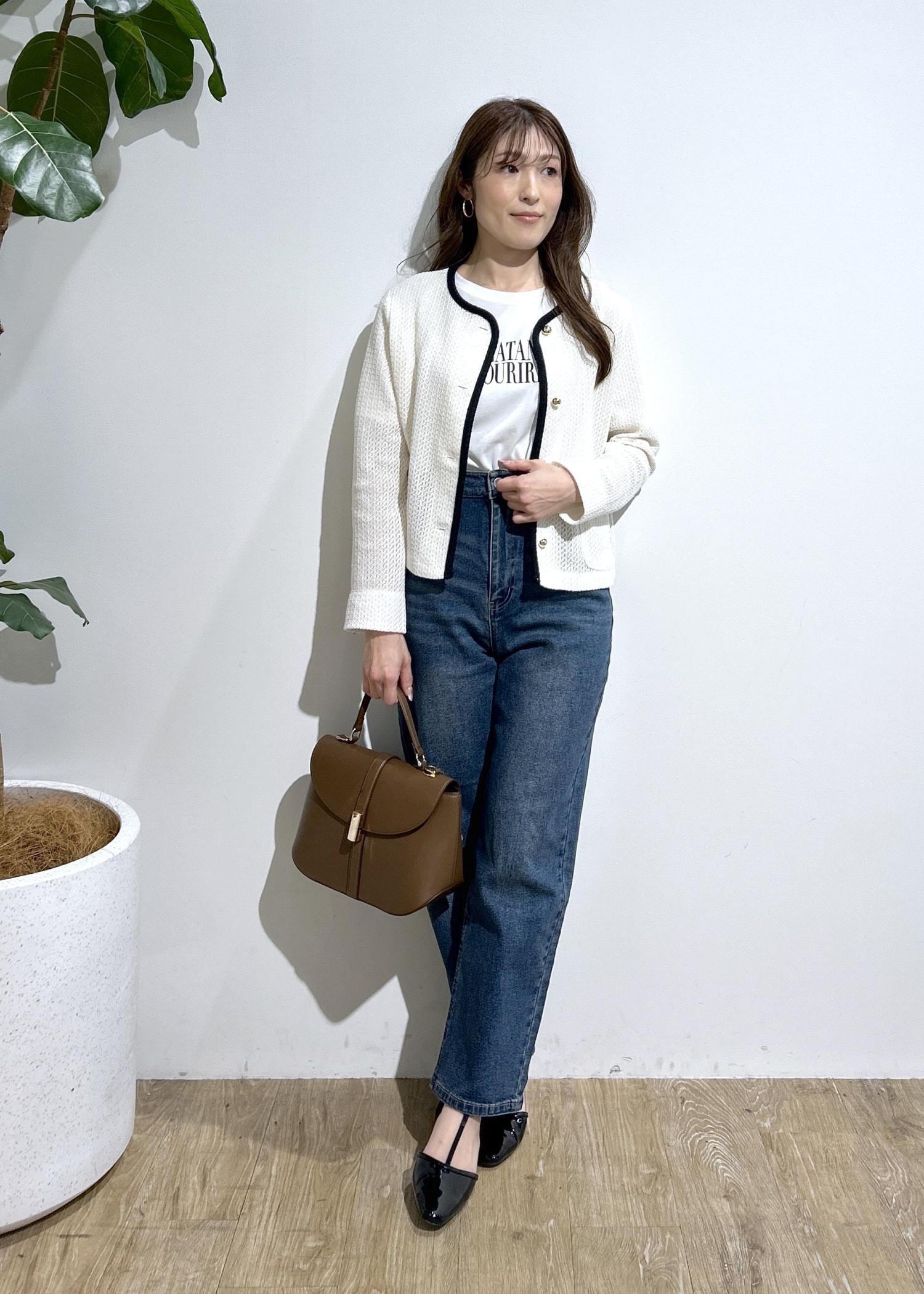 メッシュ編みカーディガンを使ってTシャツとデニムを合わせカジュアルなコーデにしました。