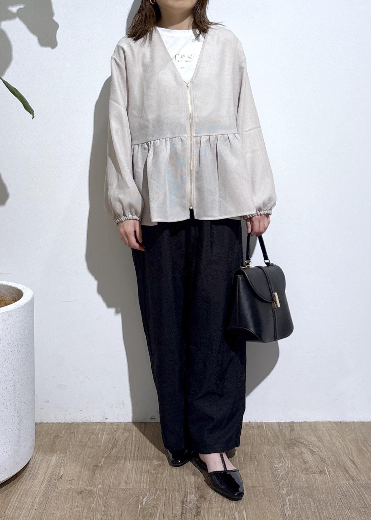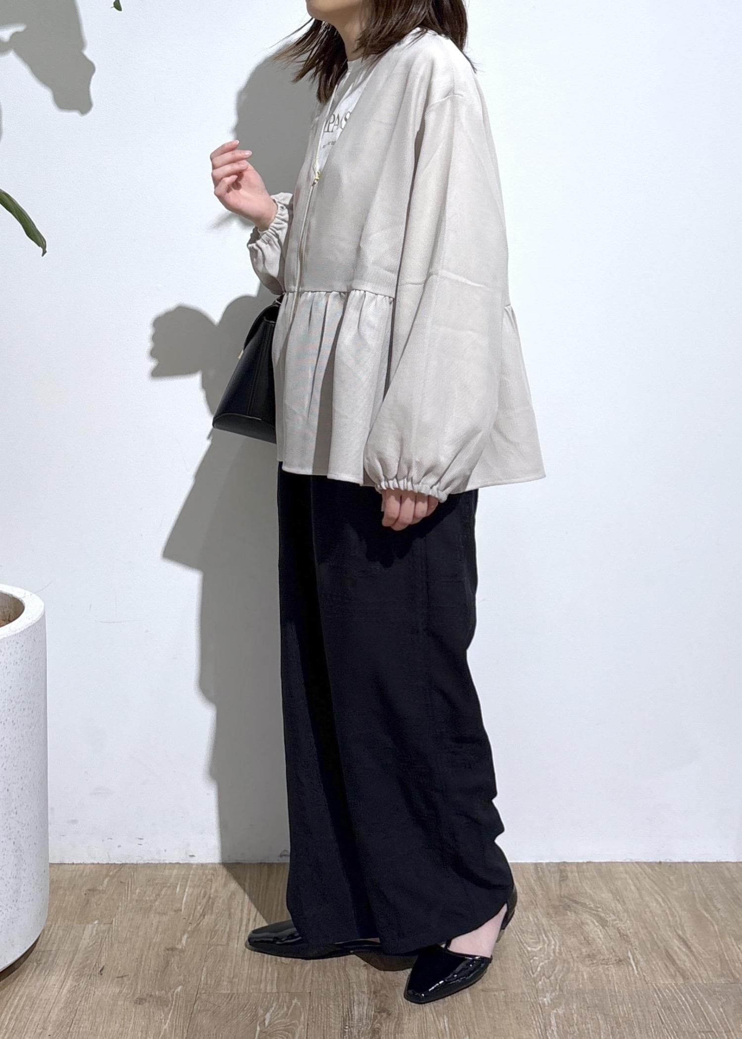 広がりがあるデザインなので、ボトムスは落ち感のある素材だとよりバランス良く着用できます。