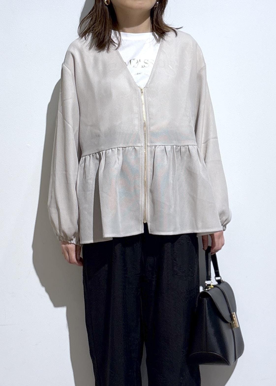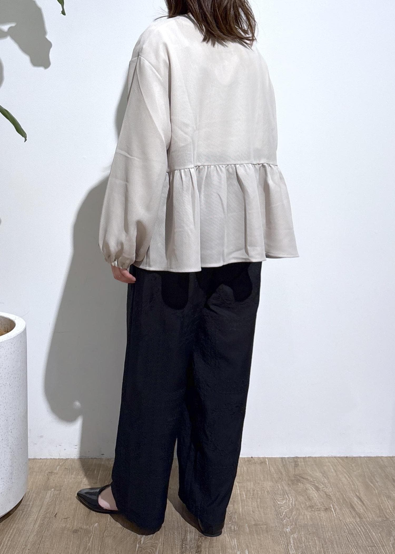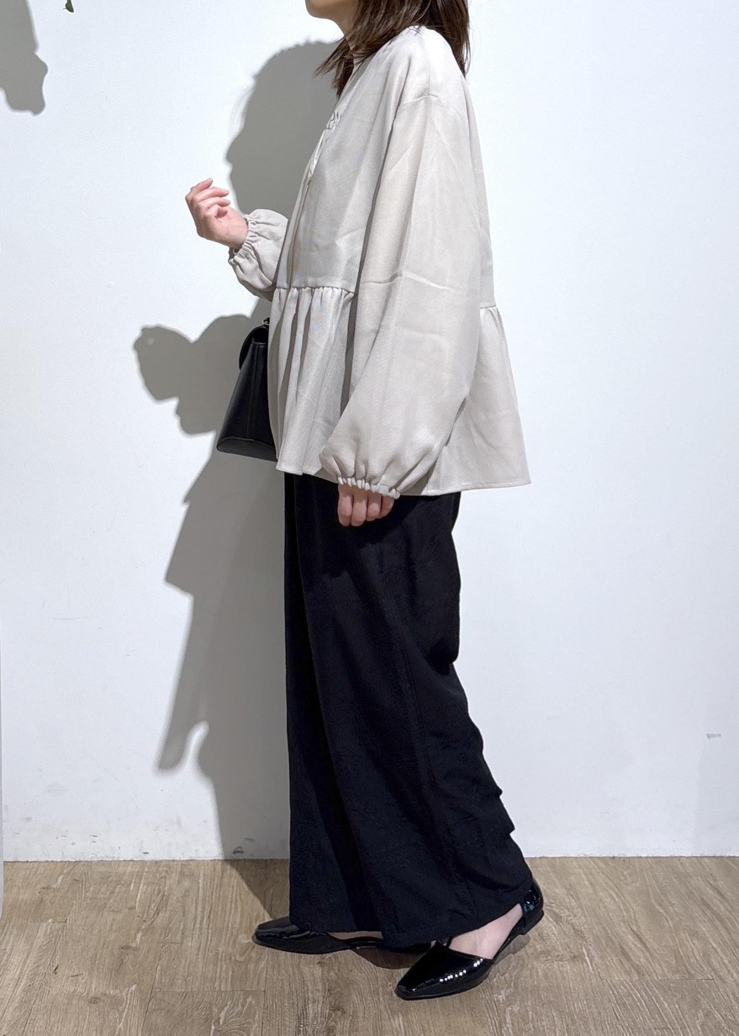 リラックスしたサイズ感でストレスフリーで着用できながら、ボリュームスリーブとペプラムデザインで可愛さもプラスしてくれます。