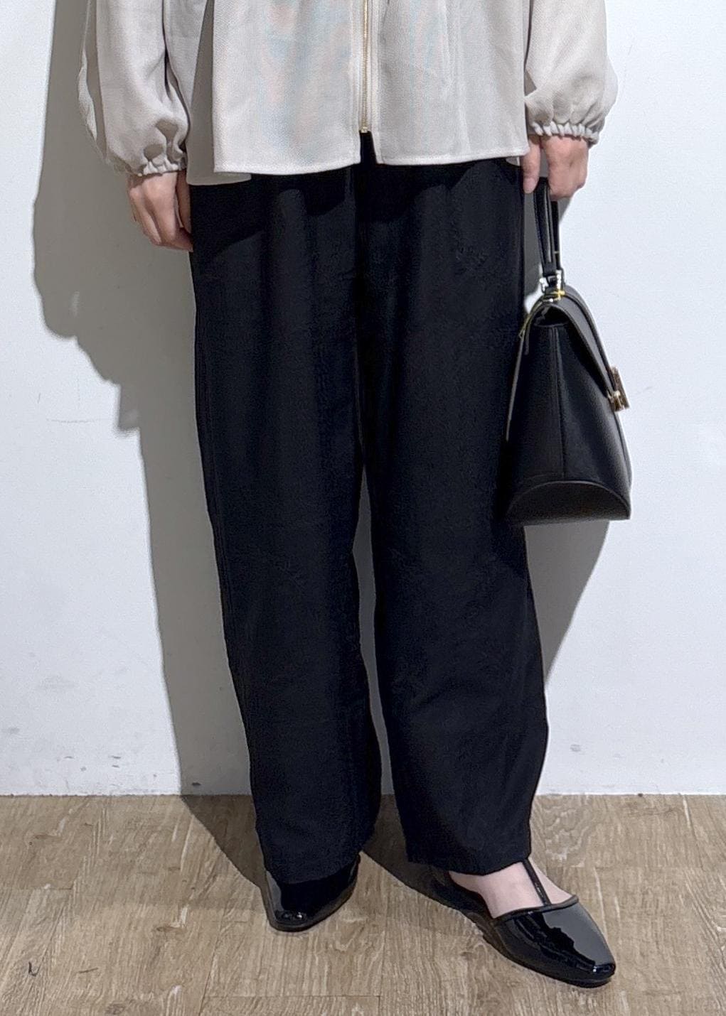 私の身長ですと丈が少し長めだったので、ウエストを一曲げしています。ウエストゴムなので曲げやすいですが、気になる方はヒールパンプスや、厚底のあるシューズを合わせるのもおすすめです。