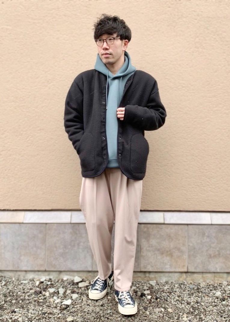 張りがありシンプルなデザインのパーカーに、暖かみのあるボアフリースライトアウターを合わせました。