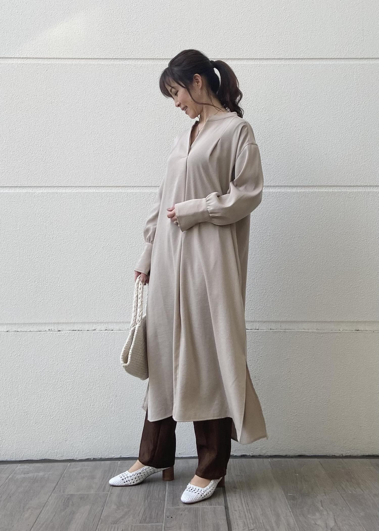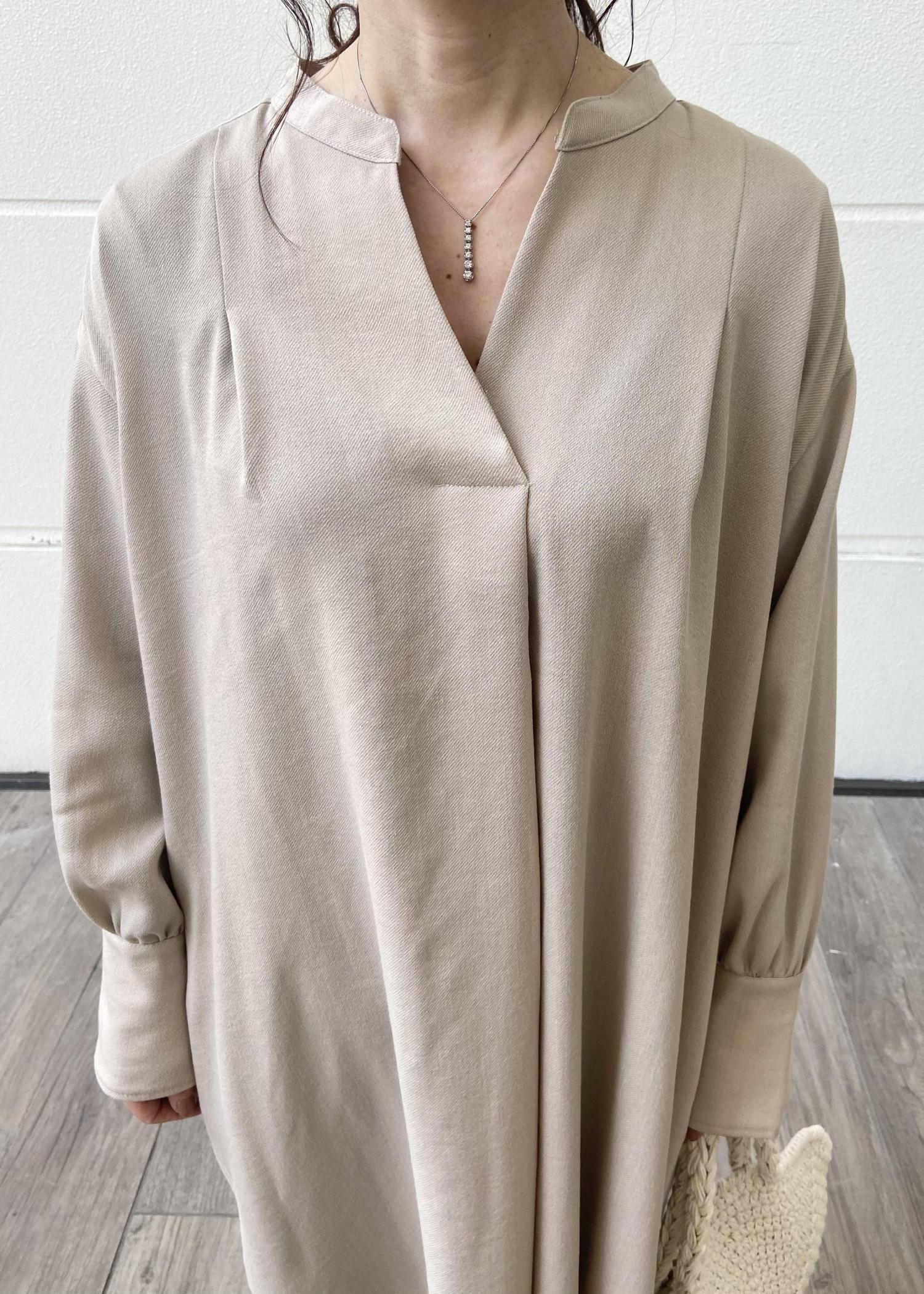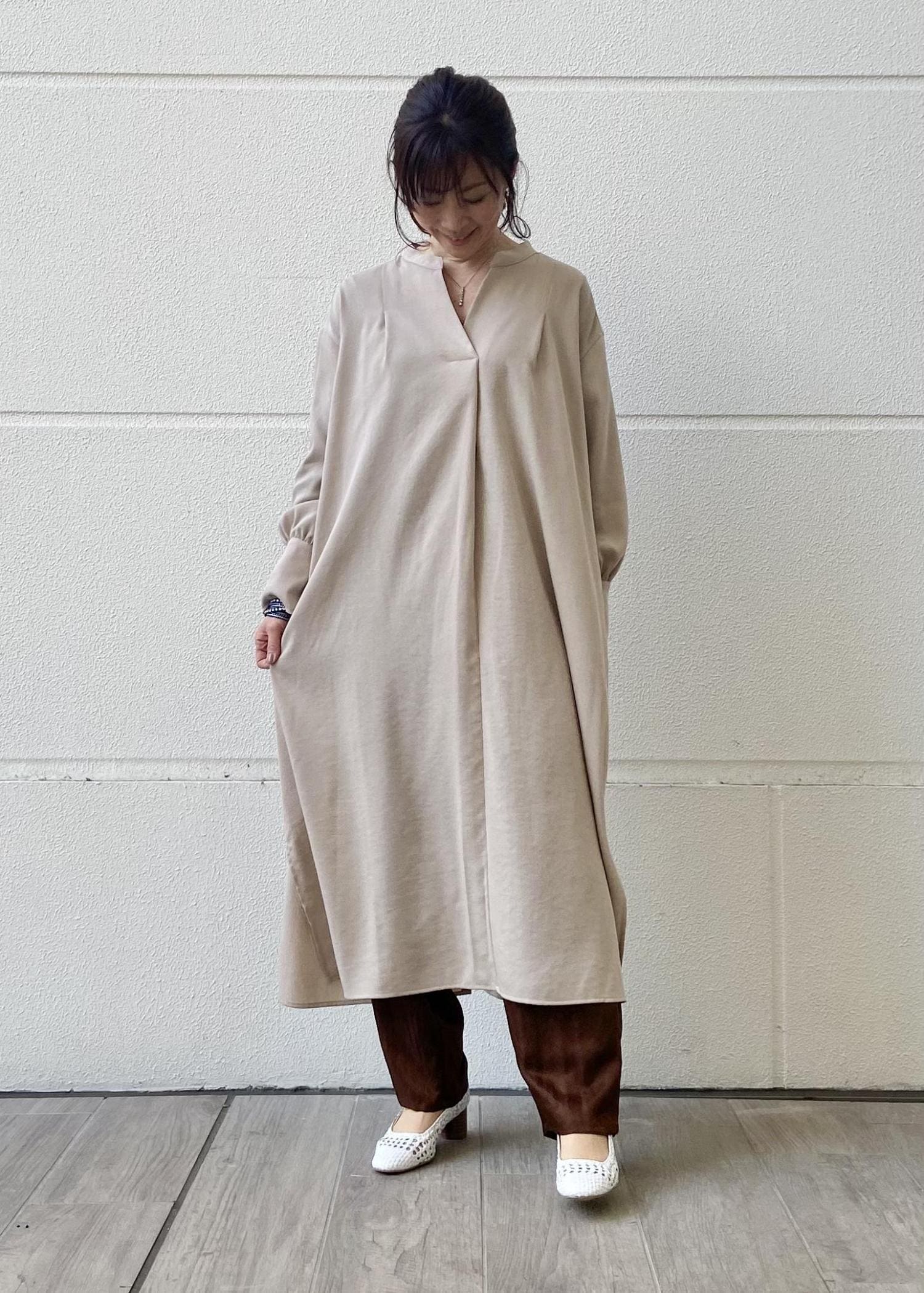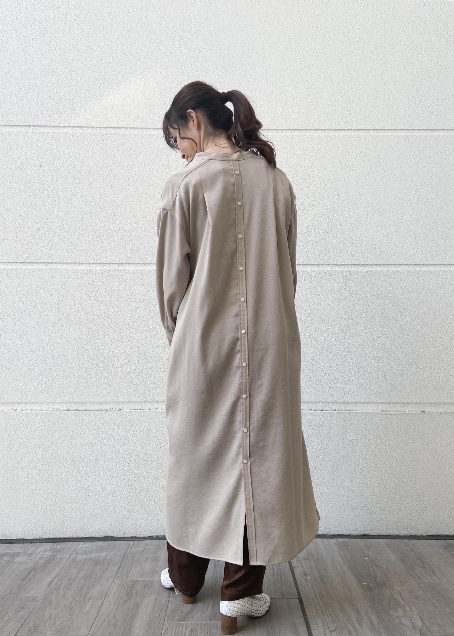 リラックスワンピースですが、バックボタンがアクセントとなり、全体のイメージはIラインになりますので、スッキリと着こなしていただけます。