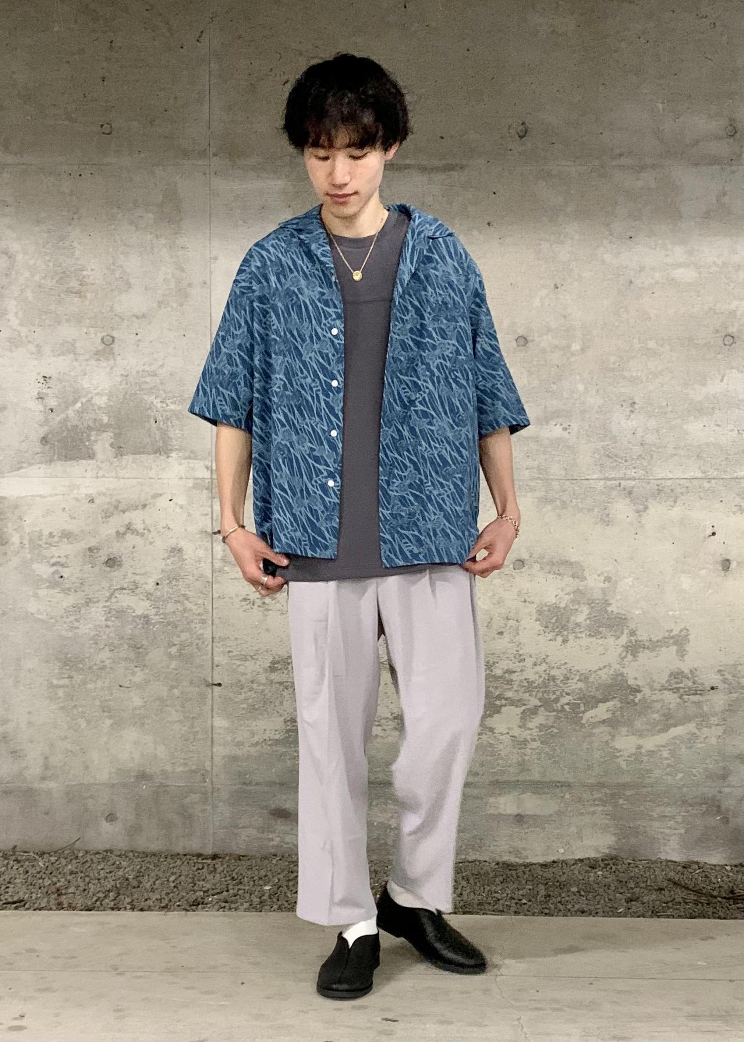 以前にも着用したウェーブワッフルオープンカラーシャツを今回は別カラーで着用しました。
