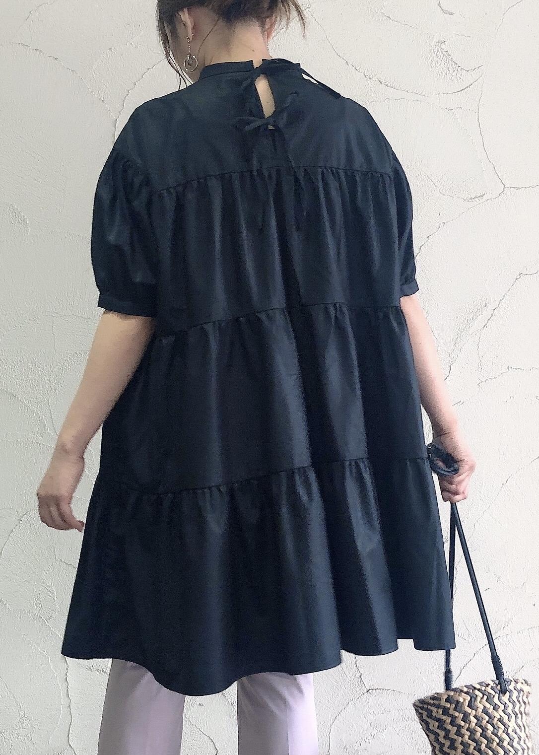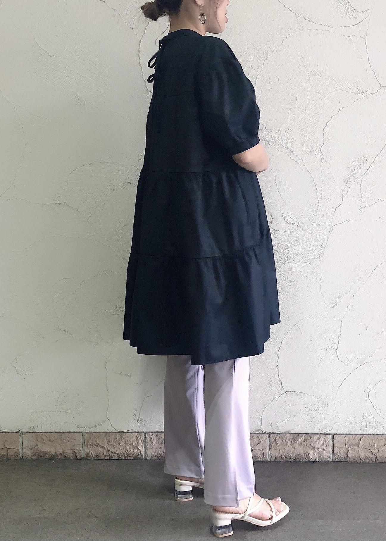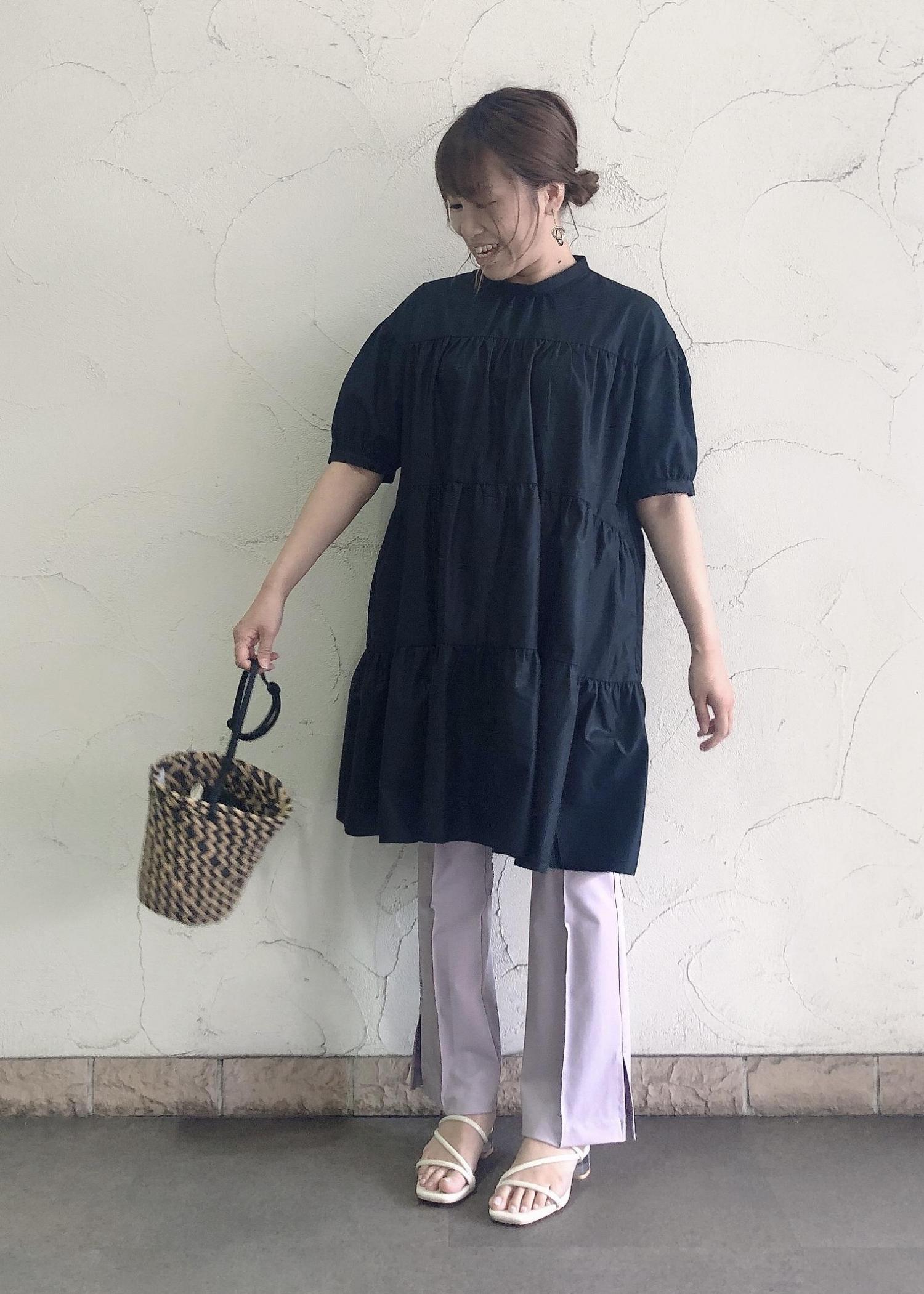 ボリュームあるティアードワンピースを低身長でもスッキリ見えるよう脚長効果のあるフレアパンツとコーデしました。 ブラックのトップスでも暗くなりすぎないようにカラーパンツと合わせて明るい雰囲気を出してます。 小物のエナメル×クリアヒールサンダルと雑材バックで夏らしさをプラスしました。