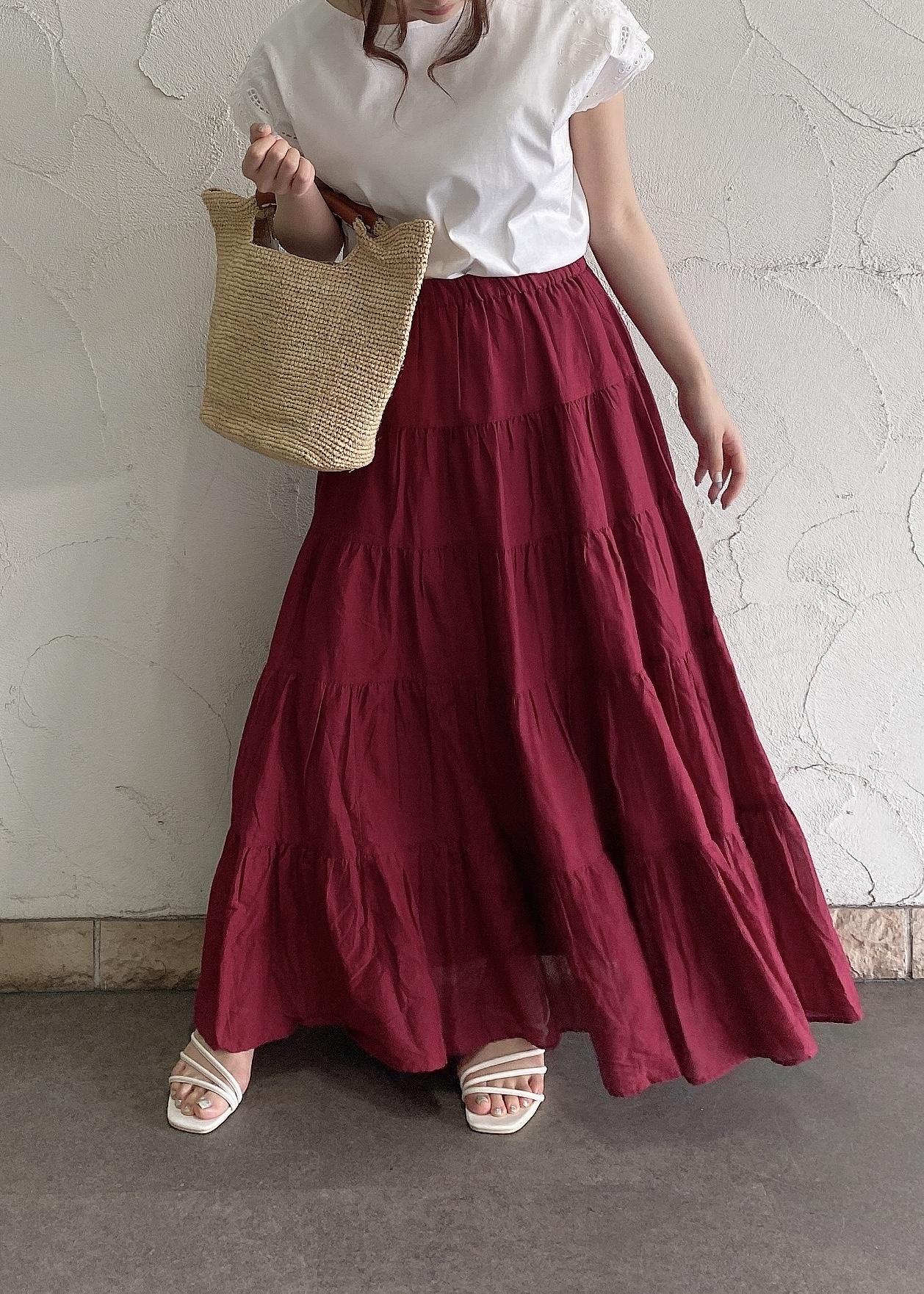 トレンド感のあるティアードスカートで女性らしいスタイリングにしてみました。