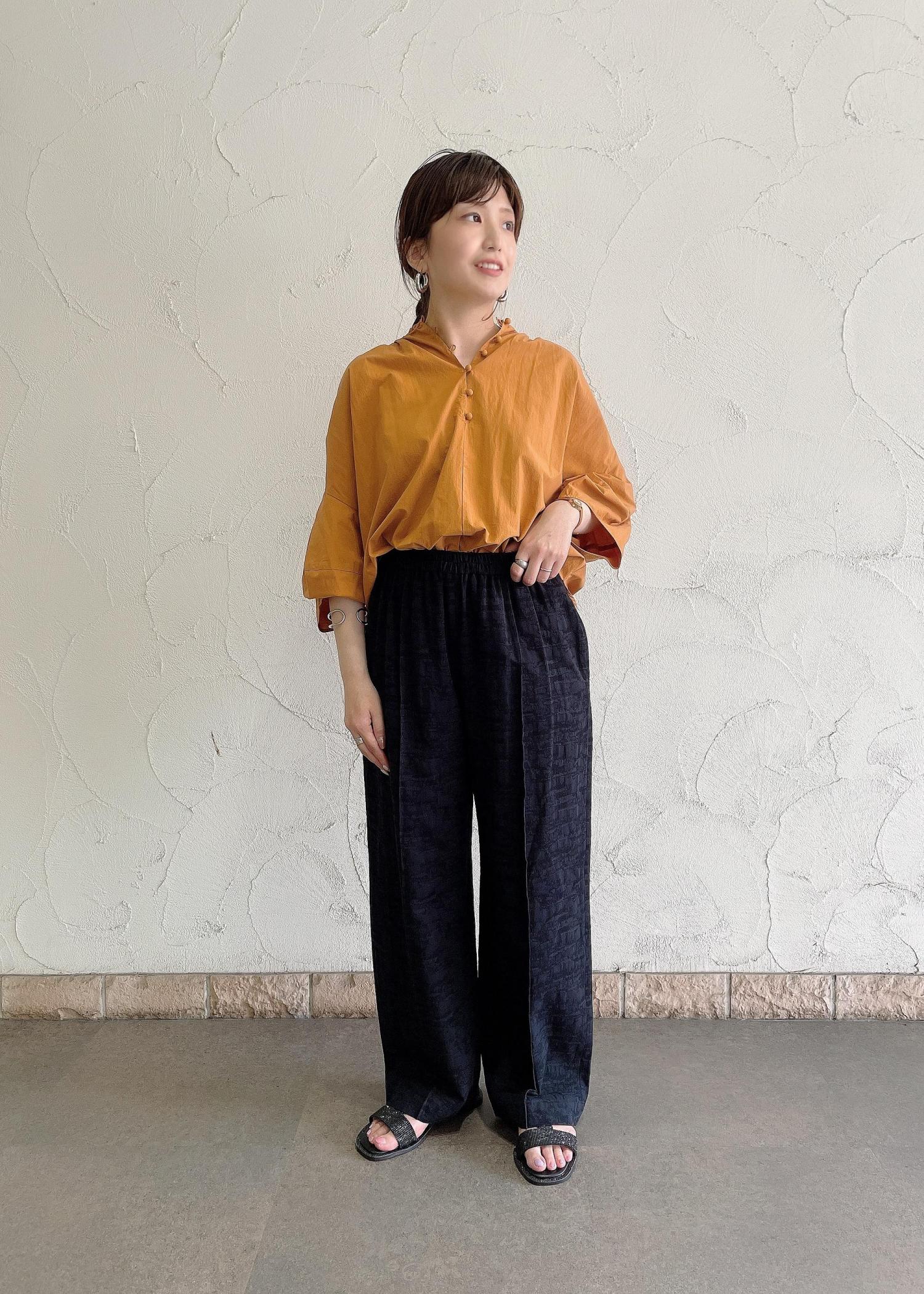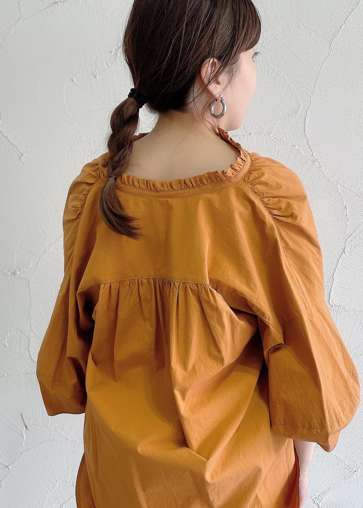 スタンドフリルカラー、丸みが可愛いくるみ釦、背中のギャザーをあしらったデザインなど、細部までおしゃれが詰まっているブラウスです。