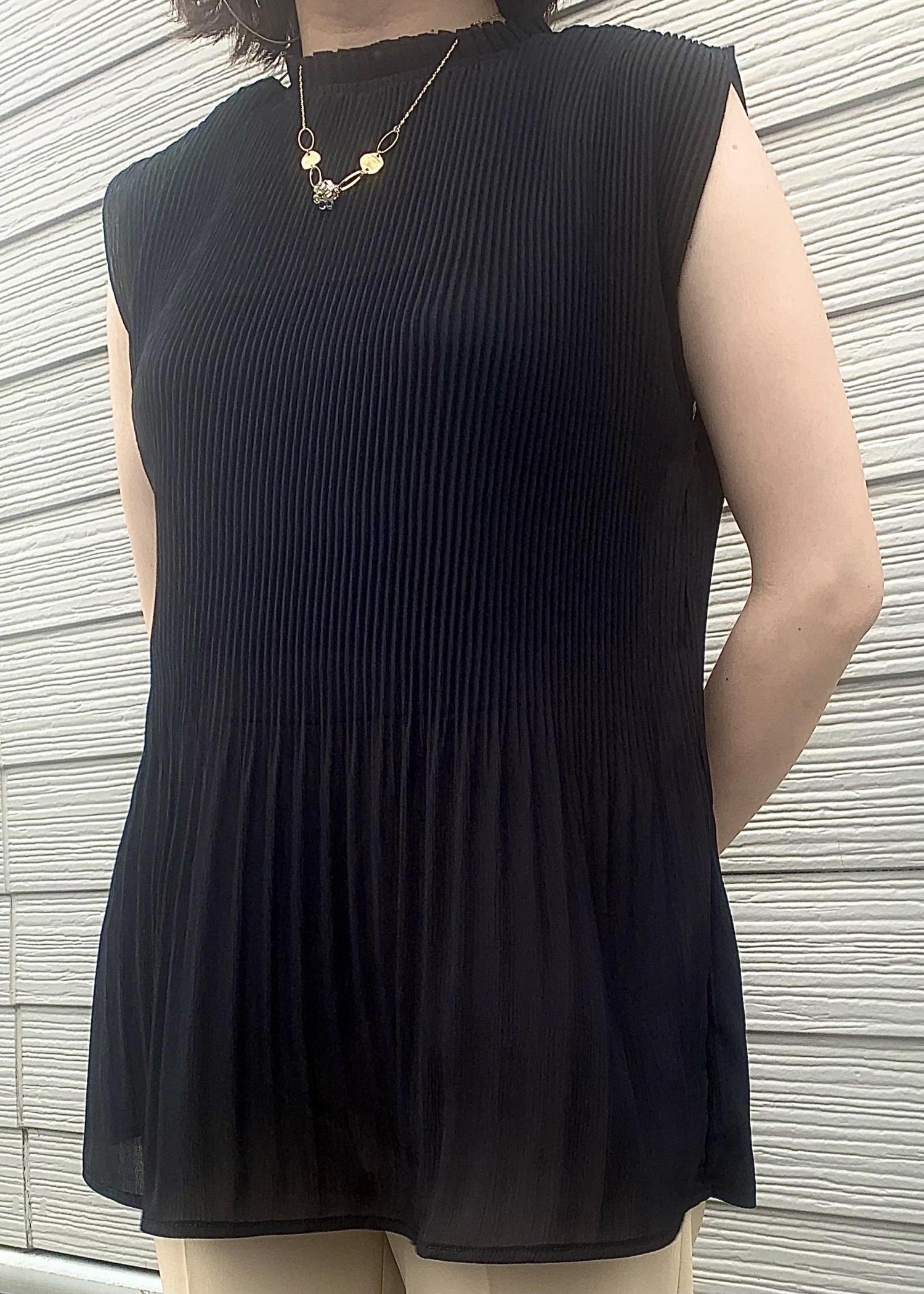 ノースリーブのプリーツトップスでキレイめパンツスタイルにしてみました。 カラーも落ち着いた色味でまとめたので、大人にも合わせて頂けます。