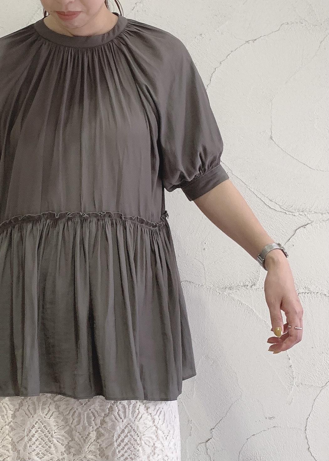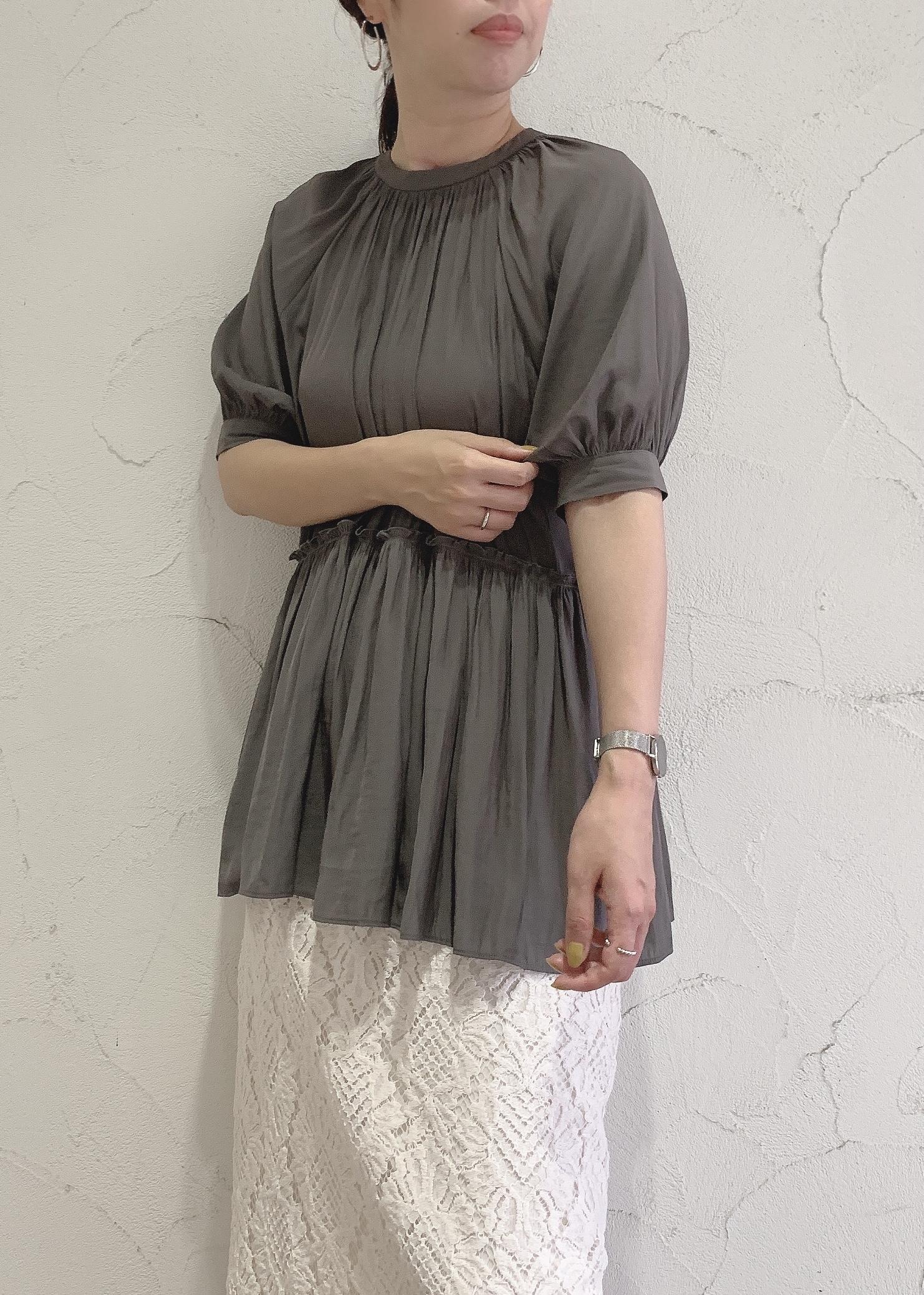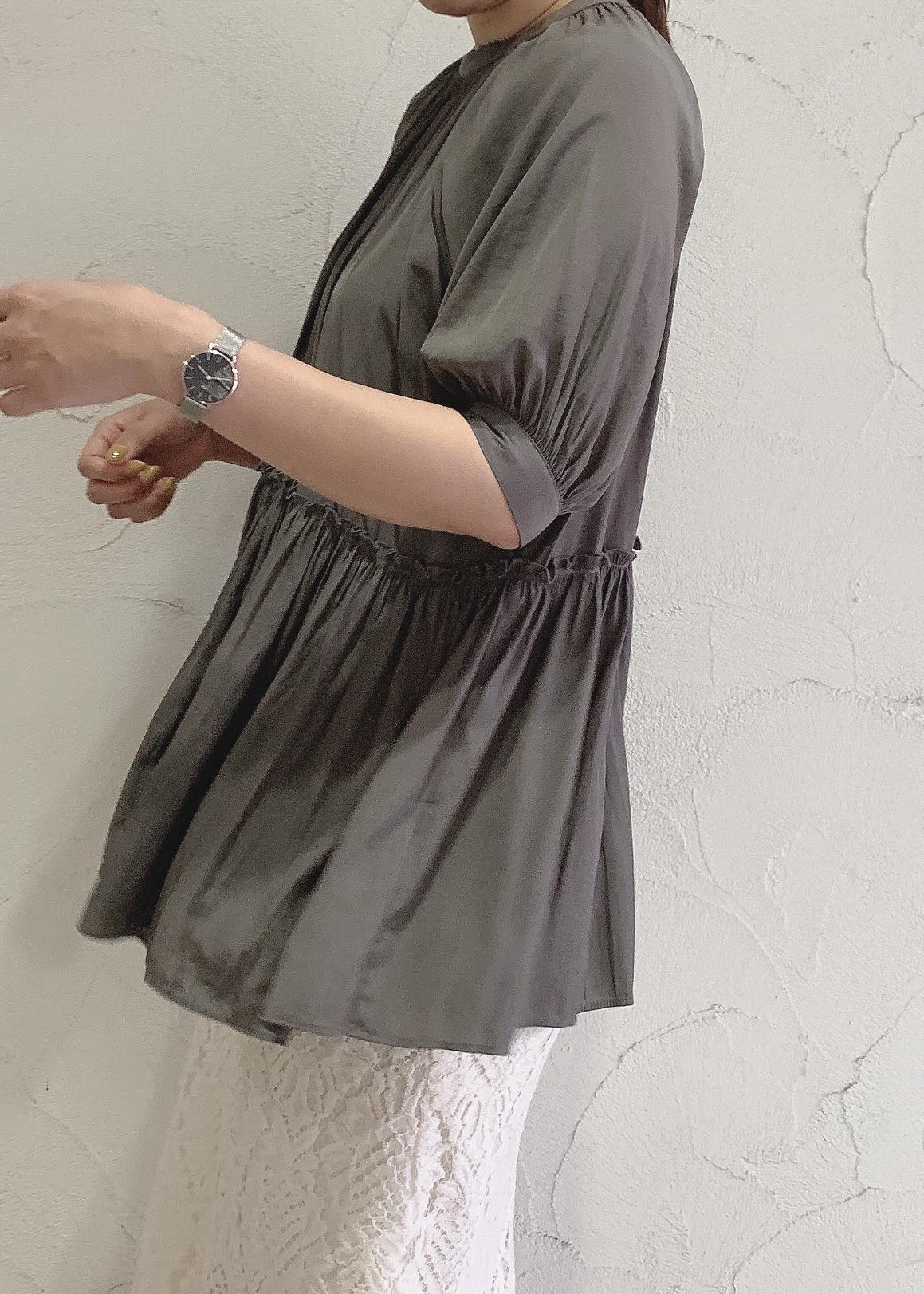 全体を落ち着いた色で纏めたシックな夏のスタイリング。 ウエストにギャザーがたっぷりの可愛いブラウスなので、色味を落ち着かせて大人女性に馴染むコーディネートに。 総柄のエレガントなレーススカートをグレーのブラウスで引き立たせた夏コーデです。