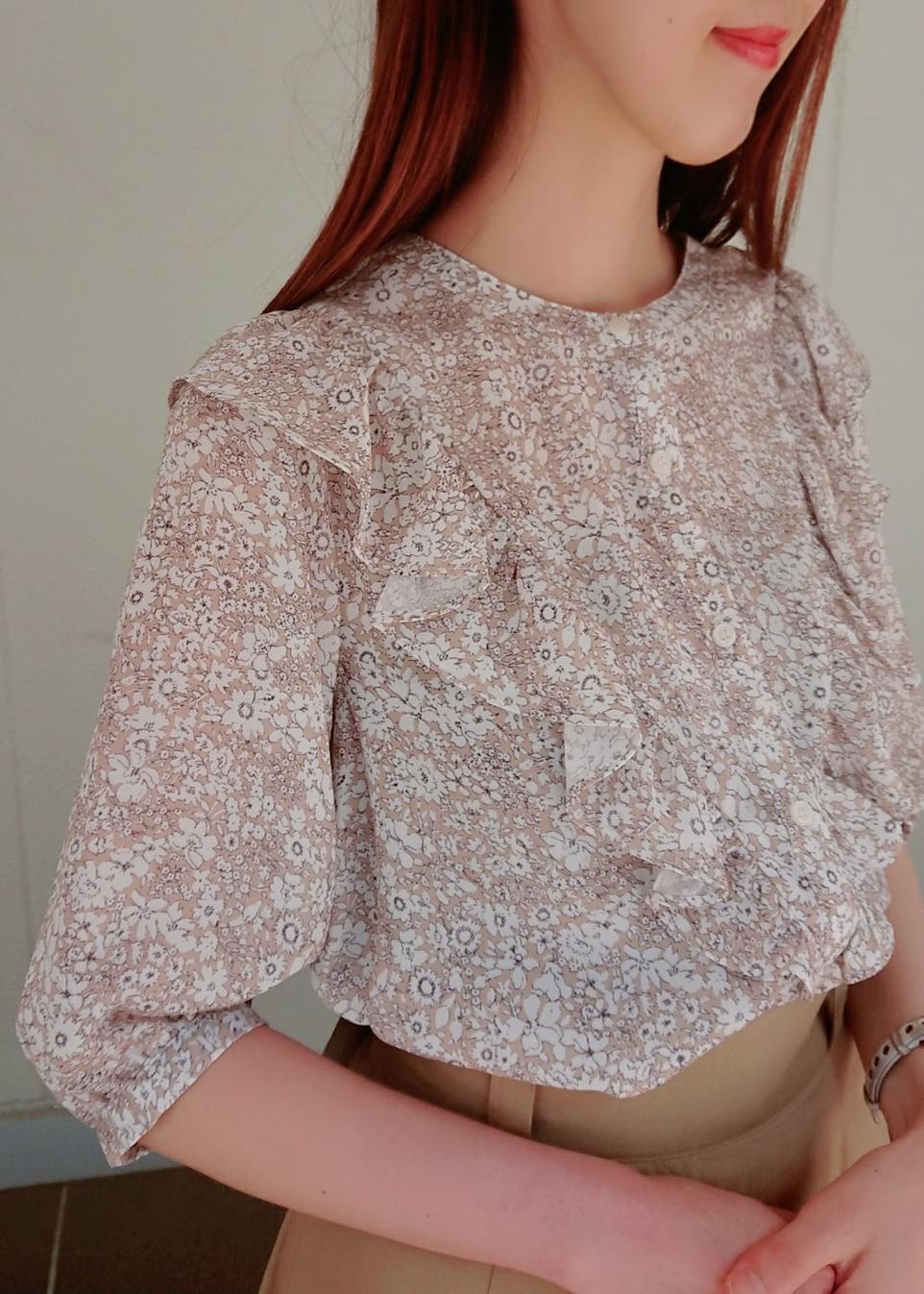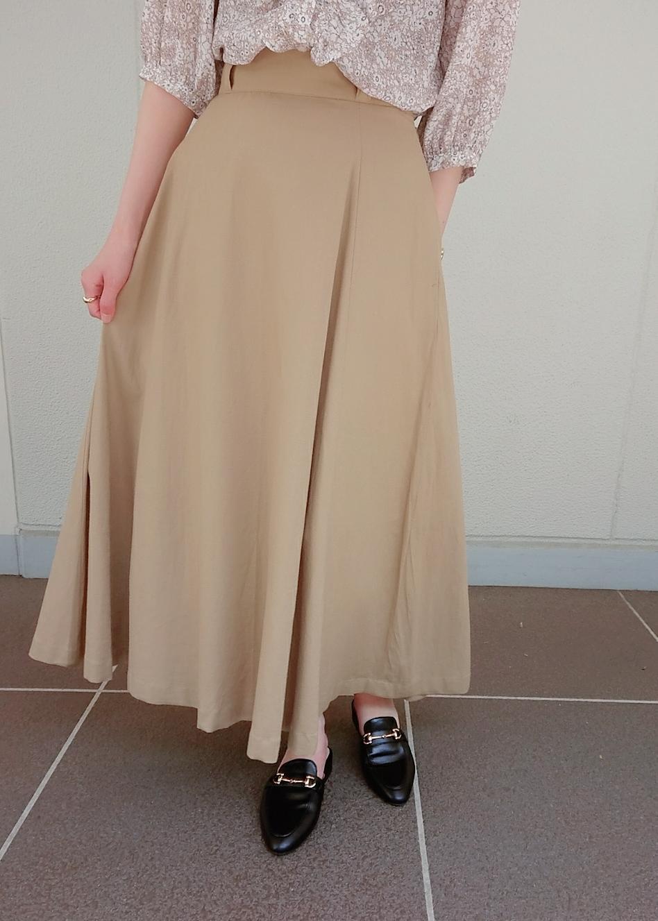 トップスは花柄でフリルたっぷりなブラウスなので、ベージュのロングスカートでトップスの甘さを押さえたコーディネートにしました。