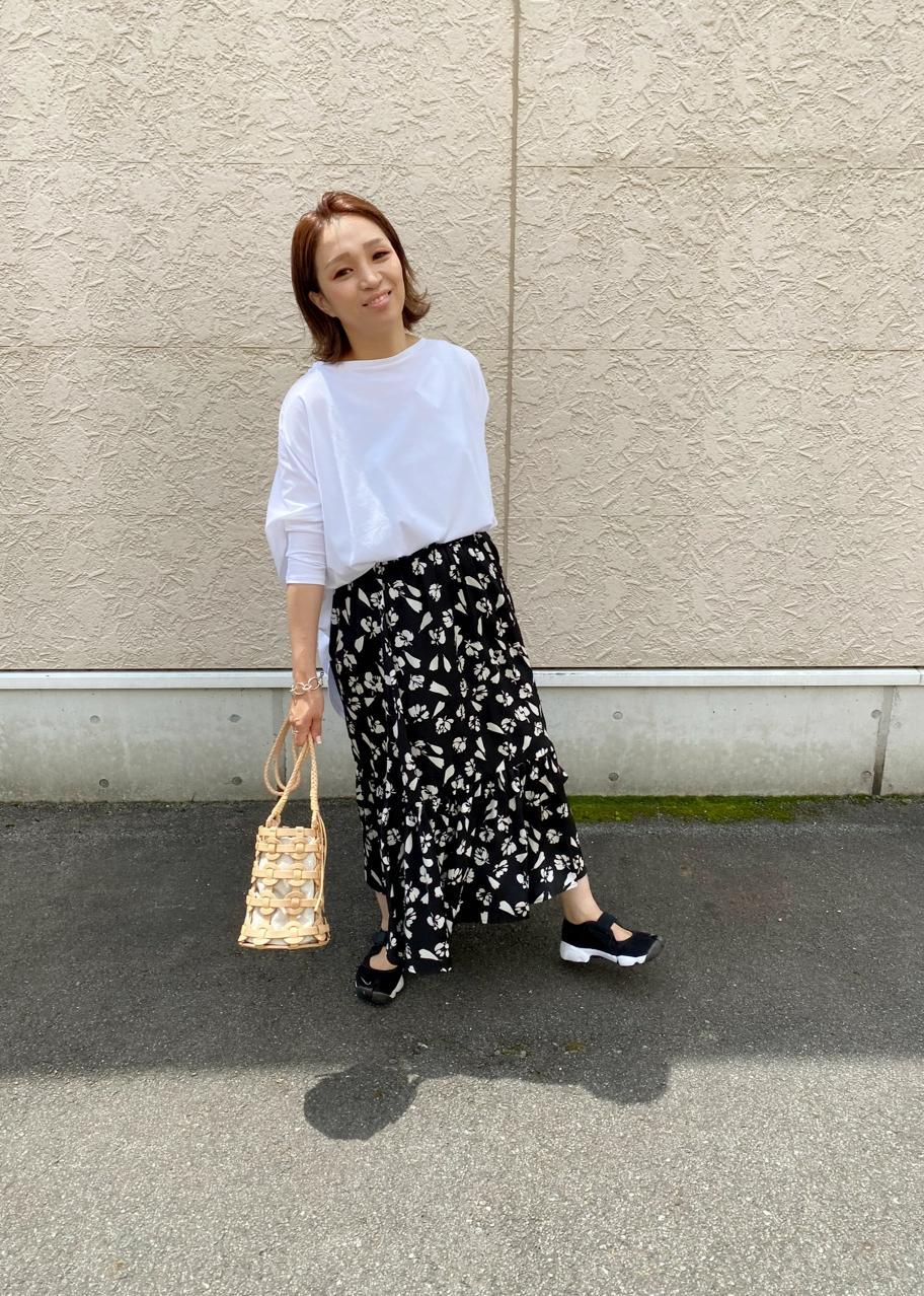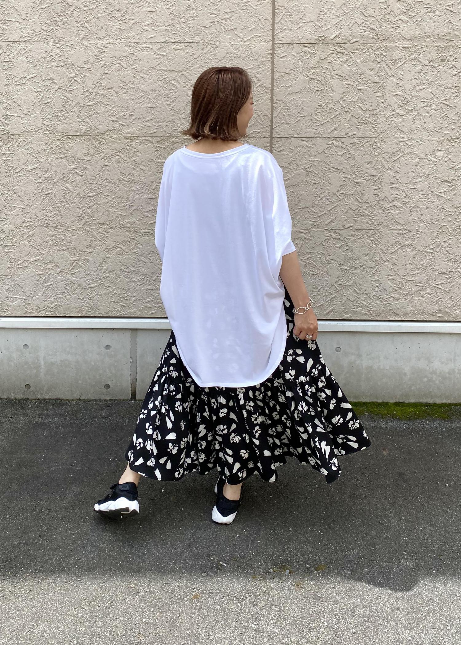 今季流行りのマーメイド型のボリュームスカートも柄が大判なので、