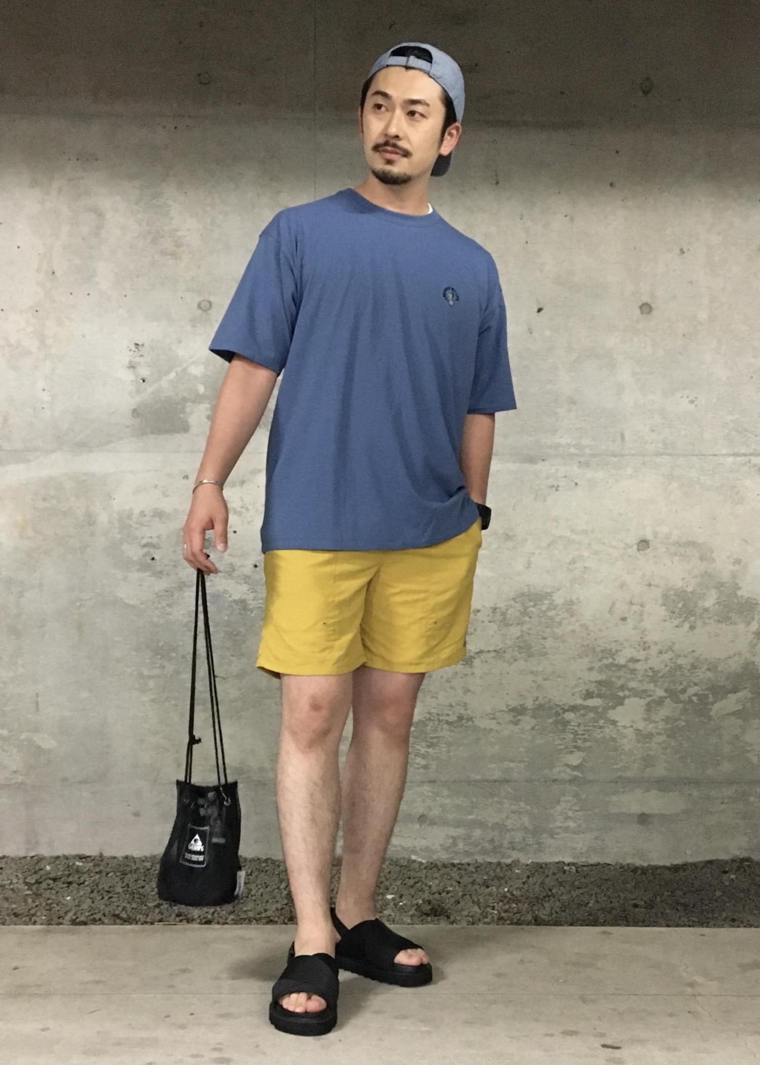 レジャー、アウトドアシーンにオススメのコーデです。 メインのプリントTに合わせてキャップとショーツはカラーリンクさせ、原色使いでもまとまりを持たせました。 サンダル、バッグはスポーティな黒で締めて、ラフな中にもスタイリッシュさを。 TシャツはLL.ショーツはMサイズを着用しています。
