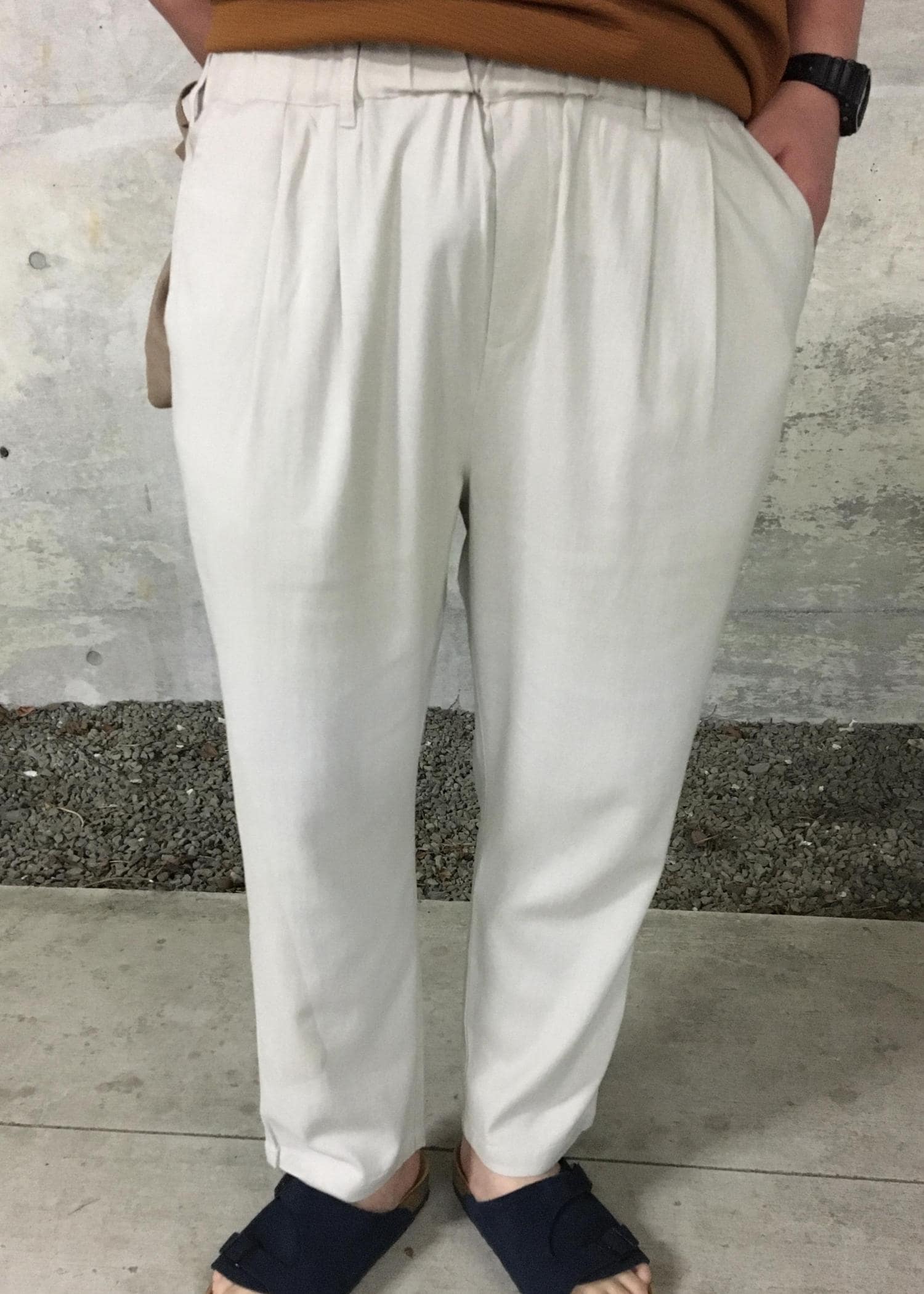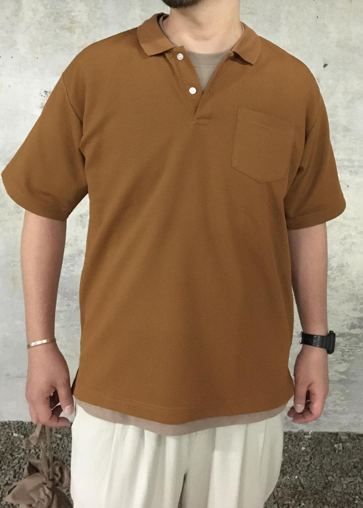 テラコッタのポロをメインにしたナチュラルなカジュアルスタイルです。 "ややゆったり"なポロシャツにブラウンのTシャツを挟んで暖色のグラデーションで組み、麻混のイージーパンツとスウェード小物で雰囲気アップ!