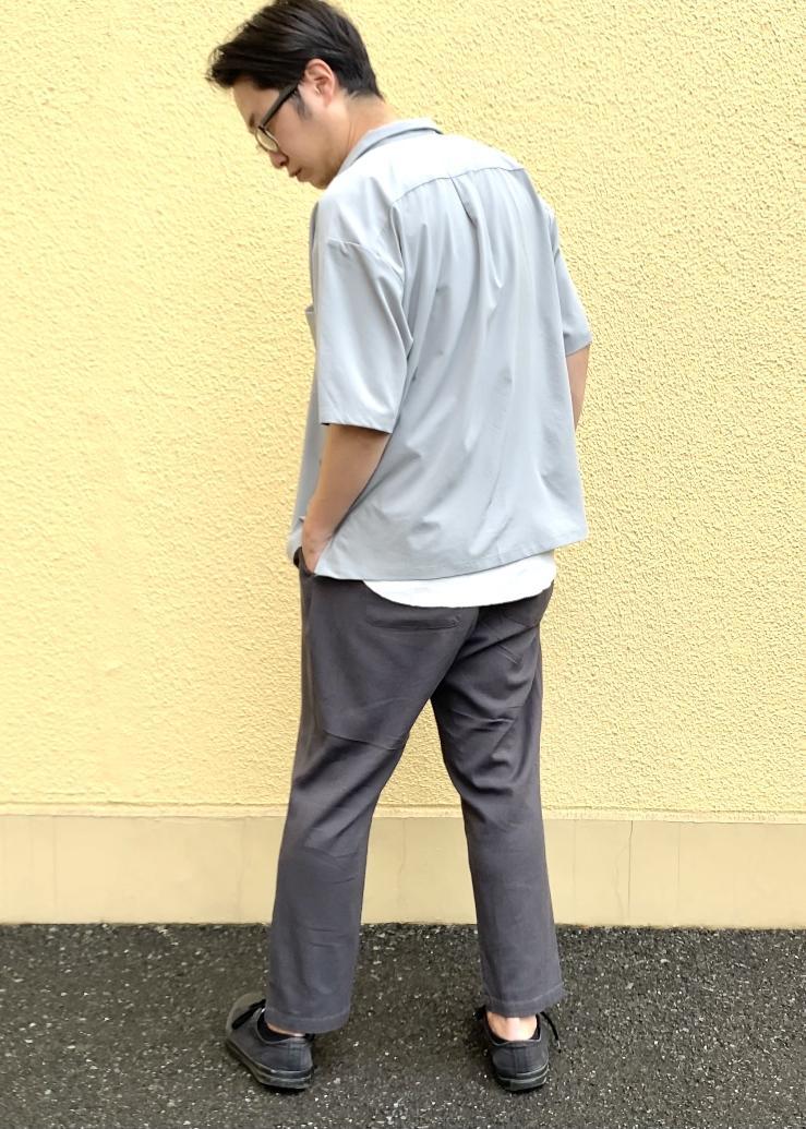 どれもくすんだようなカラー展開ですが、トレンド感のあるミント色のシャツをグレーのボトムで合わせました。 トップスもボトムも緩めなスタイルで、通気性も良いので、ジメっとする天候でも涼しく着れるのがポイントです。