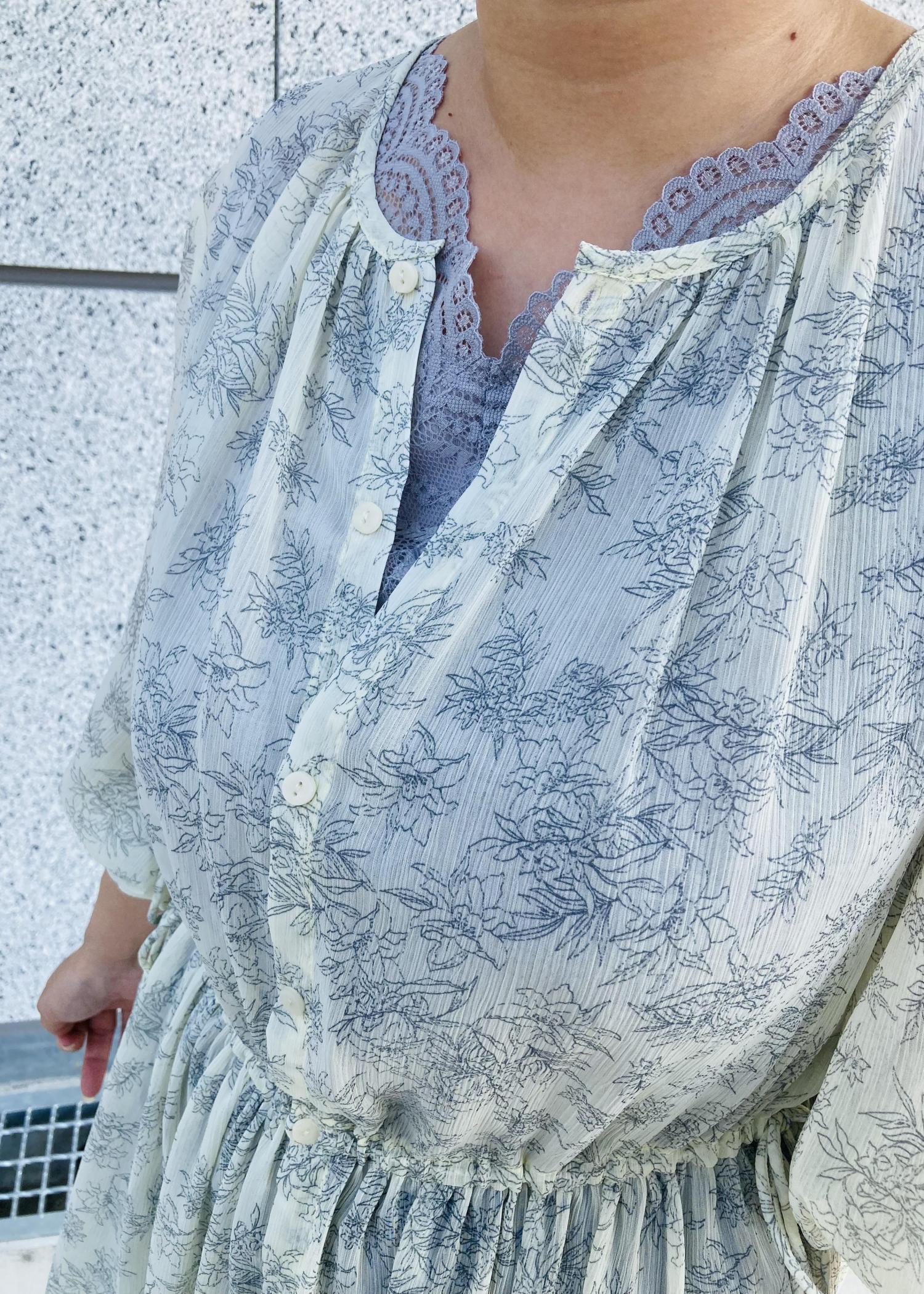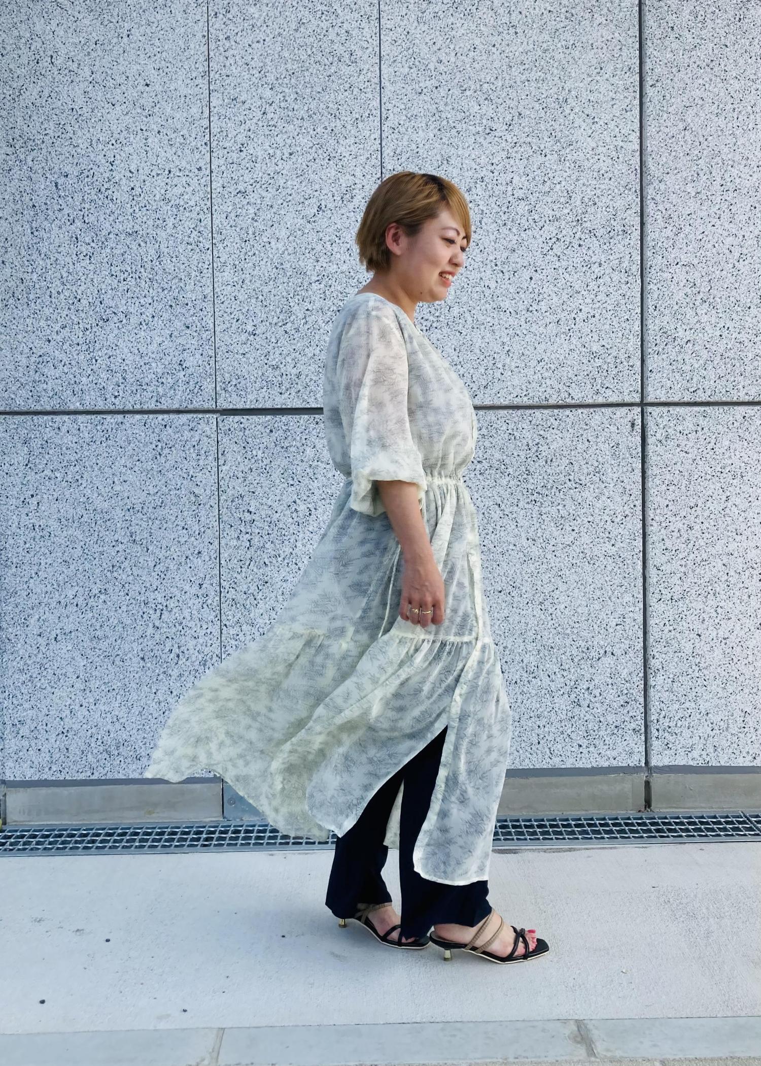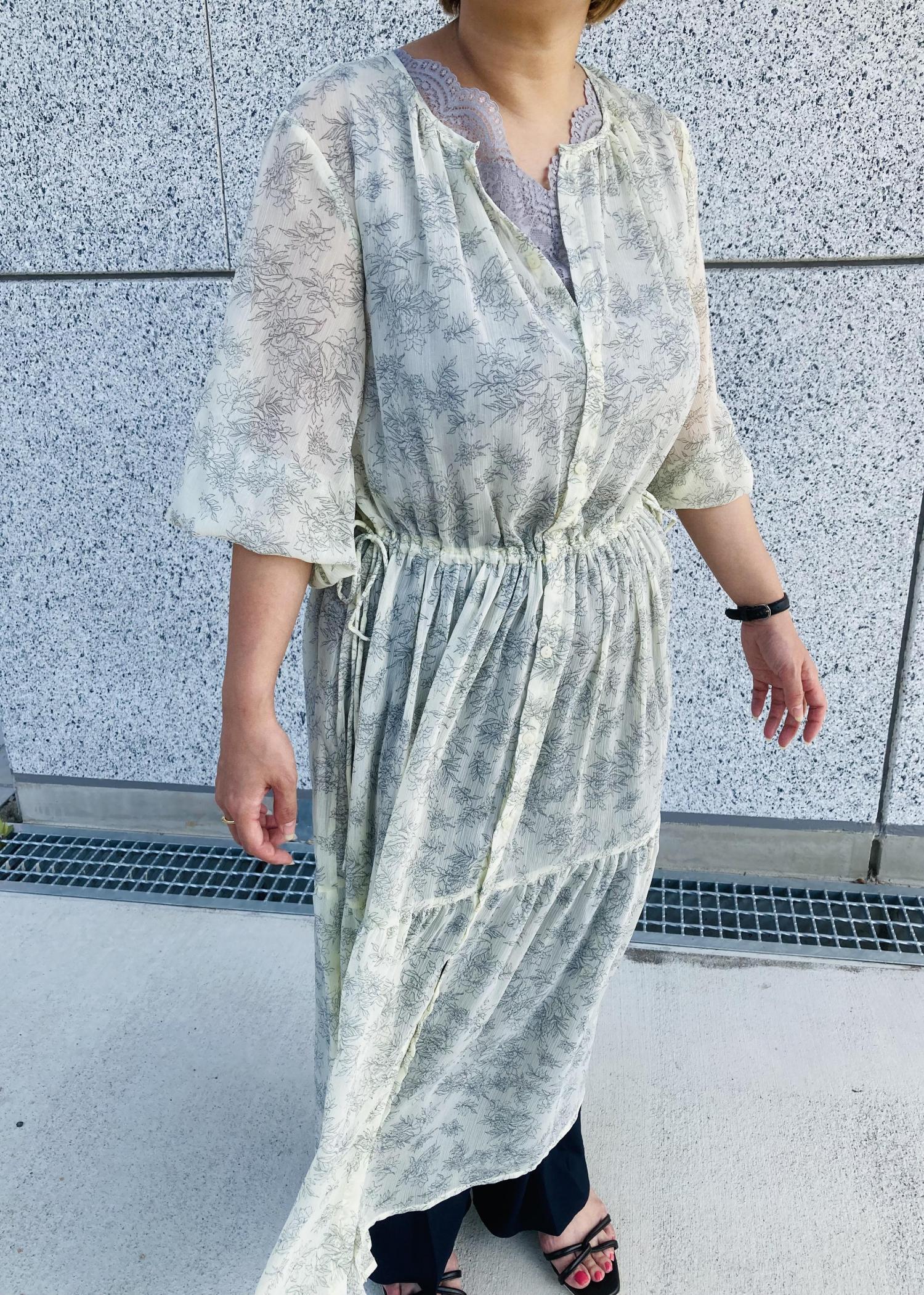 シアー花柄ワンピースをメインにしたレイヤードコーデです。