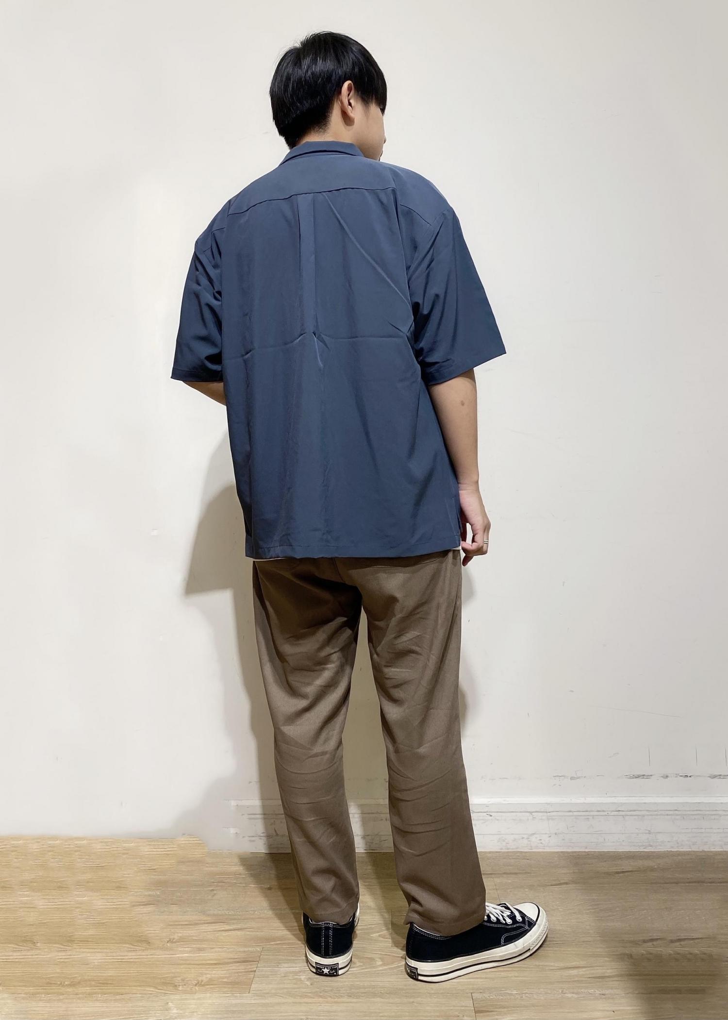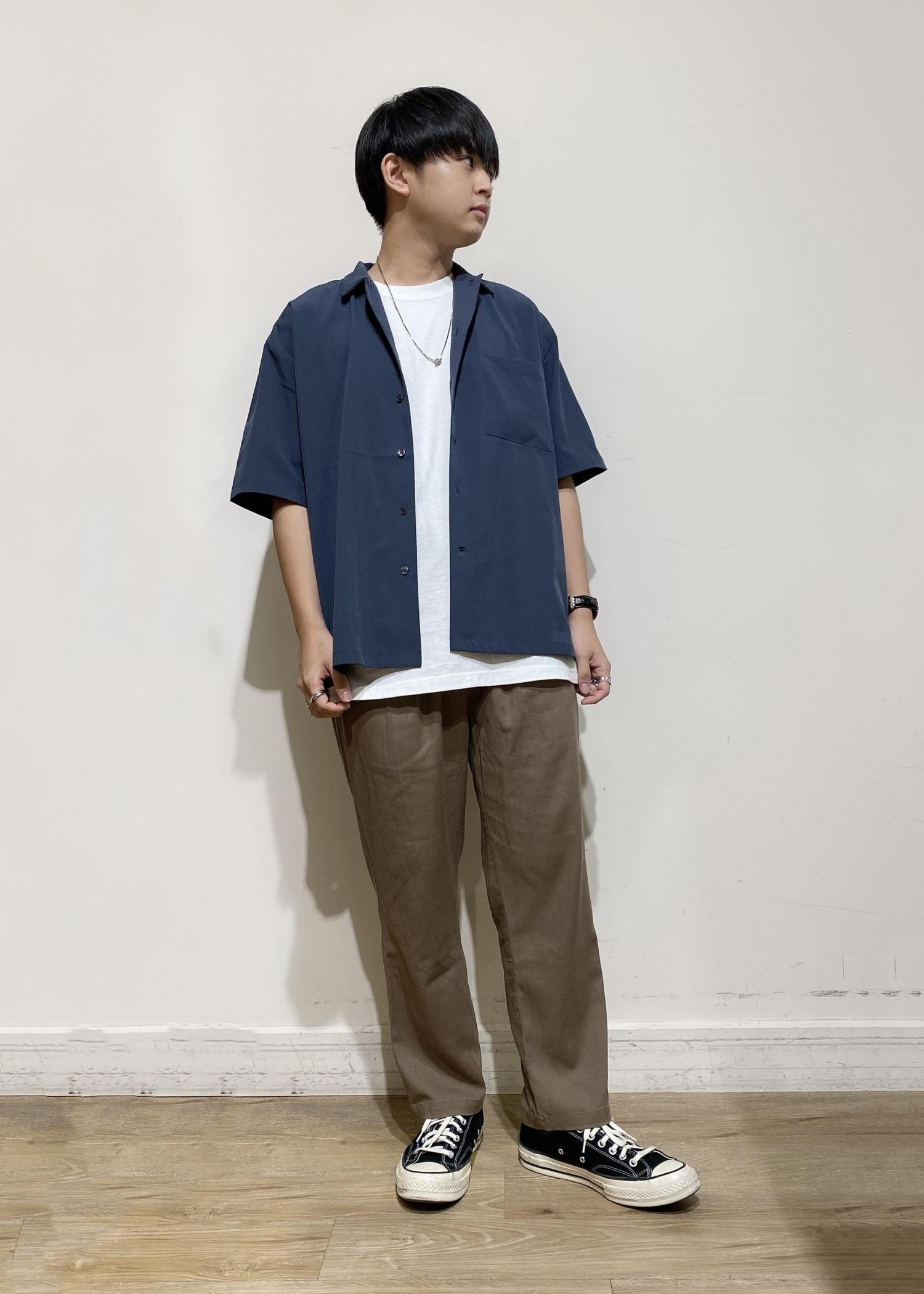 ドレープオープンシャツとワイドパンツを使った爽やかなコーディネートです。暗めの羽織にアースカラーのボトムと白いインナーで爽やかさをプラス!