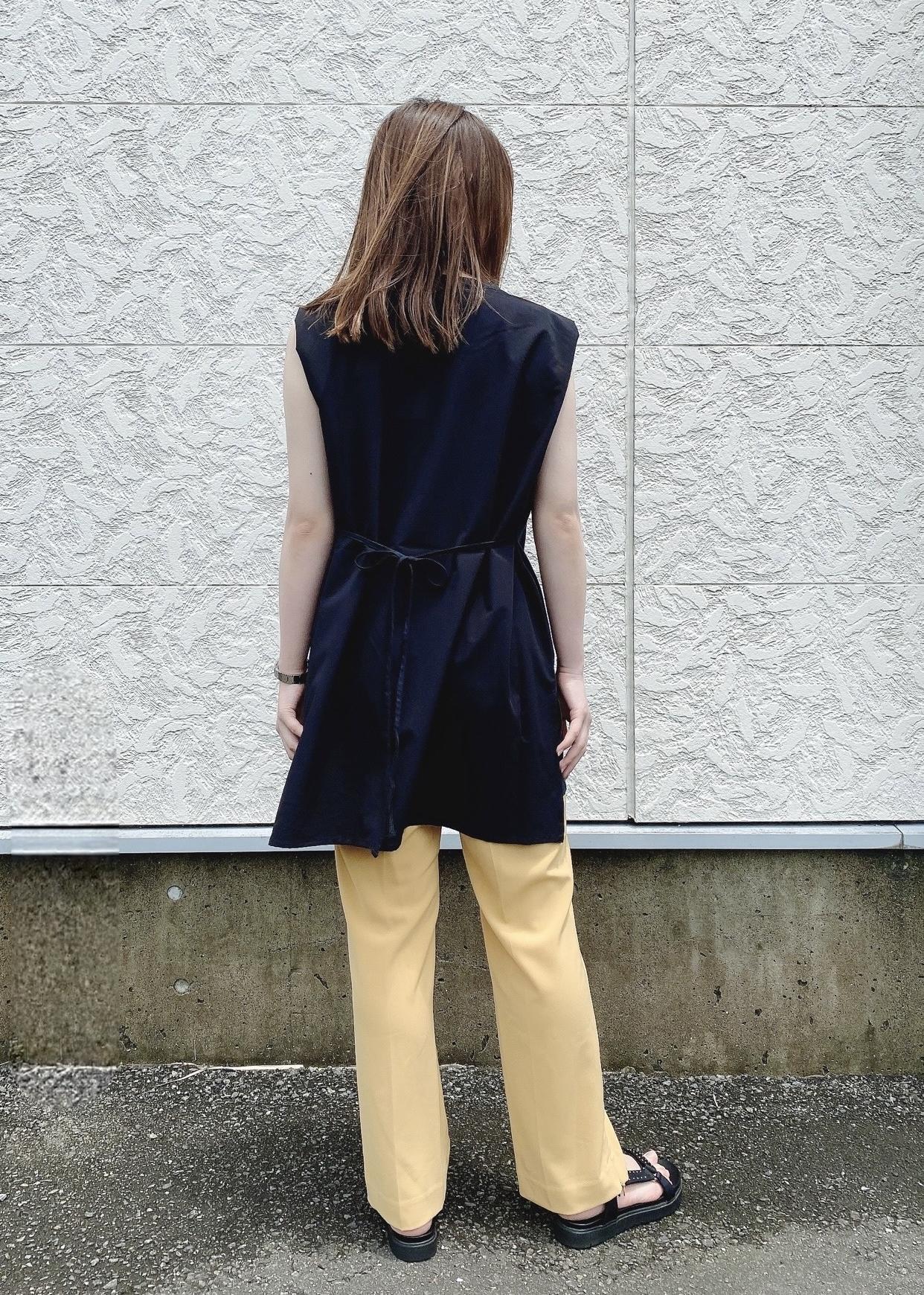 トップスの紐ベルトでシルエットにメリハリが出るので、ボトムを選びません。