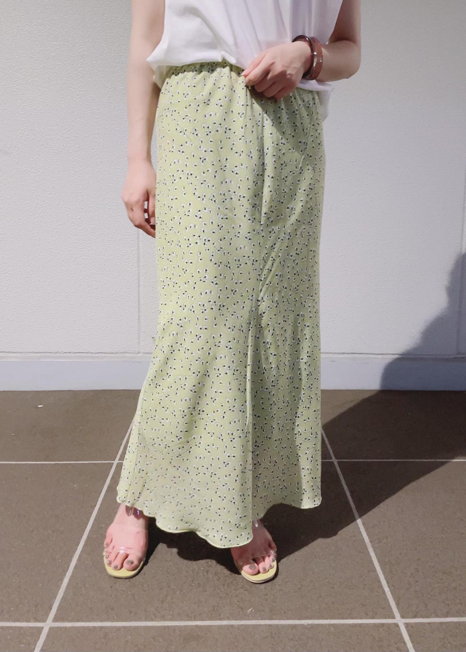 イエローの花柄スカートに、チュニック丈のトップスを合わせて大人なスタイリングにしました。
