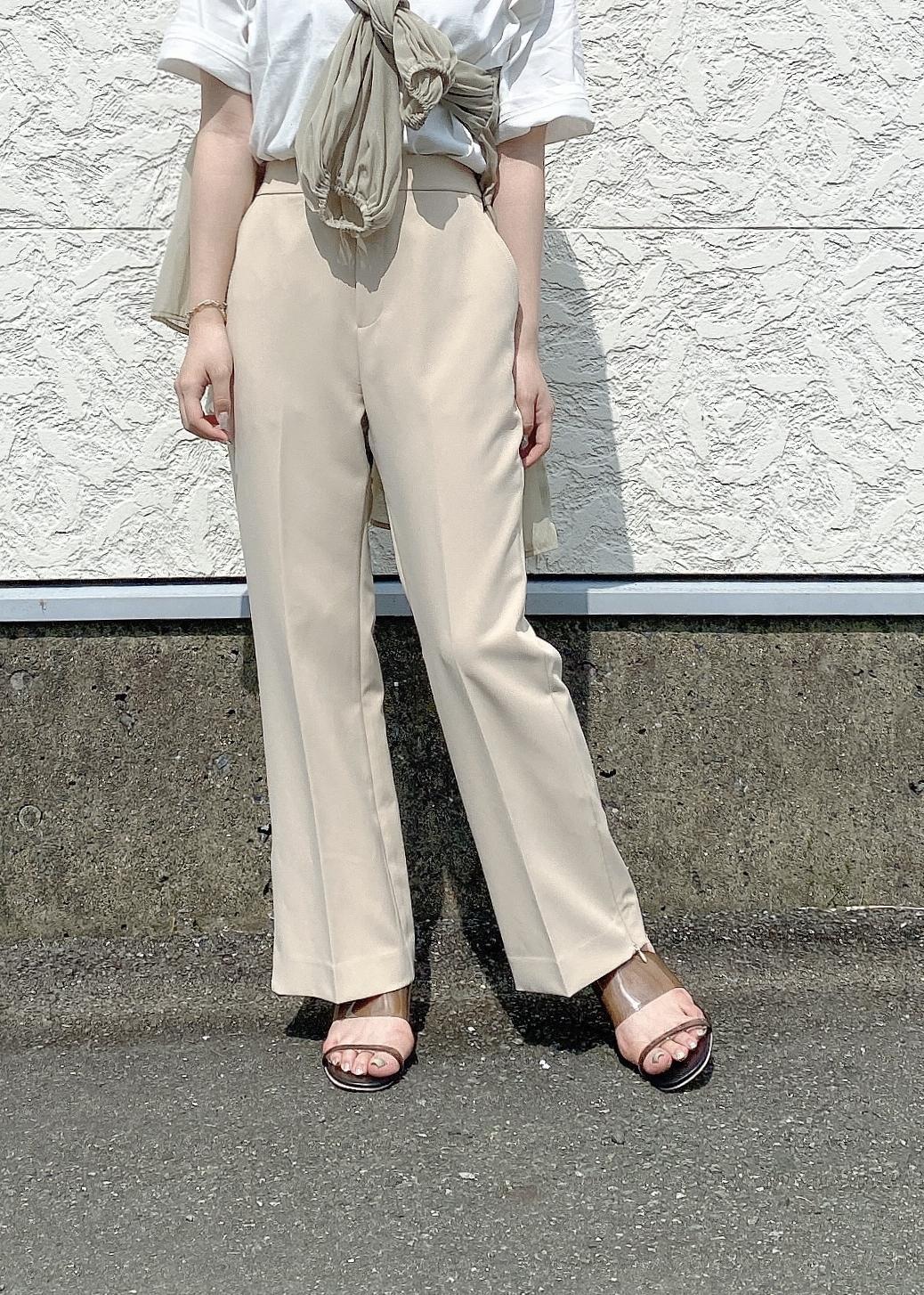 全体的にシンプルな印象ですが、シアー素材のブラウスをたすき掛けすることでトレンド感があり、こなれ感のあるスタイリングに。