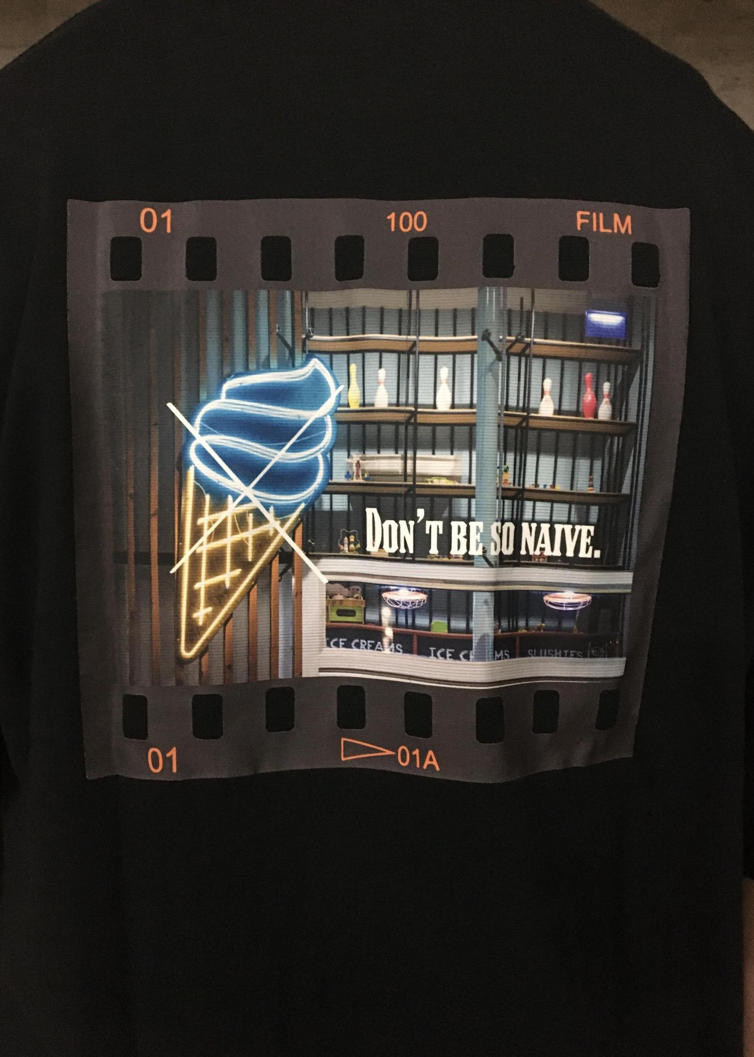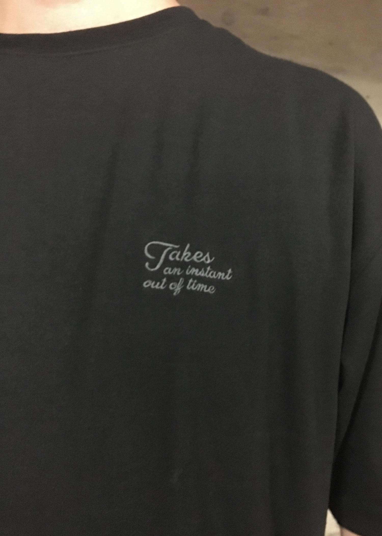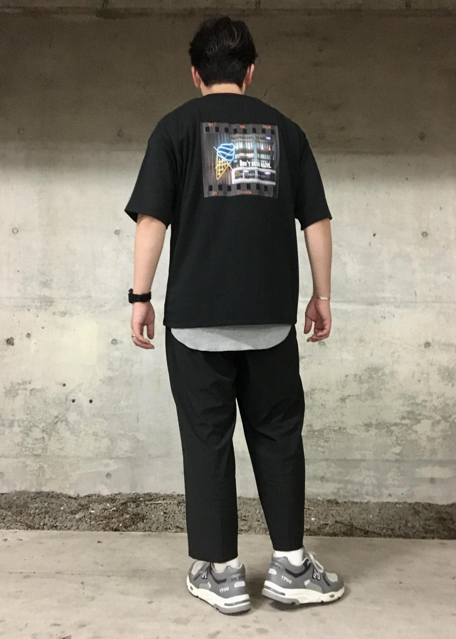 ご覧頂きありがとうございます。 グラフィックフォトTをポイントにしたブラックコーデです。 ドレープ感のある素材且つビッグシルエットで黒ベースでも涼しく、快適。 Tシャツは映画のフィルム風バックプリントが非常にキレイに施されていて《感動もの》です。 左胸の刺繍もなんだか気分なフォント。 クールなスタイルがお好みの方にオススメです。