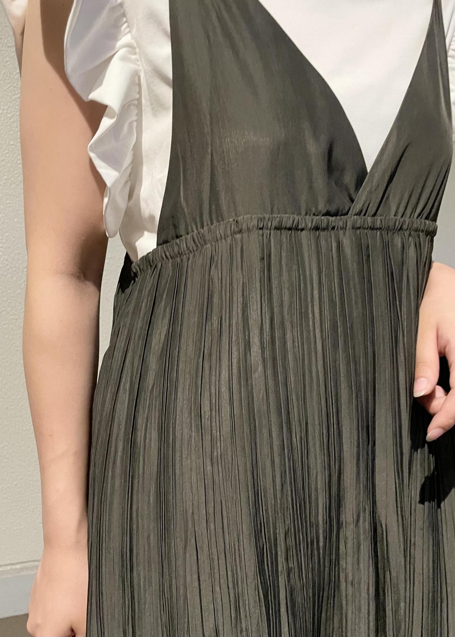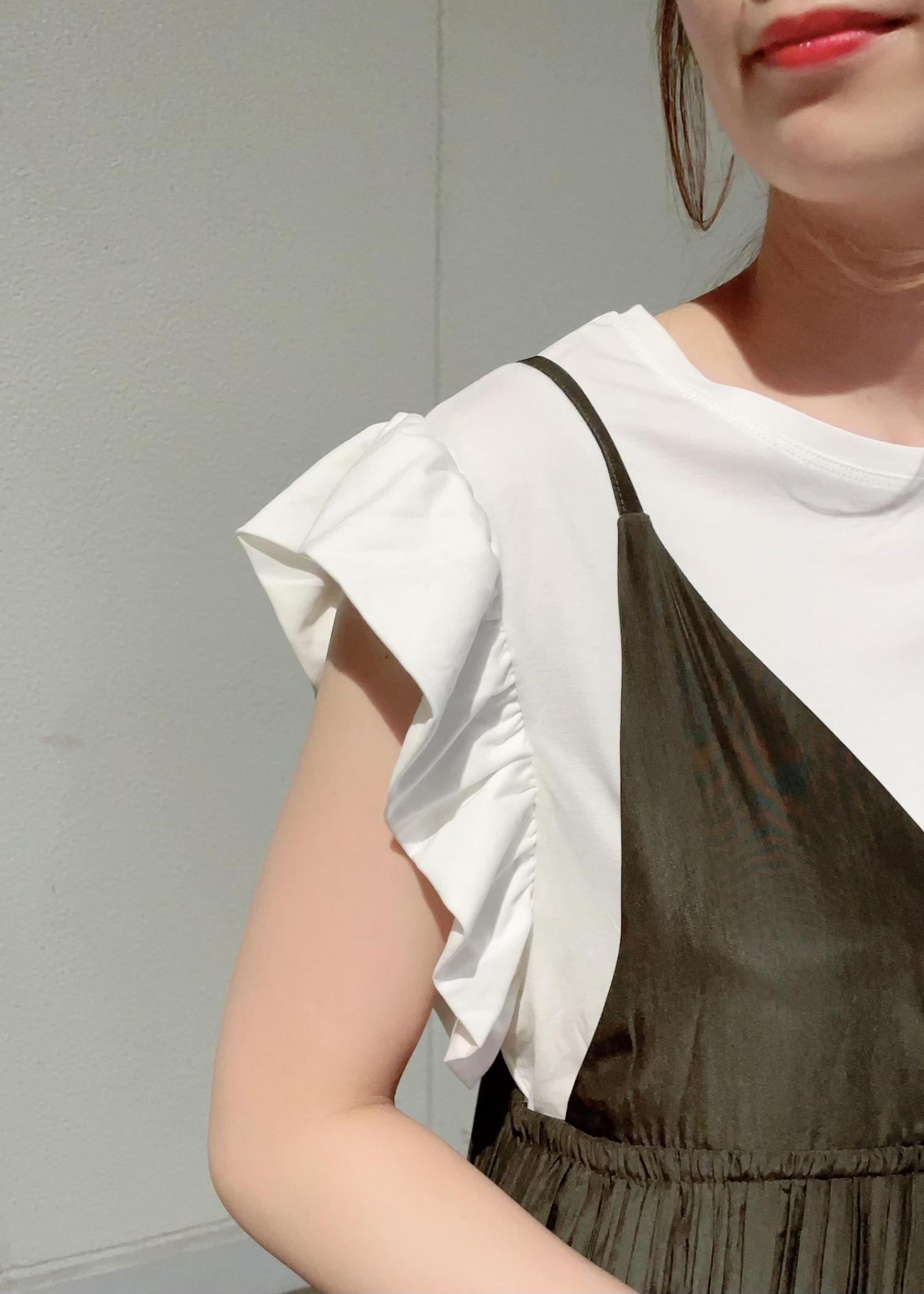 トレンド感のあるキャミワンピースと、フリルスリーブのトップスを合わせて今年らしいスタイルにしました。