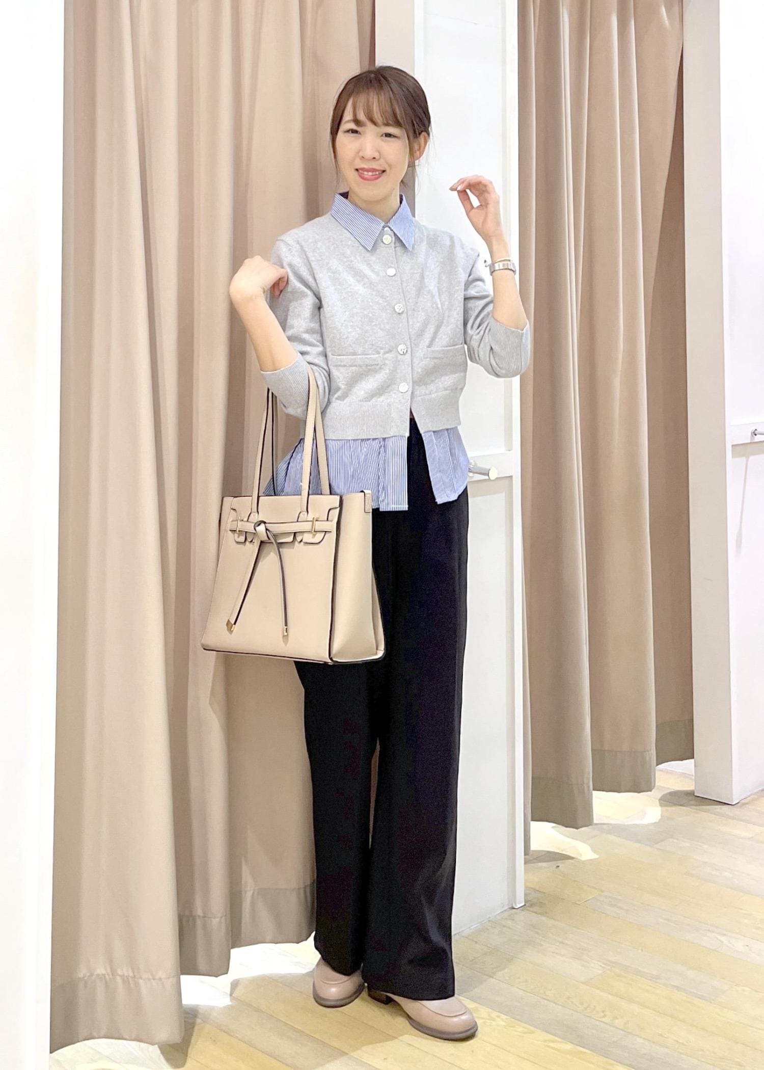 中のトップスを季節に合わせて変えて頂けると、長く着回しができてとてもオススメです◎