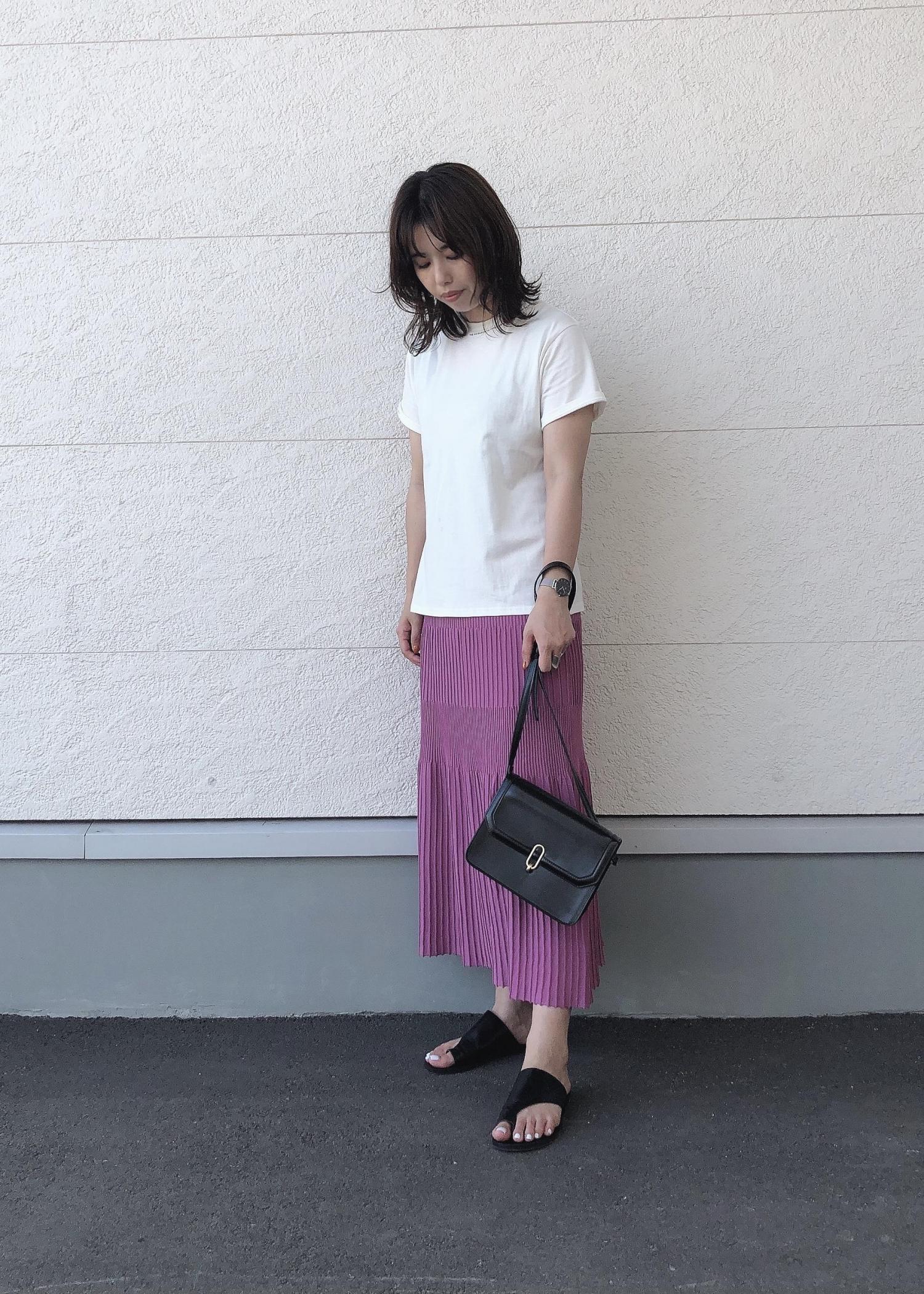 シンプルな白Tにインパクトあるピンクのスカートを合わせました。 スカート合わせでカジュアルなTシャツも女性らしいラインに◉ 夏のお出掛けコーデにおすすめです。