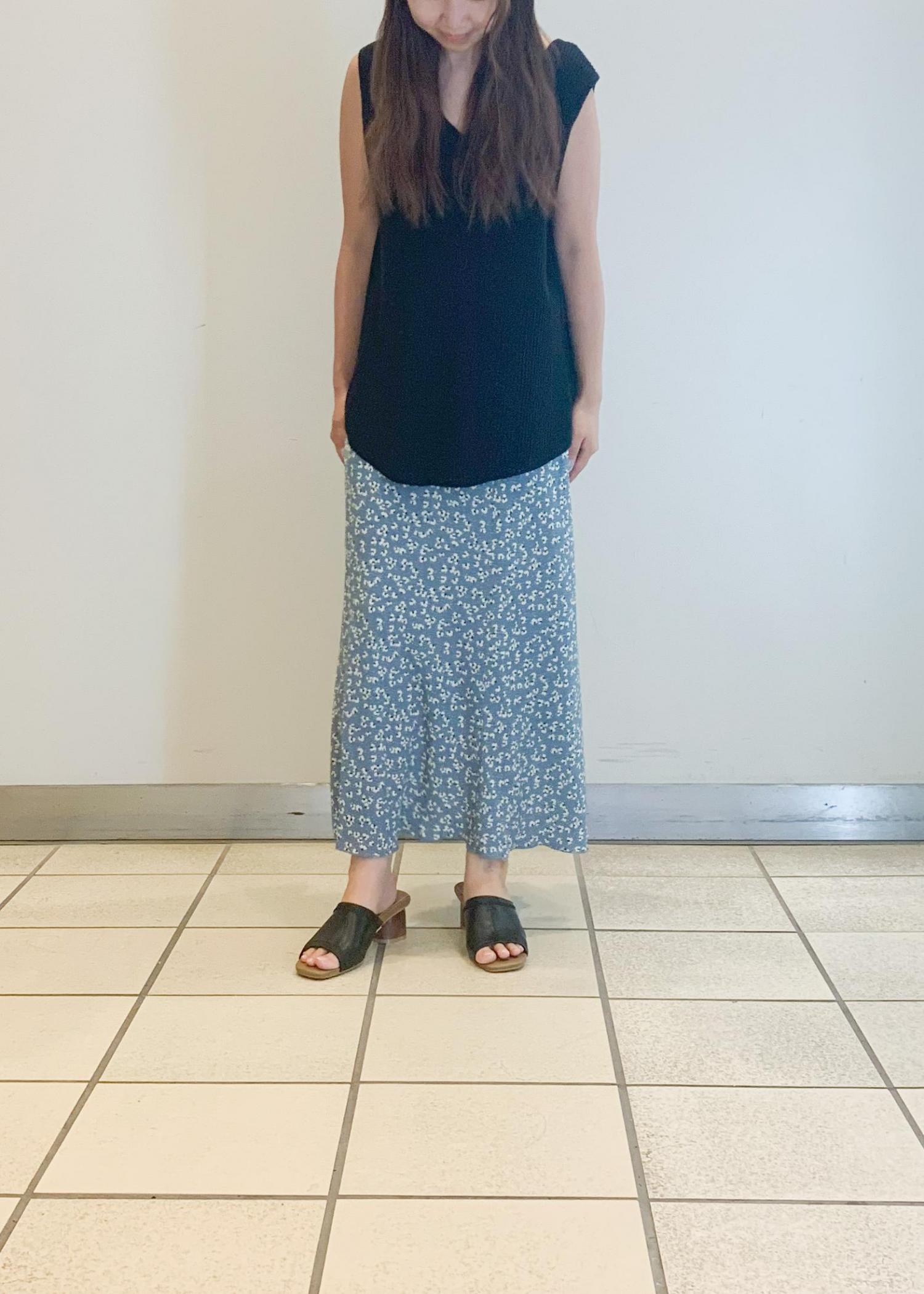 伸縮性があるので、タイトめなシルエットですが楽に着用できます。また、裾に向かって広がるマーメイドスカートなので動きやすいです。
