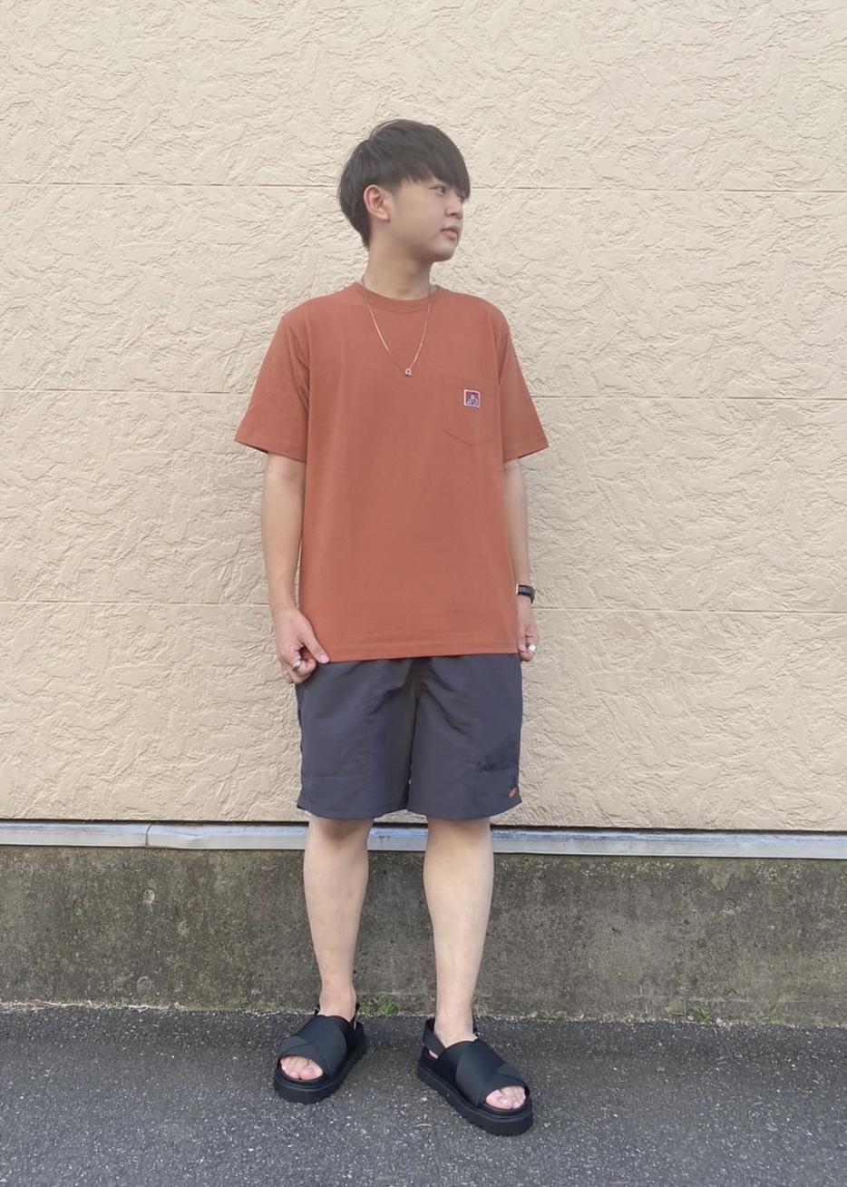 BENDAVISポケットTシャツ(AOM-11320)を使ったコーデです。シンプルながら夏に目立つ配色なので、比較的おしゃれに決まります。夏っぽさも出しつつトレンド感もあるワイドショーツとの組み合わせがおすすめです。