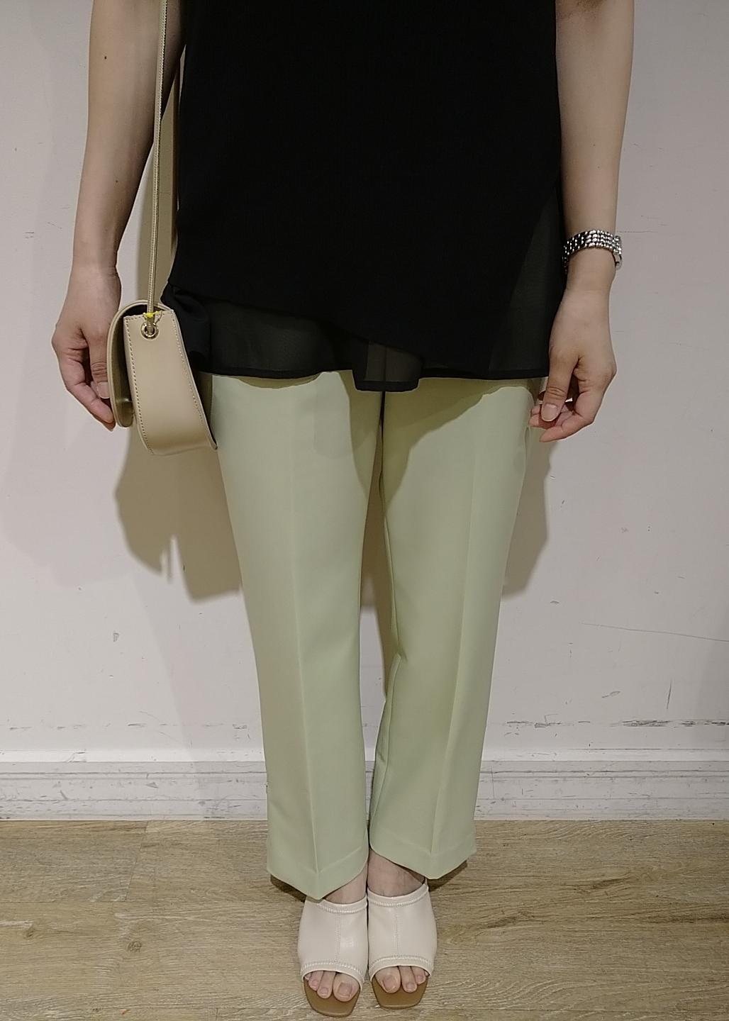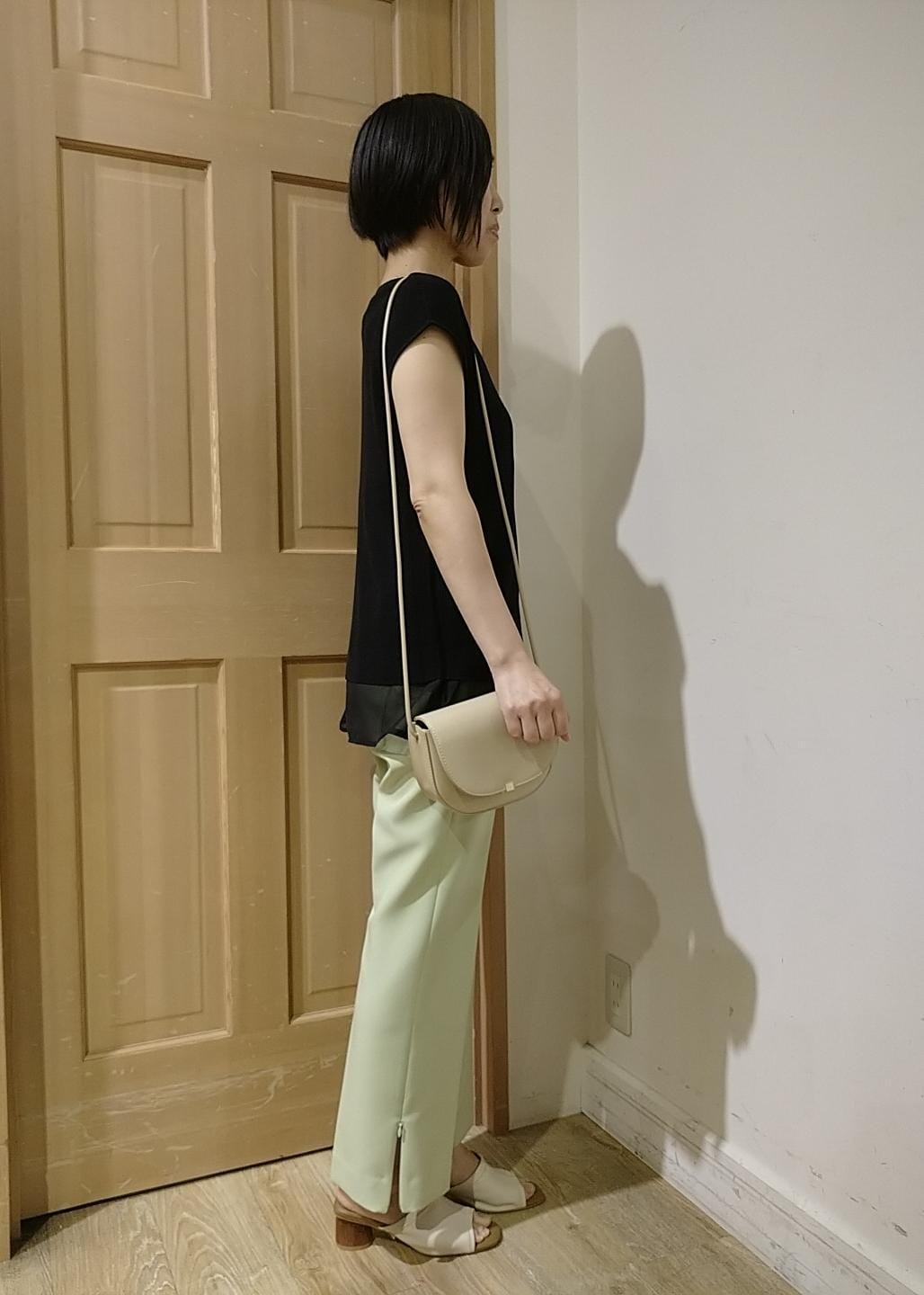トレンドのカラーパンツをシンプルな黒のノースリーブで合わせた大人コーデにしてみました。 ラインがとても綺麗でおすすめです。