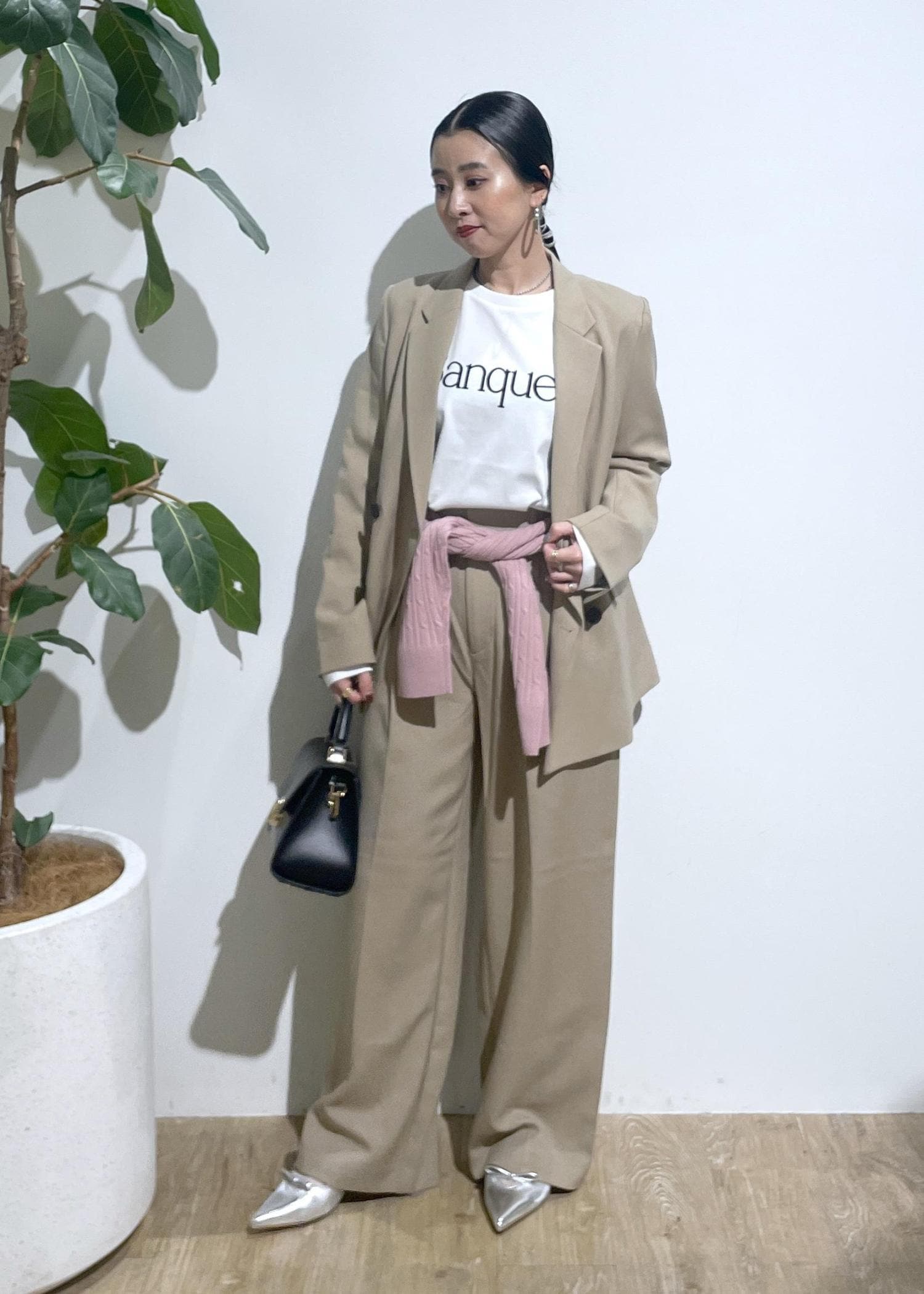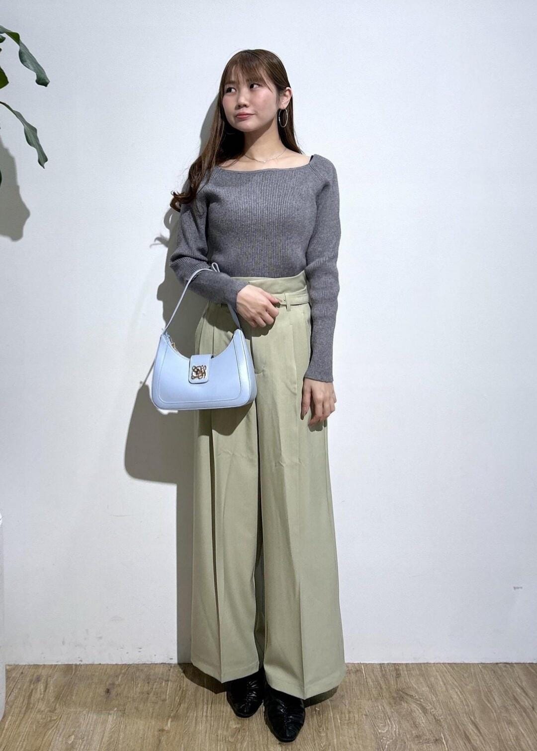 トップスのパープルが差し色にもなり華やかな印象を与えてくれます。