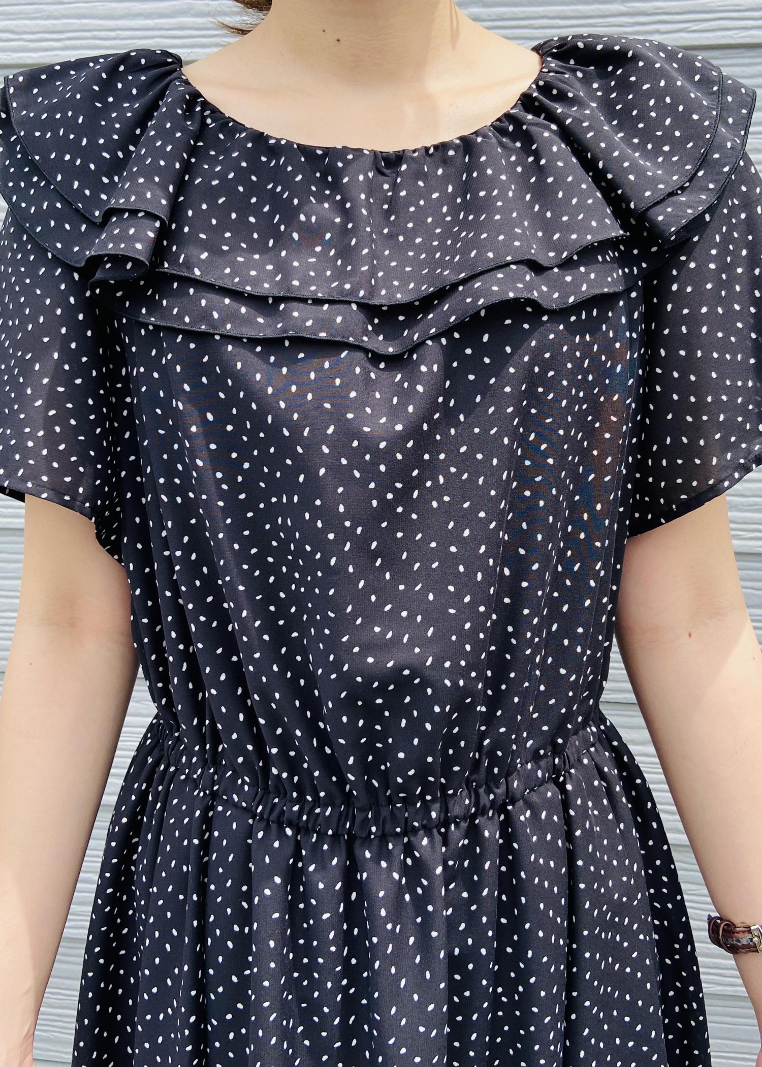 全身ブラックコーデです。ドット柄にして、足元もストラップのミュールで、重たく見えないようにしました。加えて、襟元のフリルで可愛いらしさをだしました。ウエストがゴムなので、女性らしいシルエットに魅せてくれます!